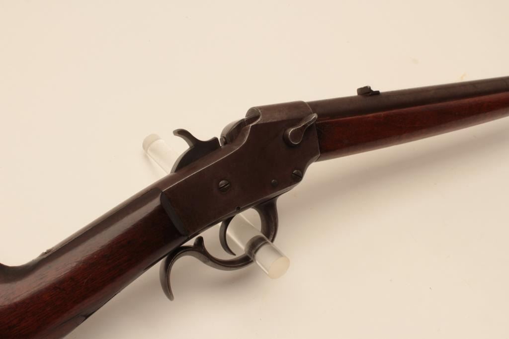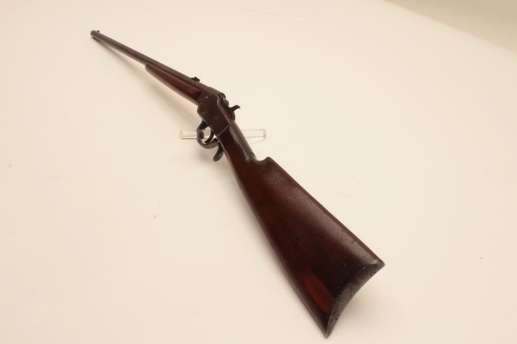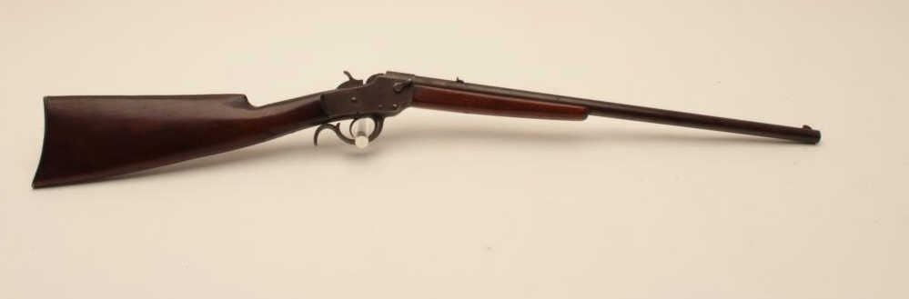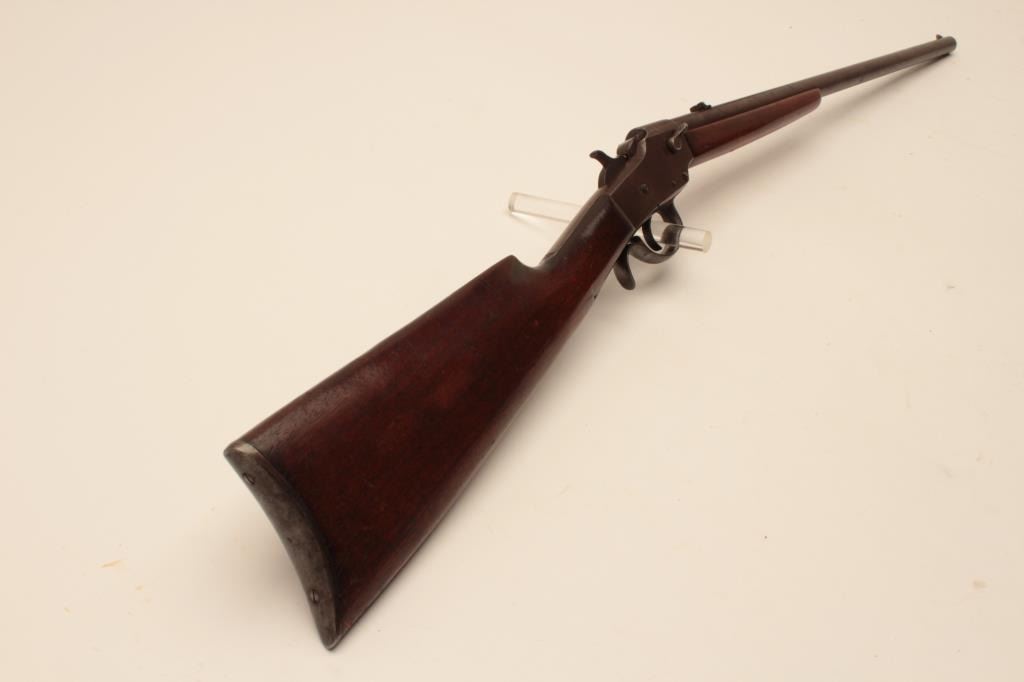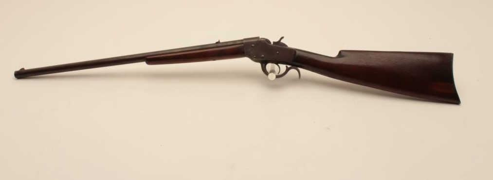 17KH-445 H&A RIFLEHopkins & Allen single shot takedown rifle, .22 caliber, wood stocks, no visible S/N, in overall good condition with dark patina to metal surfaces, decent bore, good markings and action, overall good wood stocks.(Antique). Est.: $200-$400.Hopkins & Allen single shot takedown rifle, .22 caliber, wood stocks, no visible S/N, in overall good condition with dark patina to metal surfaces, decent bore, good markings and action, overall good wood stocks.(Antique). Est.: $200-$400.