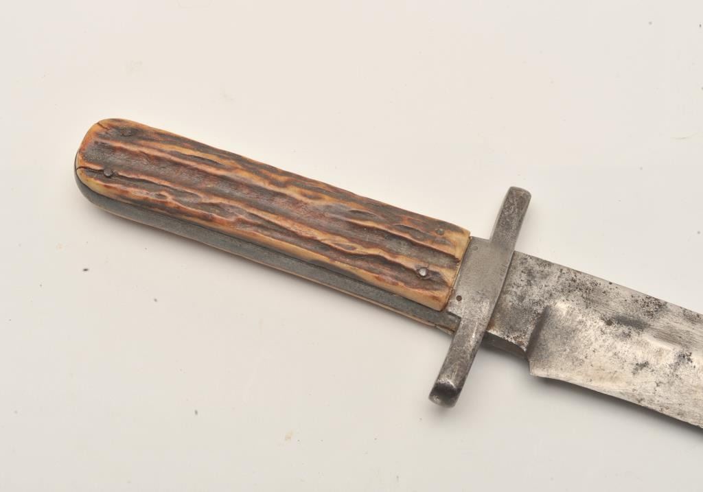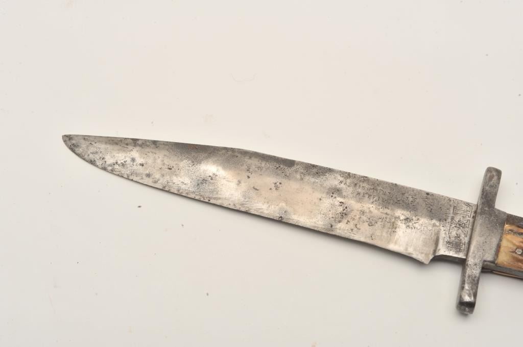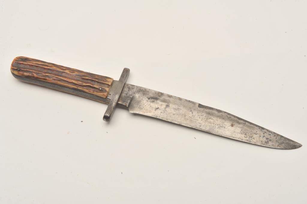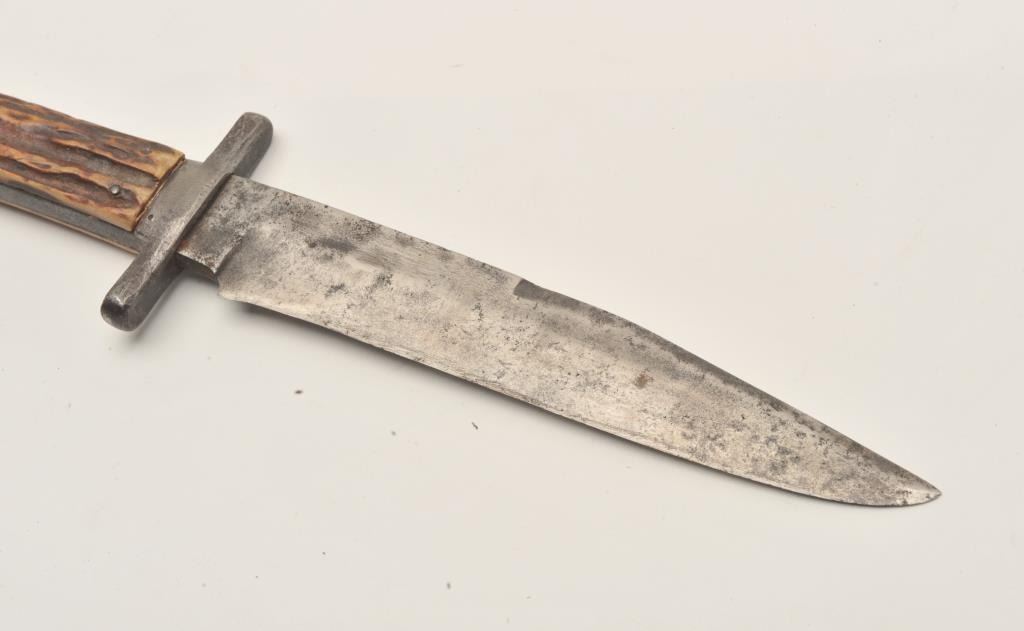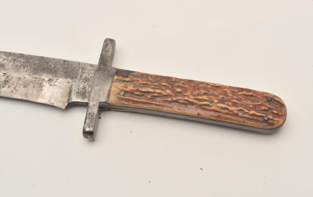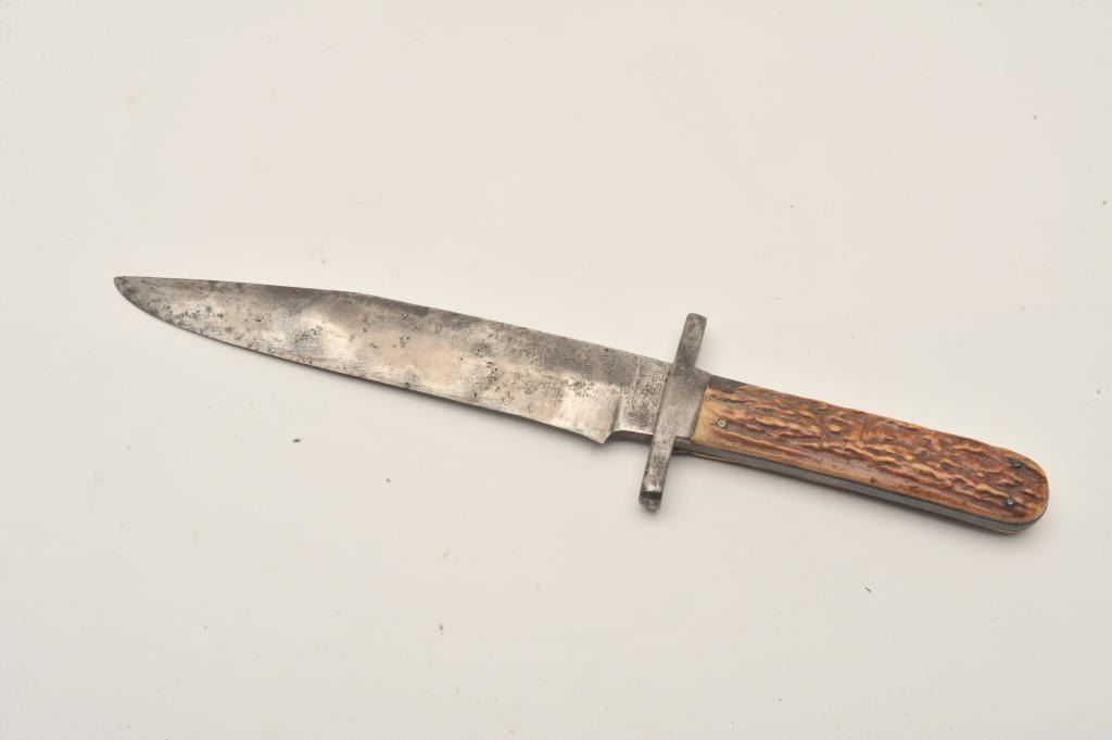 18ASS-10 IXLI*XL knife with stag grip (no sheath); approximately 12” overall with a 7” blade; left top side of blade is marked “G. Wostenholm & Son/Washington Works/Sheffield”; blade shows scattered pitting and erosion,grip is good overall with an old small chip at left top corner behind cross guard. Est.: $200-$400.I*XL knife with stag grip (no sheath); approximately 12” overall with a 7” blade; left top side of blade is marked “G. Wostenholm & Son/Washington Works/Sheffield”; blade shows scattered pitting and erosion,grip is good overall with an old small chip at left top corner behind cross guard. Est.: $200-$400.