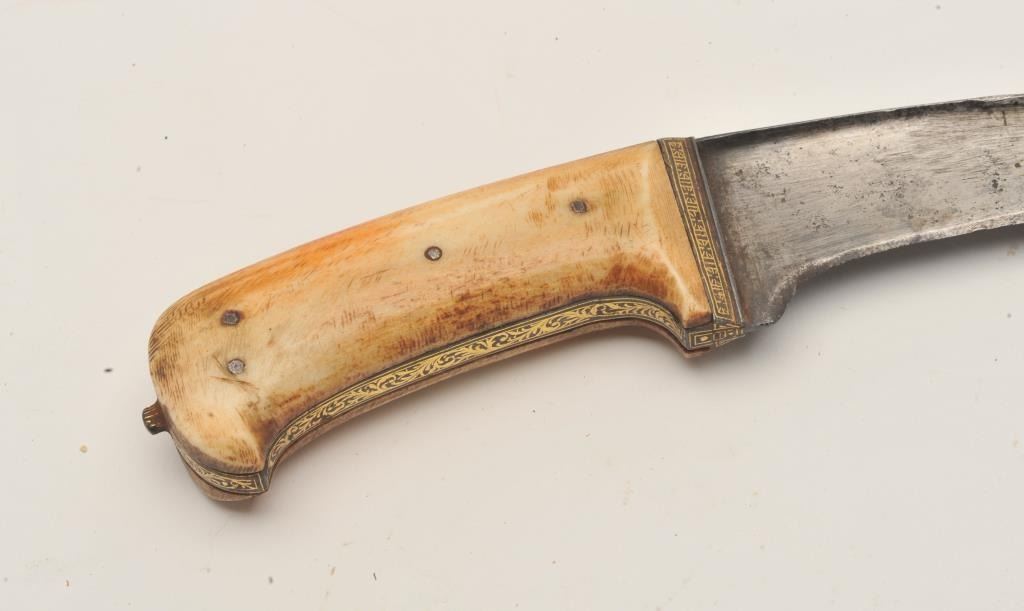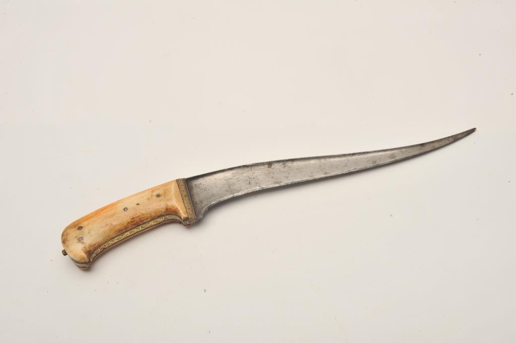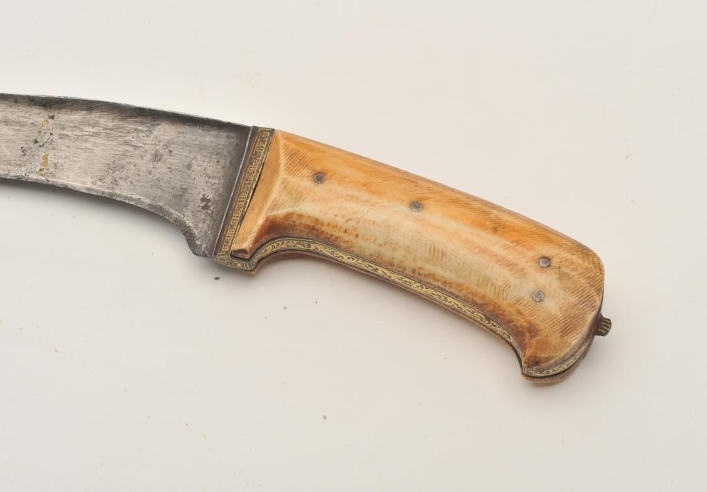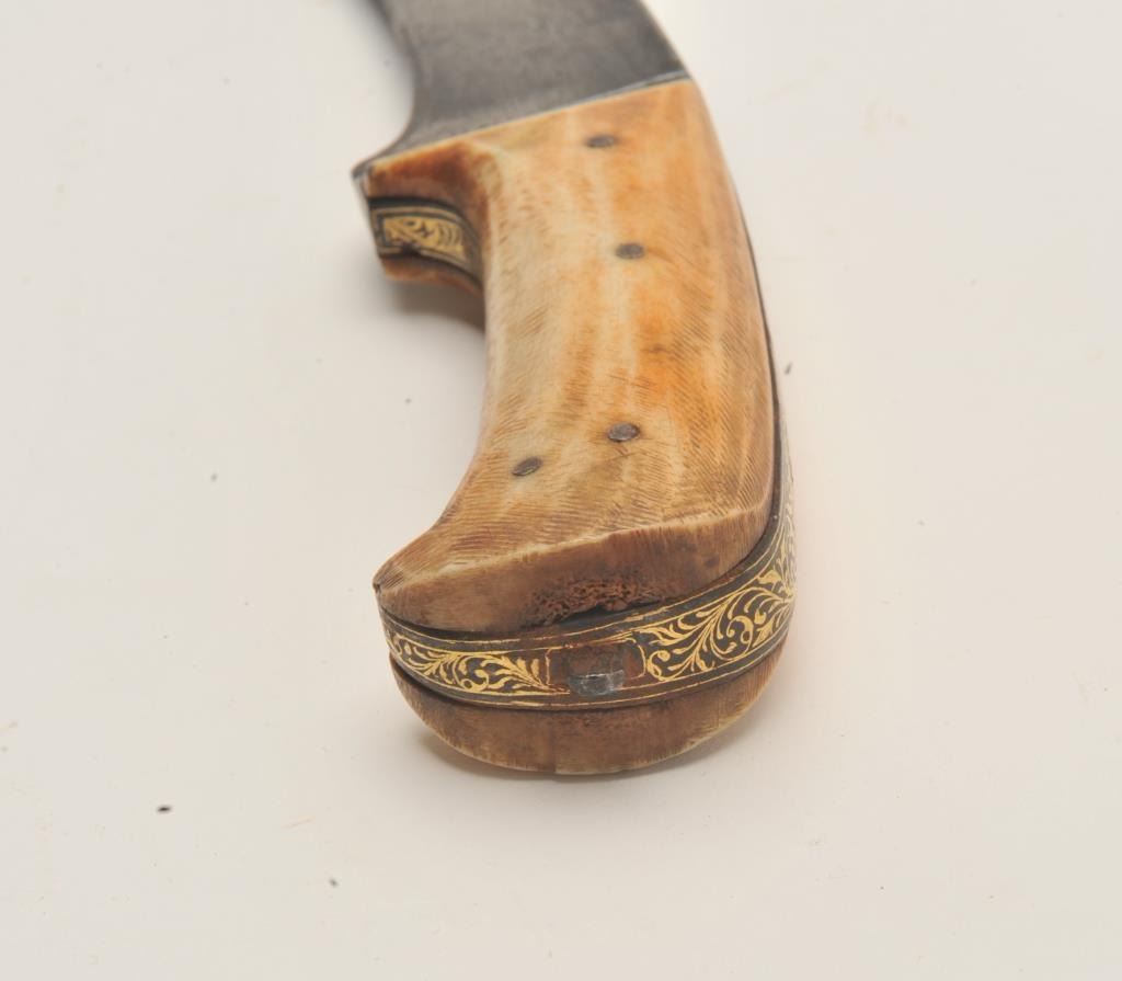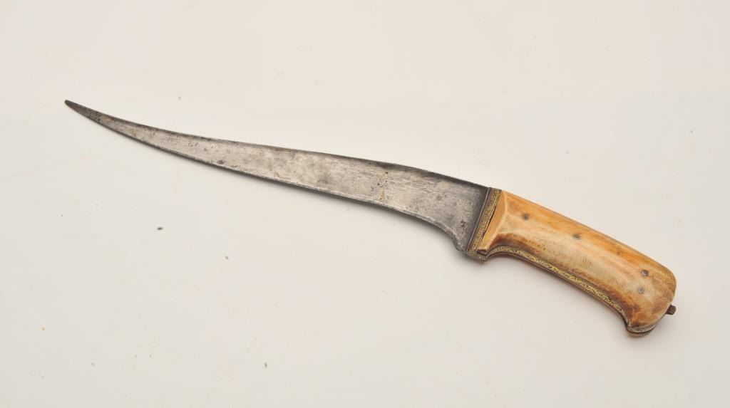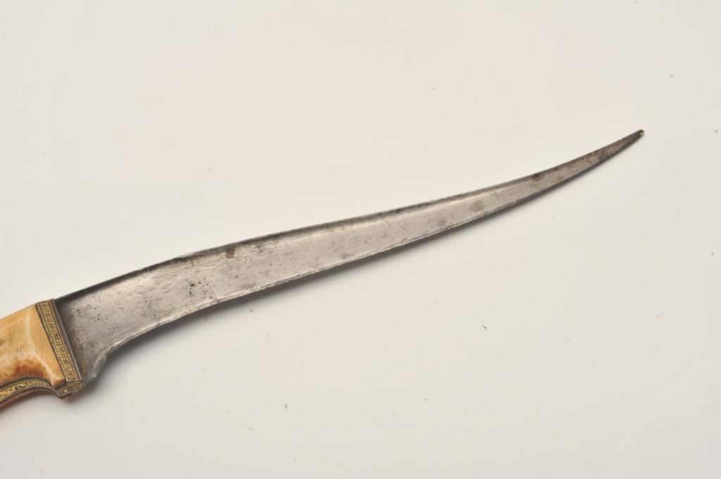 18ASS-15 MID EASTERN DAGGERMid-Eastern dagger with bone grip, approximately 16” overall with an 11” curved blade; fancy gold decoration of grip frame. Est.: $300-$600.Mid-Eastern dagger with bone grip, approximately 16” overall with an 11” curved blade; fancy gold decoration of grip frame. Est.: $300-$600.