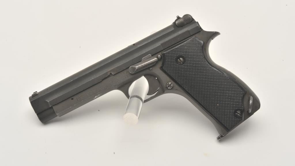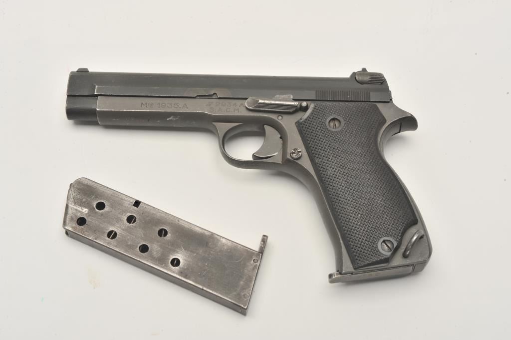 17MH-6 FRENCH MAS #2934AFrench MAS Model 1935A semi-automatic pistol, 7.65mm caliber, military finish, import-marked, checkered black grips, S/N 2934A with one extra magazine; in overall good condition with majority of finish, goodbore, action, markings and grips. (C&R/PPT). Est.: $175-$350.French MAS Model 1935A semi-automatic pistol, 7.65mm caliber, military finish, import-marked, checkered black grips, S/N 2934A with one extra magazine; in overall good condition with majority of finish, goodbore, action, markings and grips. (C&R/PPT). Est.: $175-$350.