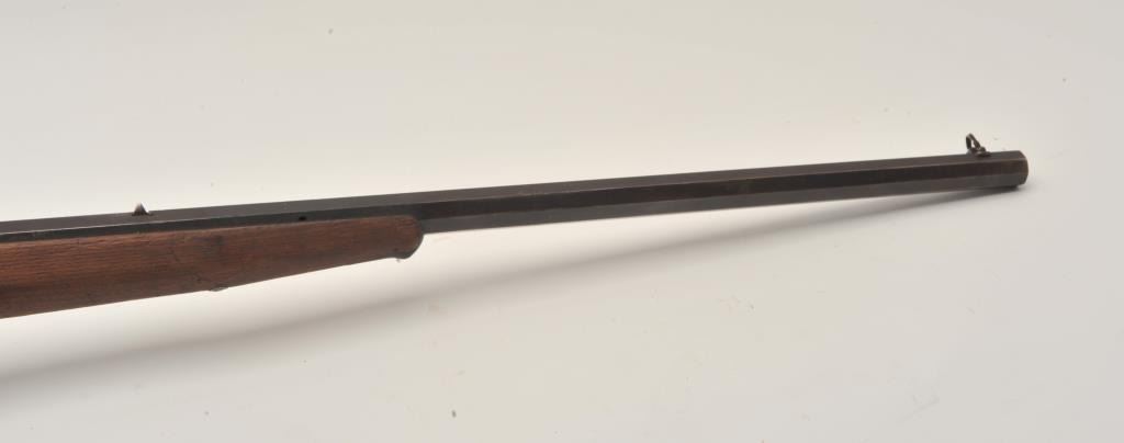 17ML-4 WINCHESTER 1885 #92440Winchester Model 1885 Lo-Wall single shot rifle, .22 Short caliber, Serial #92440. The rifle is in good overall condition with a 24” octagon barrel with a flip-up front and old replacement rear sights. The barrel hastaken on a brown patina with light surface rust and some small dents along its length. The receiver is a mix of grey and brown patina with moderate surface erosion noted on the lever and a period tang sight added.The smooth wood stocks are have been sanded and are in only fair condition. The butt stock is missing a screw and is loose; the butt ends with a smooth steel crescent butt plate. The bore is poor with significantpitting; the action functions and markings are legible. Est.: $250-$500. (C+R).Winchester Model 1885 Lo-Wall single shot rifle, .22 Short caliber, Serial #92440. The rifle is in good overall condition with a 24” octagon barrel with a flip-up front and old replacement rear sights. The barrel hastaken on a brown patina with light surface rust and some small dents along its length. The receiver is a mix of grey and brown patina with moderate surface erosion noted on the lever and a period tang sight added.The smooth wood stocks are have been sanded and are in only fair condition. The butt stock is missing a screw and is loose; the butt ends with a smooth steel crescent butt plate. The bore is poor with significantpitting; the action functions and markings are legible. Est.: $250-$500. (C+R).