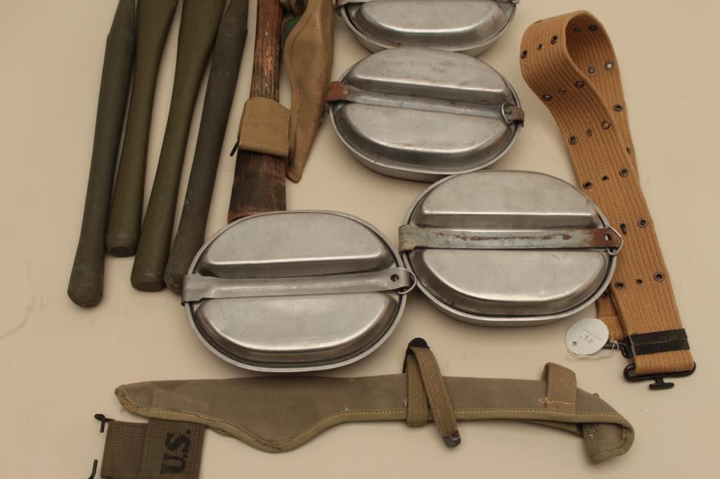 17JL-22 MILITARY GEARMisc. military gear lot including mess kits, tent stakes, entrenching tool, web gear, etc. Est.: $125-$250.Misc. military gear lot including mess kits, tent stakes, entrenching tool, web gear, etc. Est.: $125-$250.