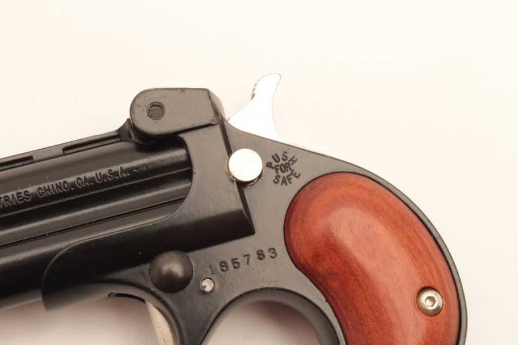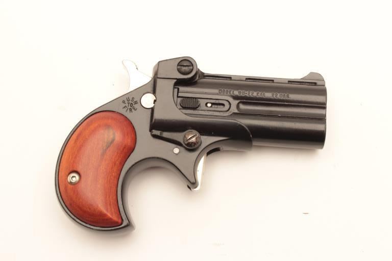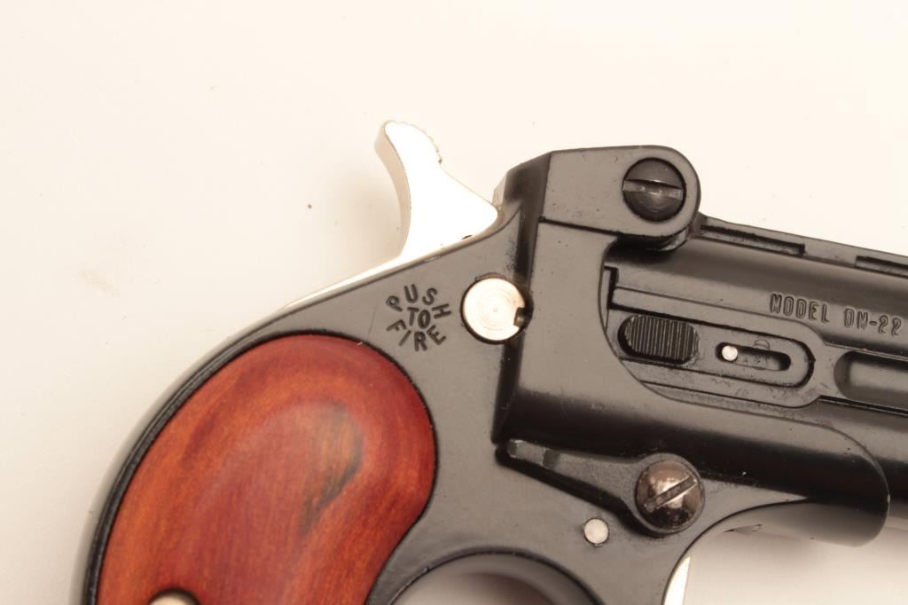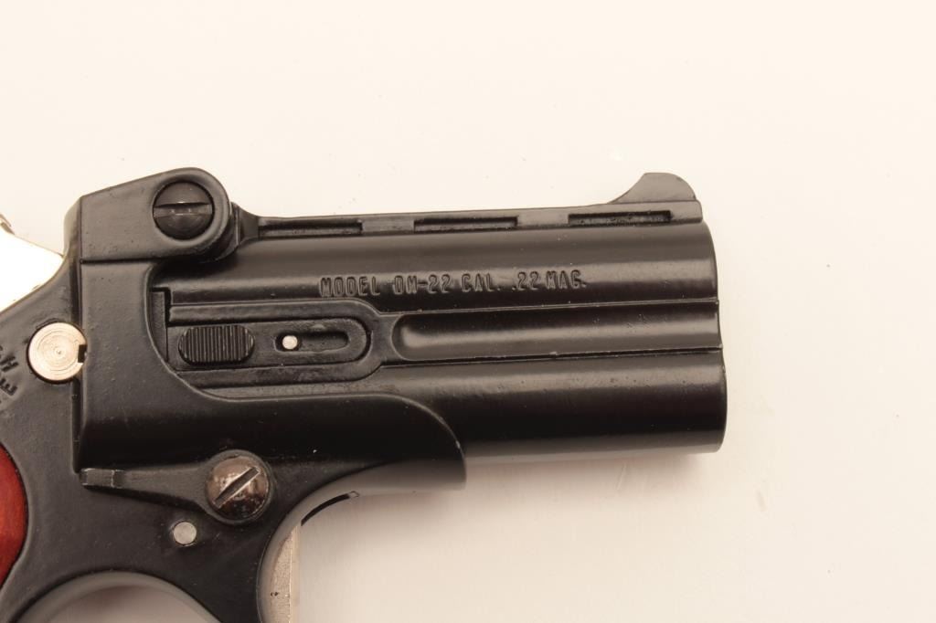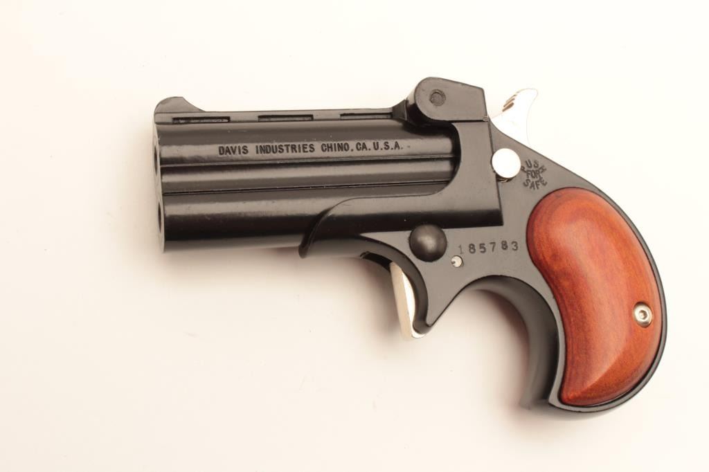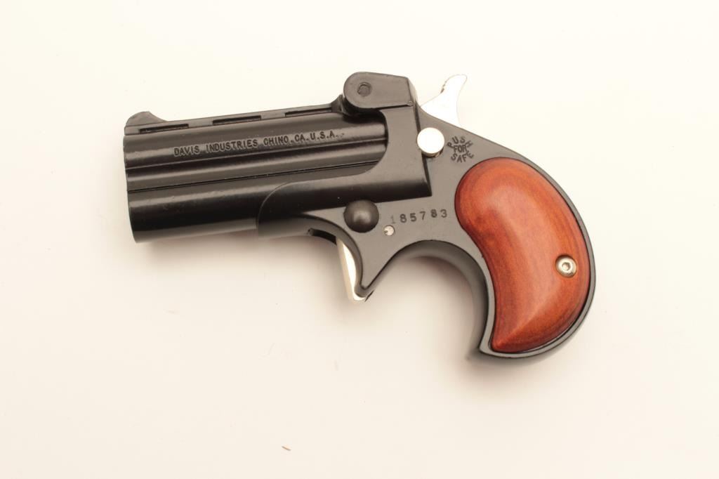 17KH-107 DERRINGERDavis Industries DM-22 .22 cal. derringer, #185783, 2 3/8" barrel, black finish with wood grips. Pistol is in fine condition overall, retaining approximately 95% original finish, minty bores, good action. (Modern / PPT) Est. $100-200Davis Industries DM-22 .22 cal. derringer, #185783, 2 3/8" barrel, black finish with wood grips. Pistol is in fine condition overall, retaining approximately 95% original finish, minty bores, good action. (Modern / PPT) Est. $100-200