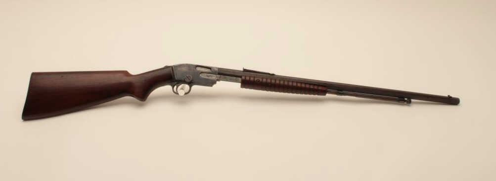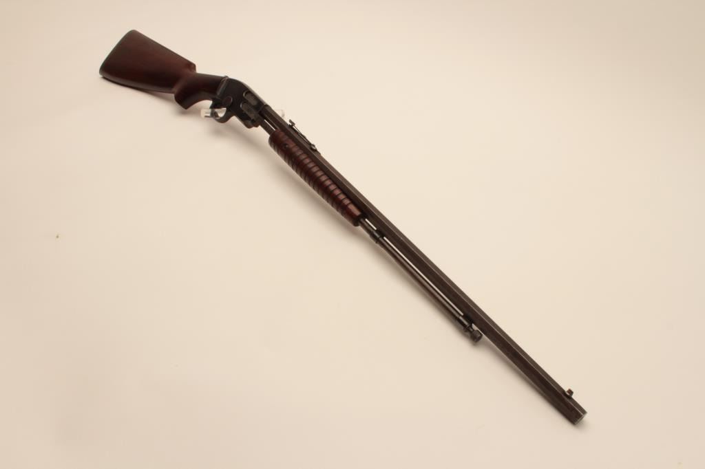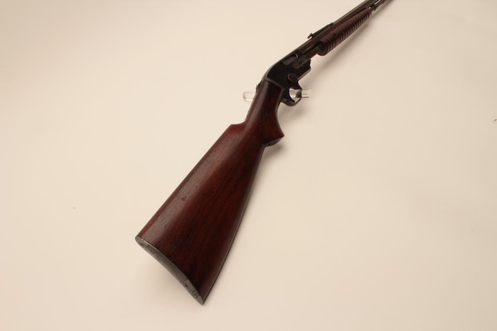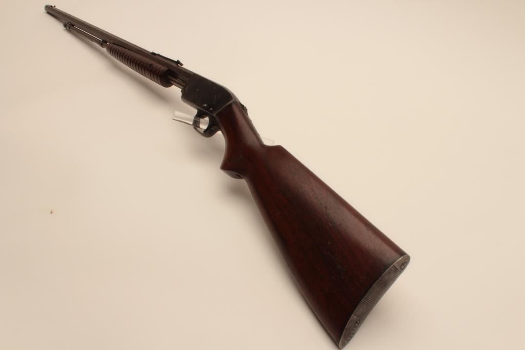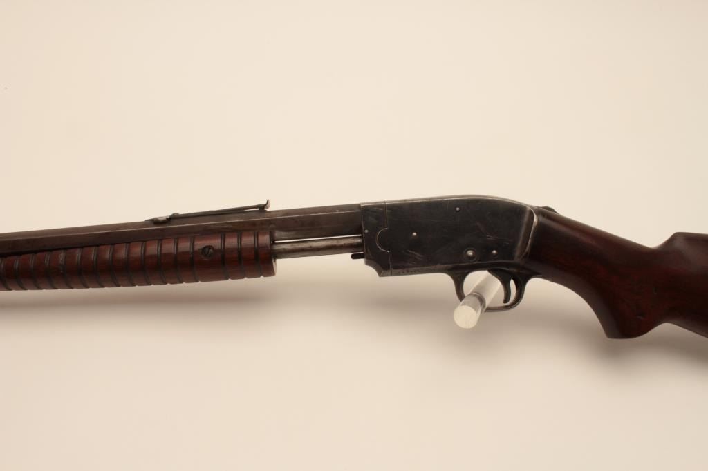 17KH-521 SAVAGE 1914 #14018Savage Model 1914 pump action rifle, .22 short, long and LR caliber, blued finish, wood stocks, S/N 14018, in overall good condition with considerable original blue on receiver and brown patina to barrel; goodbore, crisp action, good markings and good + wood. (C&R/PPT). Est.: $150-$300.Savage Model 1914 pump action rifle, .22 short, long and LR caliber, blued finish, wood stocks, S/N 14018, in overall good condition with considerable original blue on receiver and brown patina to barrel; goodbore, crisp action, good markings and good + wood. (C&R/PPT). Est.: $150-$300.