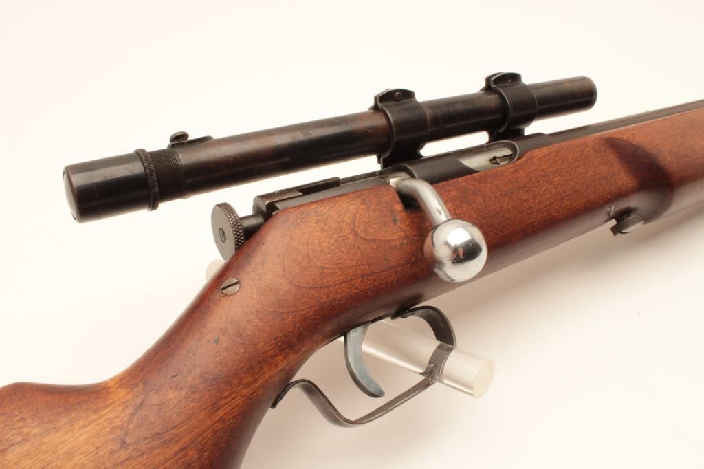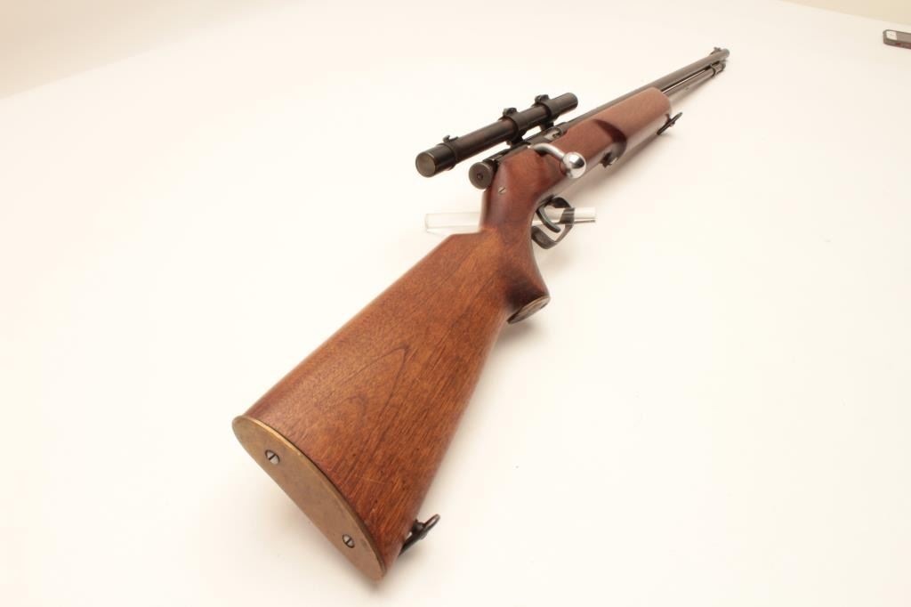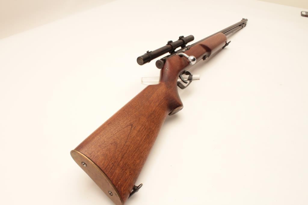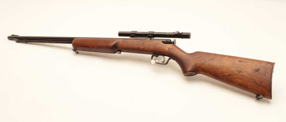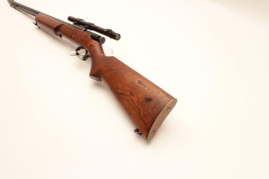 17KH-555 MOSSBERGMossberg Model 44 bolt action rifle, .22LR caliber, blued finish, wood stock, no visible S/N, in overall good condition with a good bore, crisp action, good markings, majority of muted blued finish, wood stock with brasssemi-pistol grip cap inscribed “R + H” and an arrow thru a heart; mounted with a scope displaying good optics. (Modern/PPT). Est.: $100-$200.Mossberg Model 44 bolt action rifle, .22LR caliber, blued finish, wood stock, no visible S/N, in overall good condition with a good bore, crisp action, good markings, majority of muted blued finish, wood stock with brasssemi-pistol grip cap inscribed “R + H” and an arrow thru a heart; mounted with a scope displaying good optics. (Modern/PPT). Est.: $100-$200.