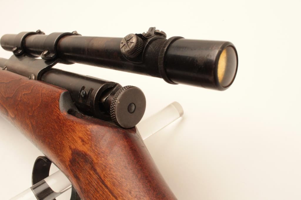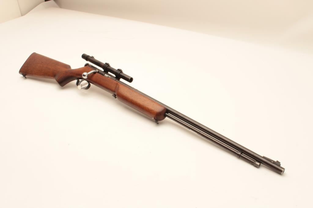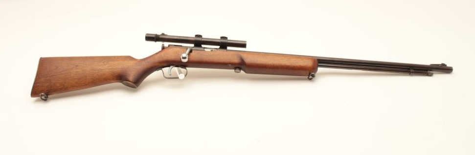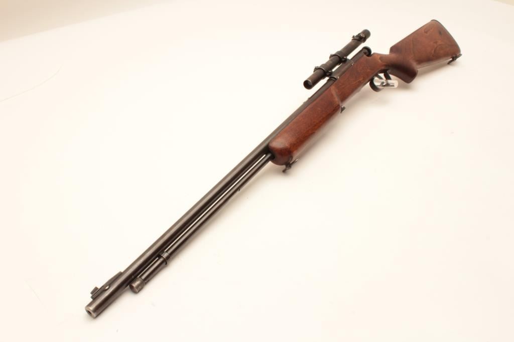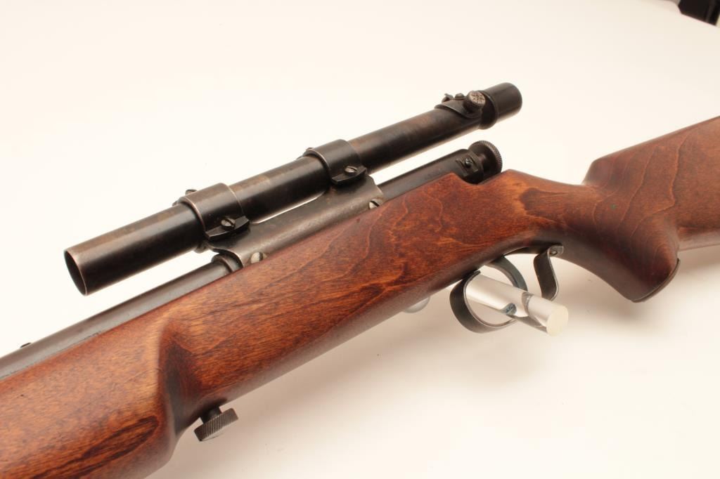 17KH-555 MOSSBERGMossberg Model 44 bolt action rifle, .22LR caliber, blued finish, wood stock, no visible S/N, in overall good condition with a good bore, crisp action, good markings, majority of muted blued finish, wood stock with brasssemi-pistol grip cap inscribed “R + H” and an arrow thru a heart; mounted with a scope displaying good optics. (Modern/PPT). Est.: $100-$200.Mossberg Model 44 bolt action rifle, .22LR caliber, blued finish, wood stock, no visible S/N, in overall good condition with a good bore, crisp action, good markings, majority of muted blued finish, wood stock with brasssemi-pistol grip cap inscribed “R + H” and an arrow thru a heart; mounted with a scope displaying good optics. (Modern/PPT). Est.: $100-$200.