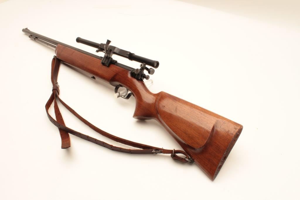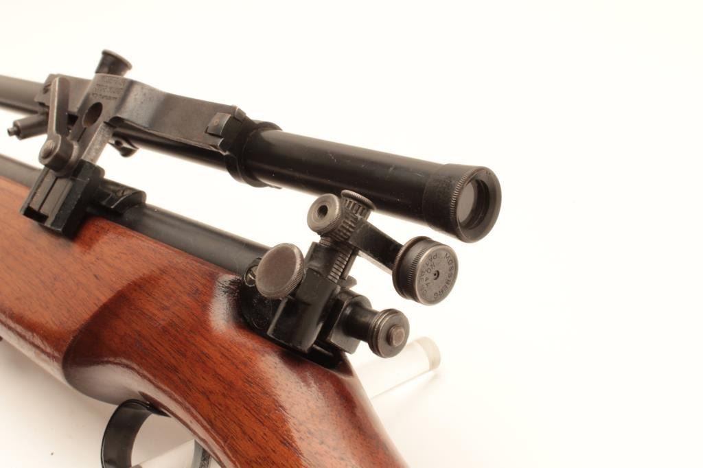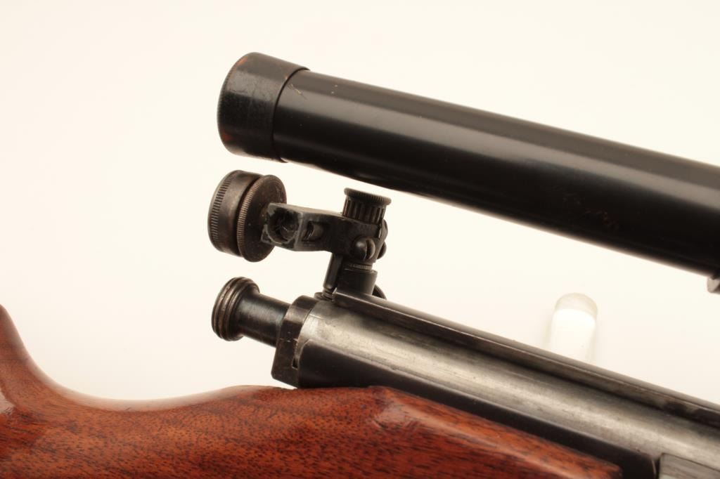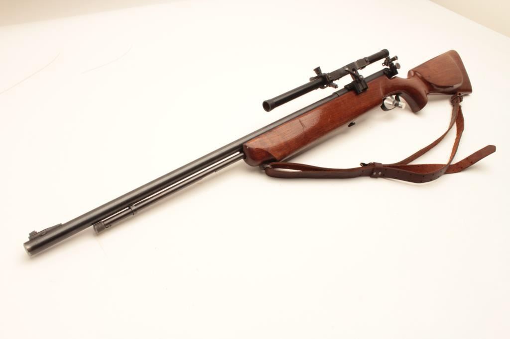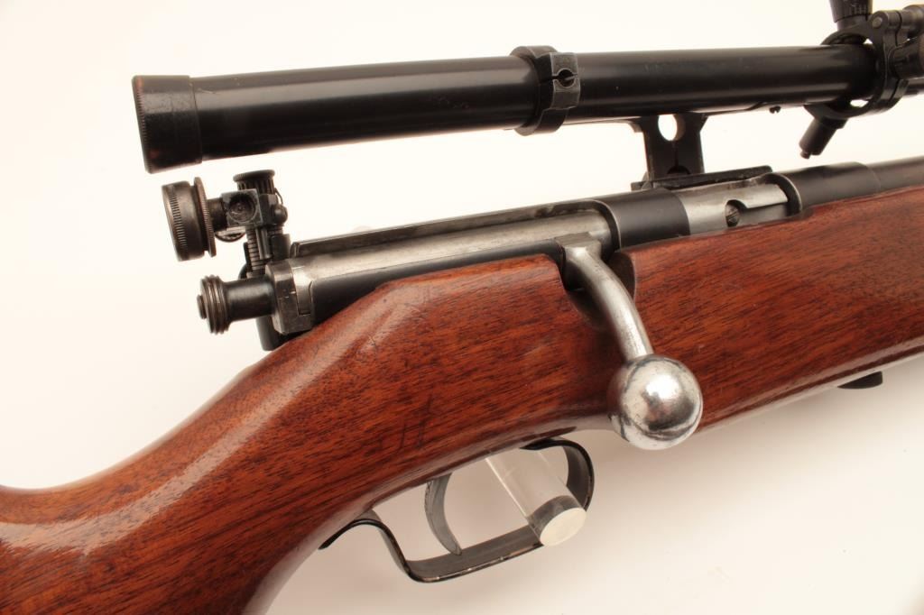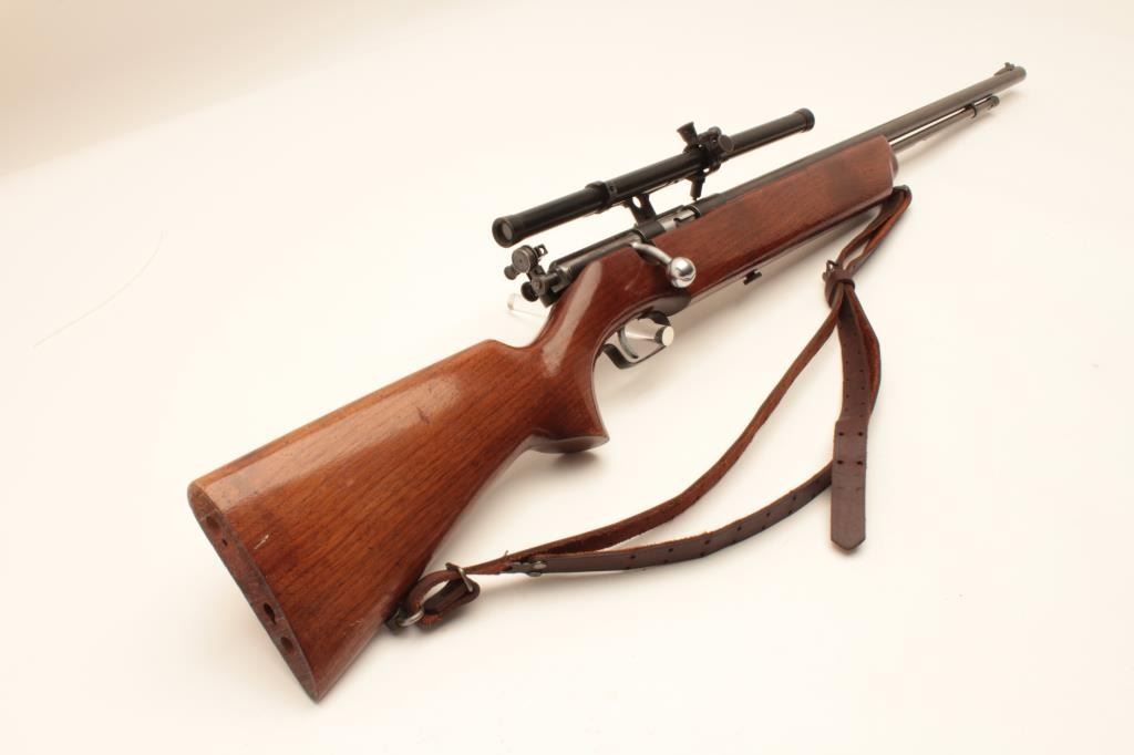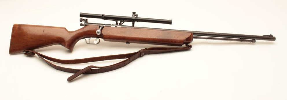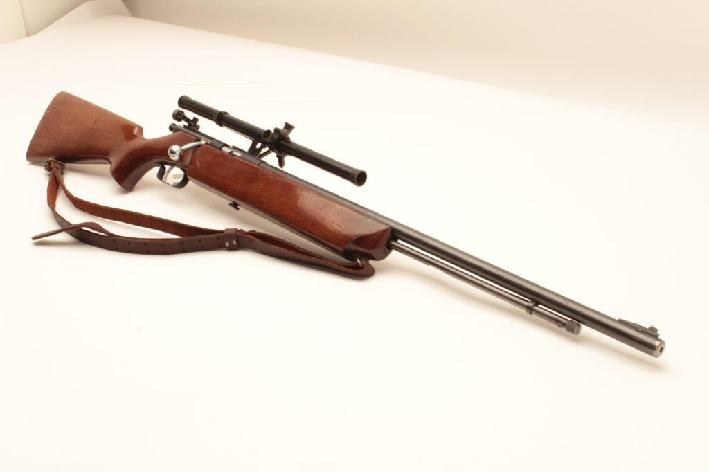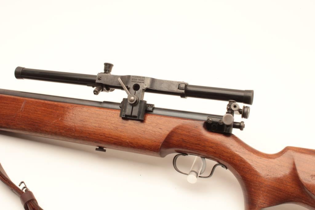 17KH-558 MOSSBERG 46Mossberg Model 46 Target bolt action rifle, .22 short, long and LR caliber, blued finish, wood stock (missing butt plate), leather sling, no visible S/N, mounted with a #6 scope & mount; overall good condition withmajority of blued finish remaining, good bore, crisp action, sharp markings and good stock. (C&R/PPT). Est.: $200-$400.Mossberg Model 46 Target bolt action rifle, .22 short, long and LR caliber, blued finish, wood stock (missing butt plate), leather sling, no visible S/N, mounted with a #6 scope & mount; overall good condition withmajority of blued finish remaining, good bore, crisp action, sharp markings and good stock. (C&R/PPT). Est.: $200-$400.