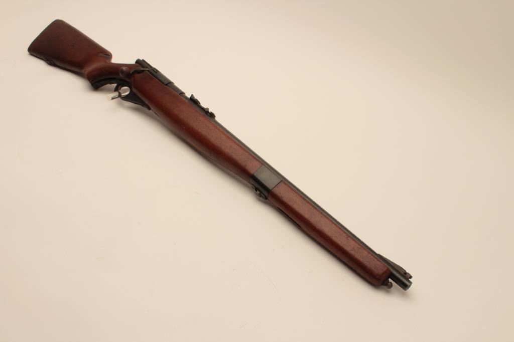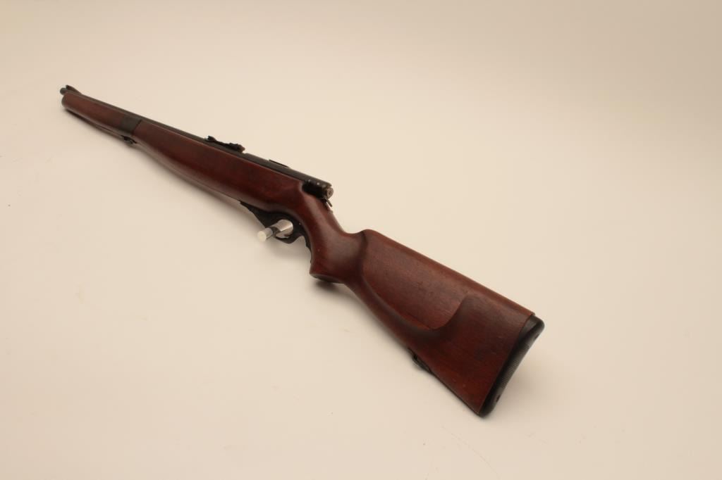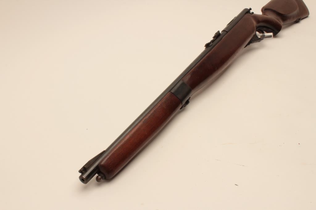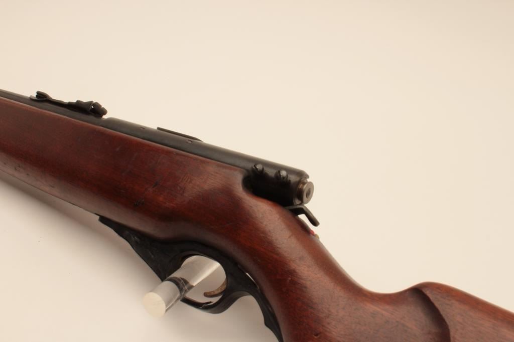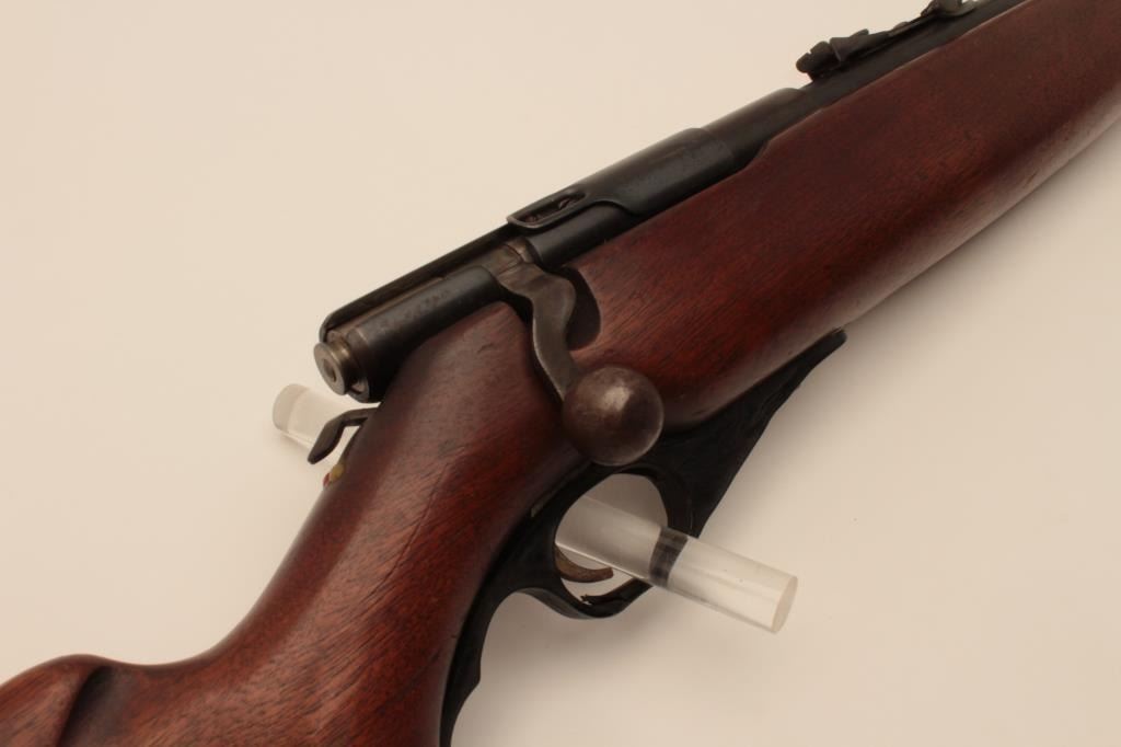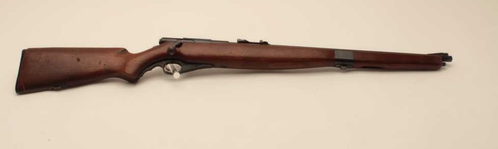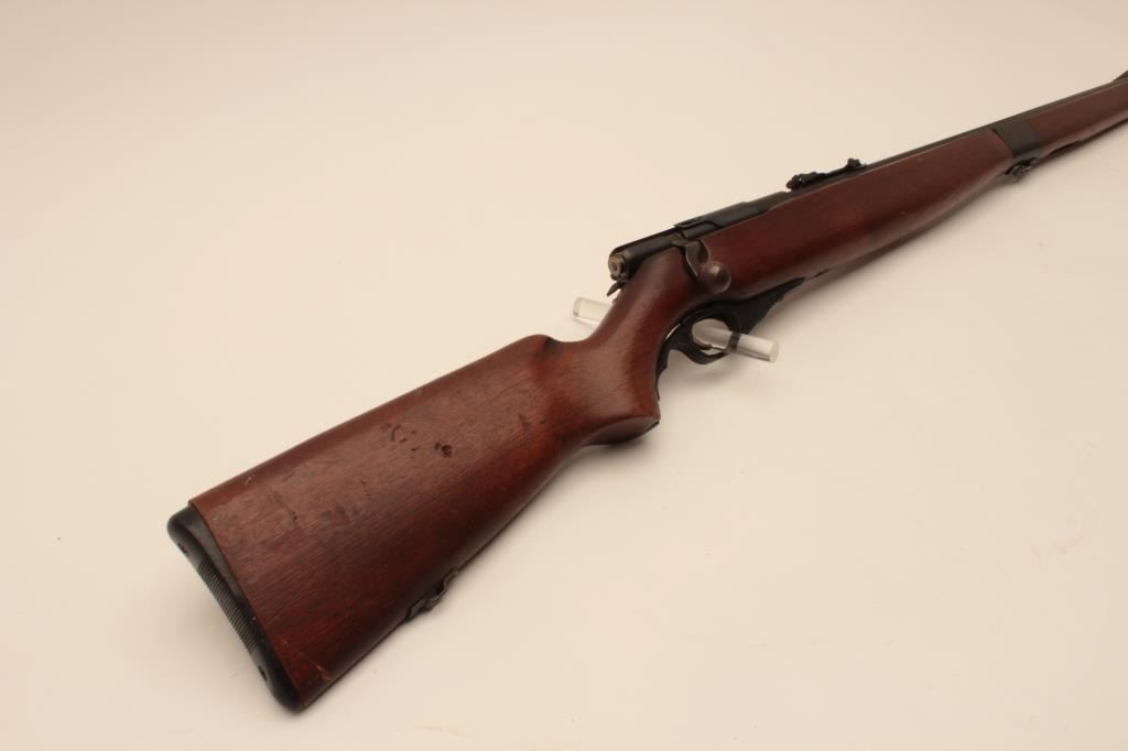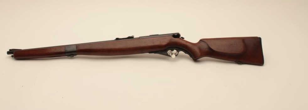 17KH-577 MOSSBERG 46MMossberg Model 46M bolt action rifle, .22 short, long and LR caliber, blued finish, wood stock, no visible S/N, in overall fair to good condition with a good bore, crisp action, good markings and wood stock withsome scattered mars and scratches from carry and storage; some damage to plastic trigger guard. (Modern/PPT). Est.: $100-$200.Mossberg Model 46M bolt action rifle, .22 short, long and LR caliber, blued finish, wood stock, no visible S/N, in overall fair to good condition with a good bore, crisp action, good markings and wood stock withsome scattered mars and scratches from carry and storage; some damage to plastic trigger guard. (Modern/PPT). Est.: $100-$200.