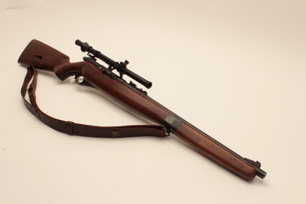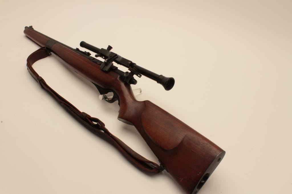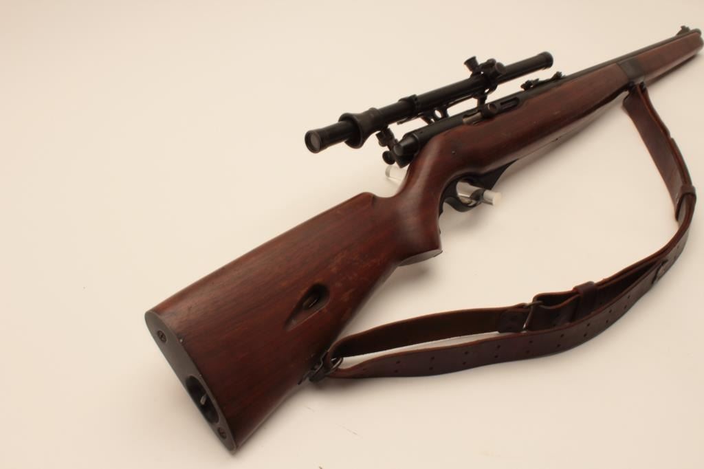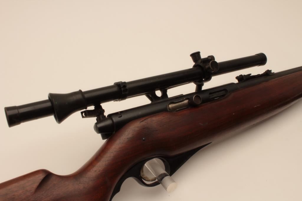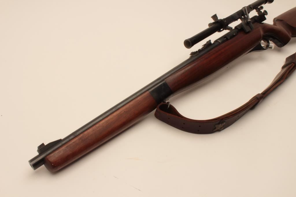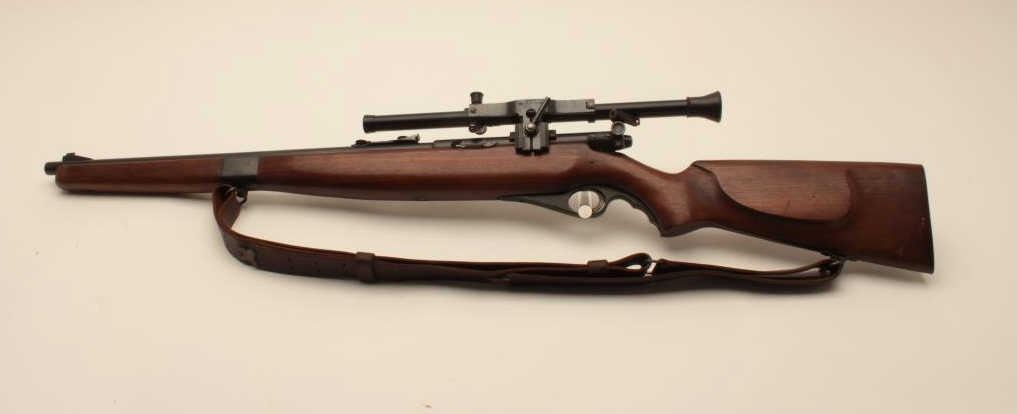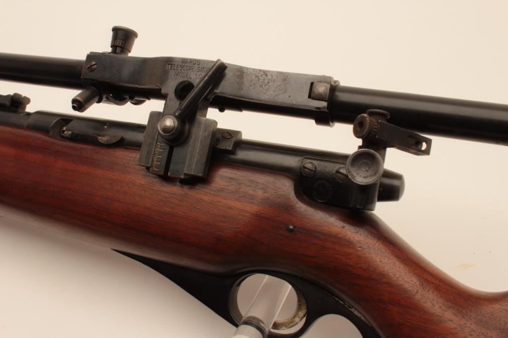 17KH-579 MOSSBERG 51Mossberg Model 51M semi-automatic rifle, .22 LR caliber, blued finish, wood stock, leather sling, no visible S/N, mounted with a Wards Model 10 scope with good optics; in overall good condition with a good bore, action,markings and stock. (Modern/PPT). Est.: $150-$300.Mossberg Model 51M semi-automatic rifle, .22 LR caliber, blued finish, wood stock, leather sling, no visible S/N, mounted with a Wards Model 10 scope with good optics; in overall good condition with a good bore, action,markings and stock. (Modern/PPT). Est.: $150-$300.