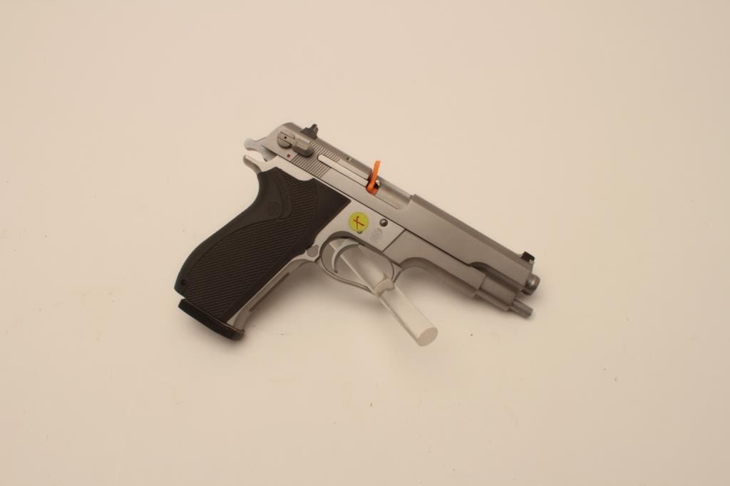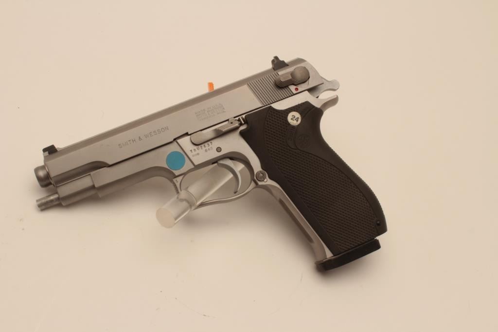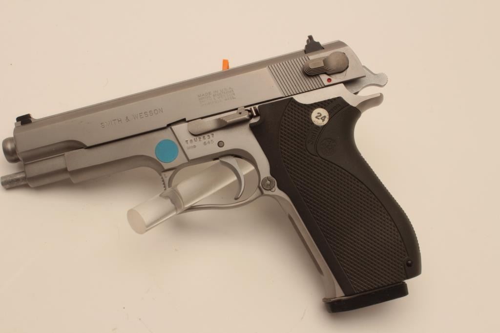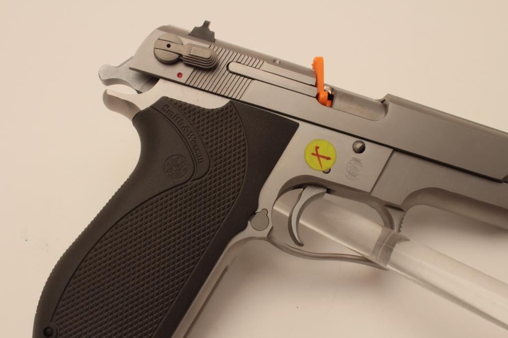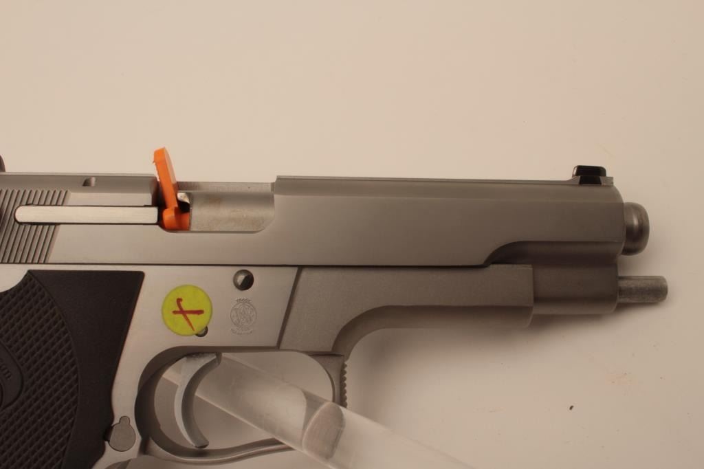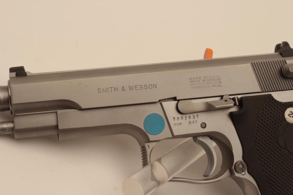 18BM-69 645 .45 SPECIALSmith & Wesson 645 stainless .45 ACP semi automatic pistol, #TBU2637, 5" barrel, ambidextrous safety, 3 dot drift adjustable sights, plastic logo grips. Pistol is in near excellent condition overall, showingjust minimal handling marks. Bore and action are excellent. Features on the box are listed as "Special" Includes original one piece box numbered to the gun in very good condition, wax paper, cleaning kit, manual,and 2 mags. (Modern / PPT) Est. $600-1200Smith & Wesson 645 stainless .45 ACP semi automatic pistol, #TBU2637, 5" barrel, ambidextrous safety, 3 dot drift adjustable sights, plastic logo grips. Pistol is in near excellent condition overall, showingjust minimal handling marks. Bore and action are excellent. Features on the box are listed as "Special" Includes original one piece box numbered to the gun in very good condition, wax paper, cleaning kit, manual,and 2 mags. (Modern / PPT) Est. $600-1200