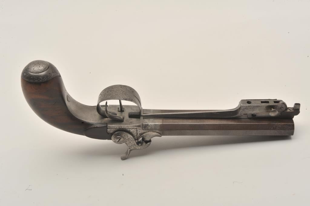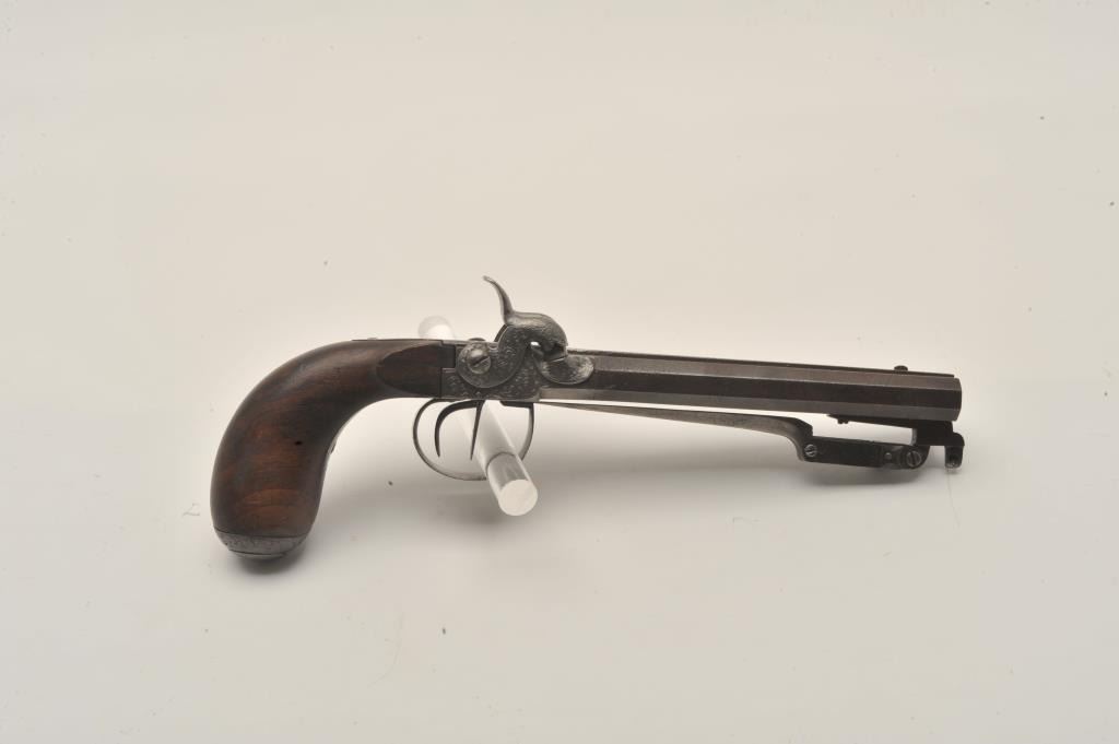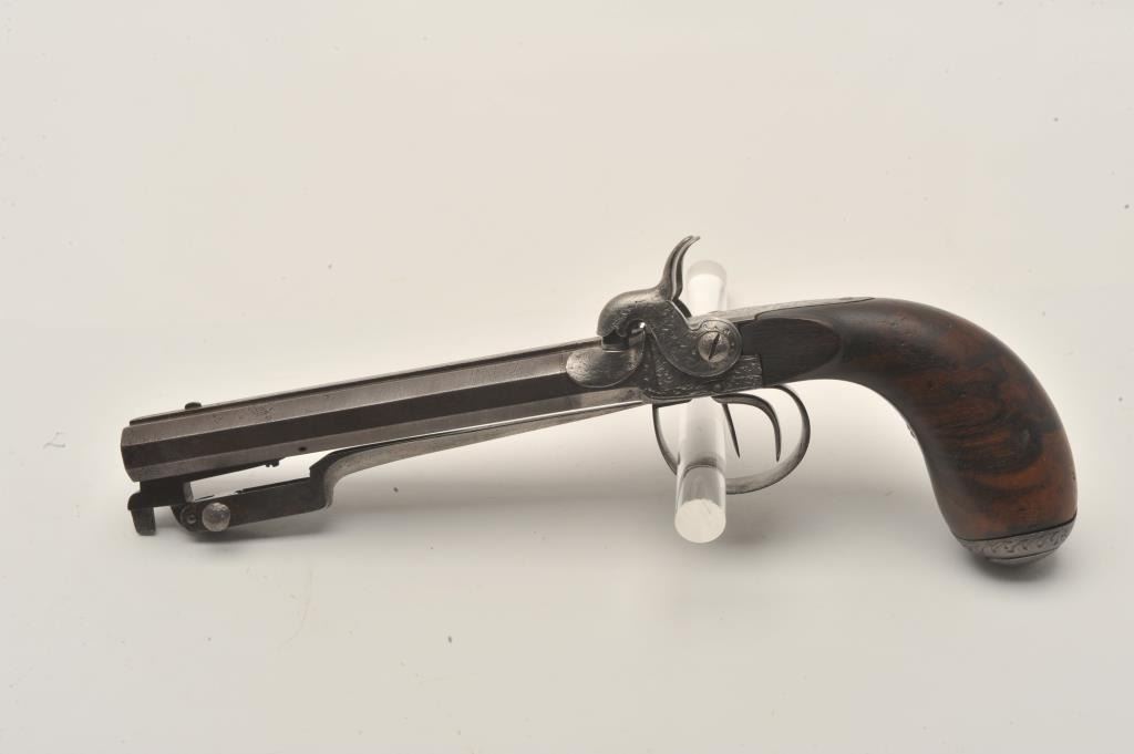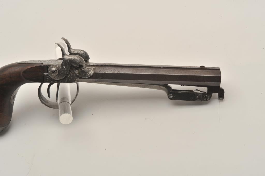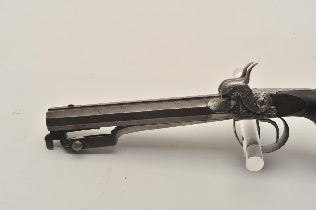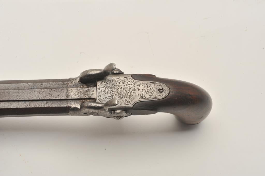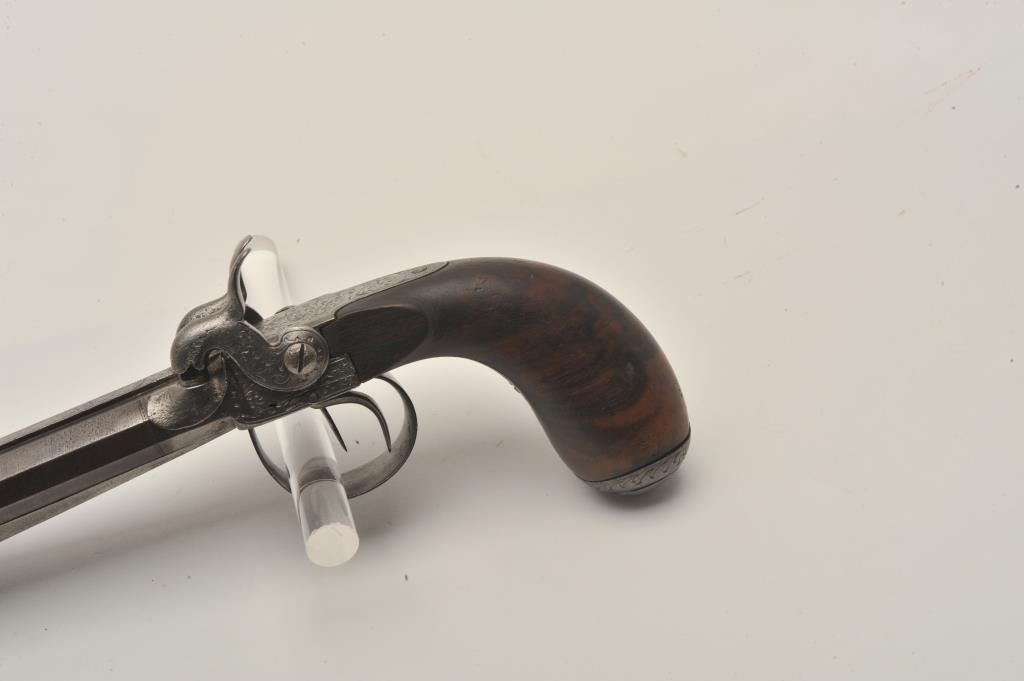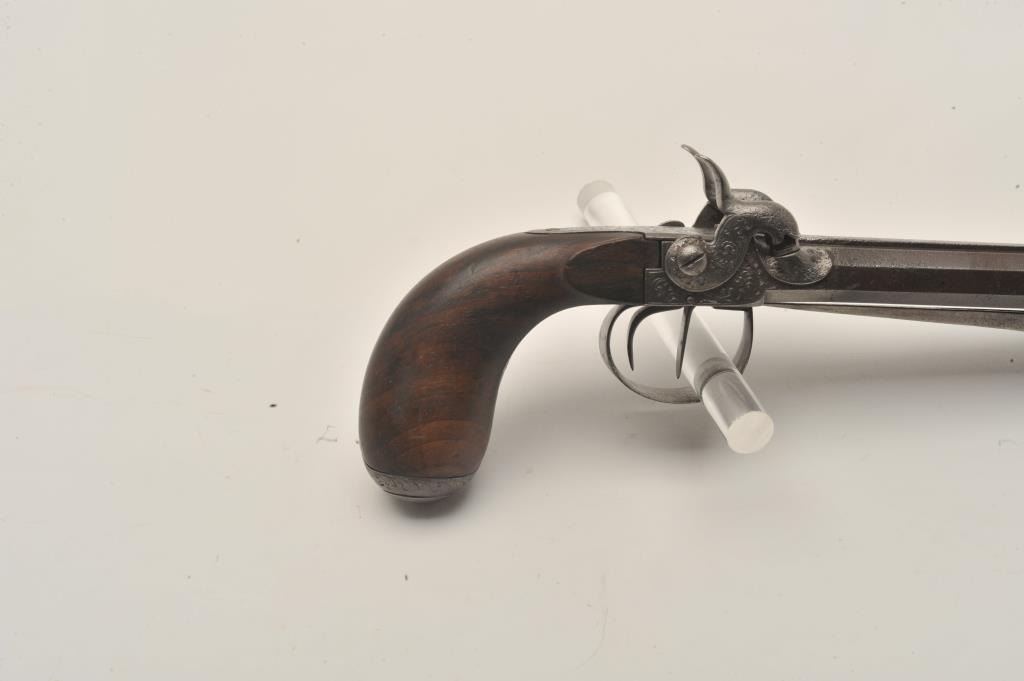 18AR-71 DOUBLE PERC BAYONETSxS percussion pistol with spring bayonet, .50 caliber, 6” octagon barrels, engraved frame, hammers, trigger guard and butt cap; overall good condition with a dark patina to barrels, good actions, good + wood grip.(Antique). Est.: $600-$1,200.SxS percussion pistol with spring bayonet, .50 caliber, 6” octagon barrels, engraved frame, hammers, trigger guard and butt cap; overall good condition with a dark patina to barrels, good actions, good + wood grip.(Antique). Est.: $600-$1,200.