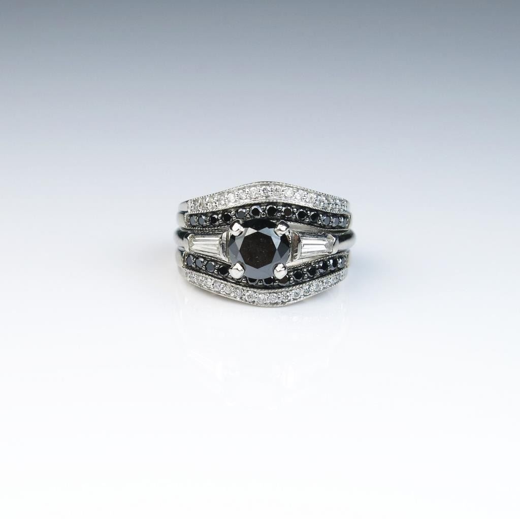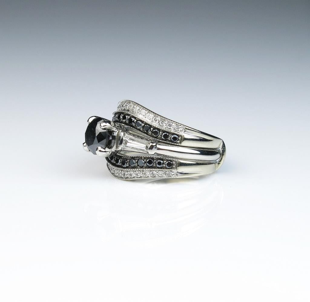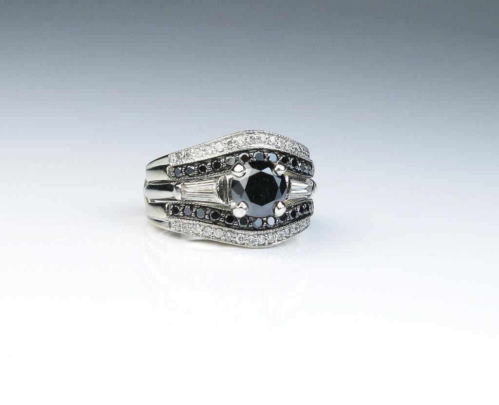 18CAI-18 BLACK DIAMOND RINGClassic Platinum 14 karat white gold wedding set featuring a round Black Diamond weighing over 1.00 carat with side baguette and 60 black and white Diamonds weighing approx. 1.00 carats of F-G colors total weight inring approx. 2.00 carats. Estimates $1,500-$2,000Classic Platinum 14 karat white gold wedding set featuring a round Black Diamond weighing over 1.00 carat with side baguette and 60 black and white Diamonds weighing approx. 1.00 carats of F-G colors total weight inring approx. 2.00 carats. Estimates $1,500-$2,000
