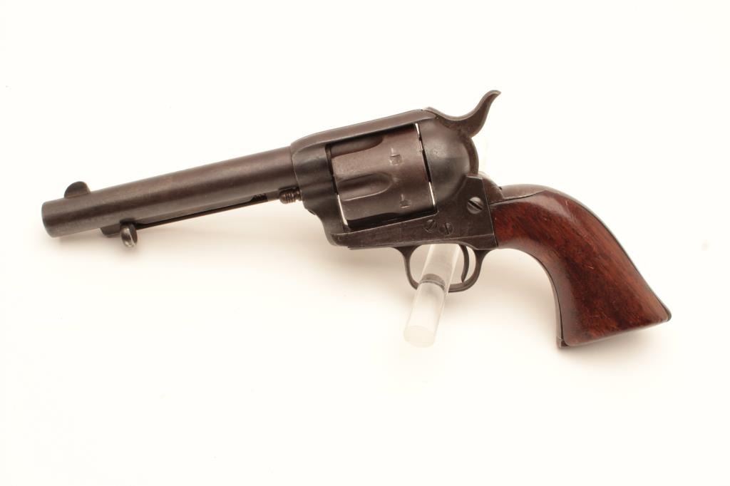 18CB-2 COLT SAA #7396Colt Single Action “Artillery” revolver with U.S. Martial markings and in Custer range, S/N 7396. All matching except barrel which is numbered 7398. Dark brown patina with some blue mixed in. Good markings with some lighterosion and pitting. The grips are slightly undersized from old refinish with chips of wood missing from each toe. Correct rod, spring and ejector housing of early style. Good action and very good bore. All correctblack powder military issue parts. The front sight reduced slightly. Kopec catalogs the artilleries with just the barrels changed in his definitive work on the subject and they are somewhat scarcer than completely mixedartillery models. We have always liked the artilleries as they saw service for almost thirty plus years many on the frontier before being returned to arsenals and re-issued in Spanish American War. (Antique) Est.:$2500-$5000Colt Single Action “Artillery” revolver with U.S. Martial markings and in Custer range, S/N 7396. All matching except barrel which is numbered 7398. Dark brown patina with some blue mixed in. Good markings with some lighterosion and pitting. The grips are slightly undersized from old refinish with chips of wood missing from each toe. Correct rod, spring and ejector housing of early style. Good action and very good bore. All correctblack powder military issue parts. The front sight reduced slightly. Kopec catalogs the artilleries with just the barrels changed in his definitive work on the subject and they are somewhat scarcer than completely mixedartillery models. We have always liked the artilleries as they saw service for almost thirty plus years many on the frontier before being returned to arsenals and re-issued in Spanish American War. (Antique) Est.:$2500-$5000