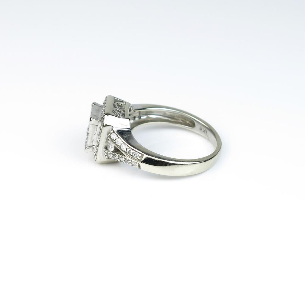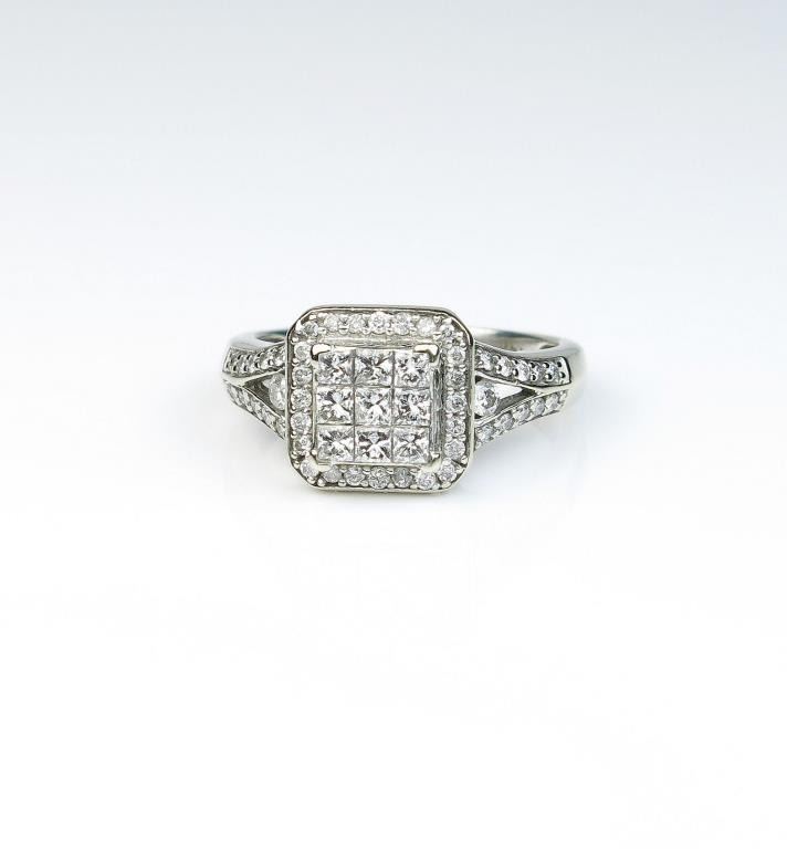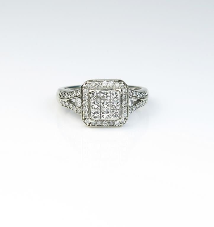 18CAI-43 DIAMOND RINGDazzling ring invisible set with six princess cut Diamonds and 46 round Diamonds with a total weight of approx. 1.00 carats of F-G colors and VS/SI clarity in 14 karat white gold setting. Estimates $1,000-$1,500Dazzling ring invisible set with six princess cut Diamonds and 46 round Diamonds with a total weight of approx. 1.00 carats of F-G colors and VS/SI clarity in 14 karat white gold setting. Estimates $1,000-$1,500