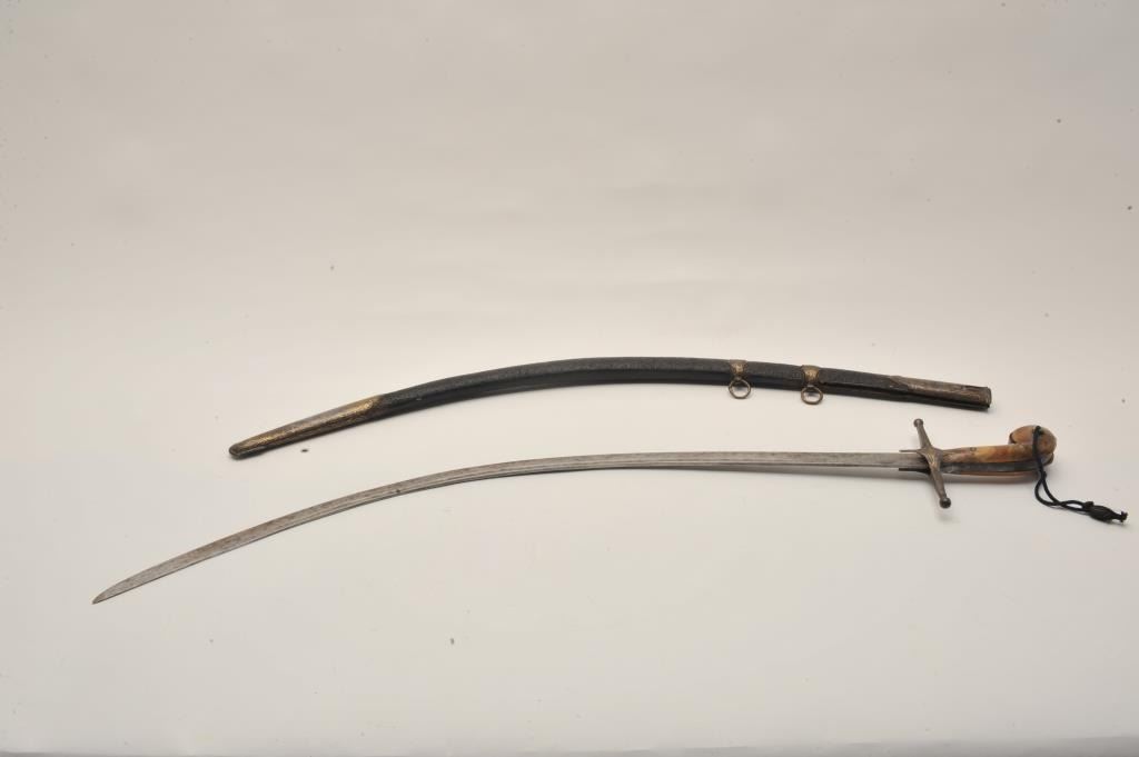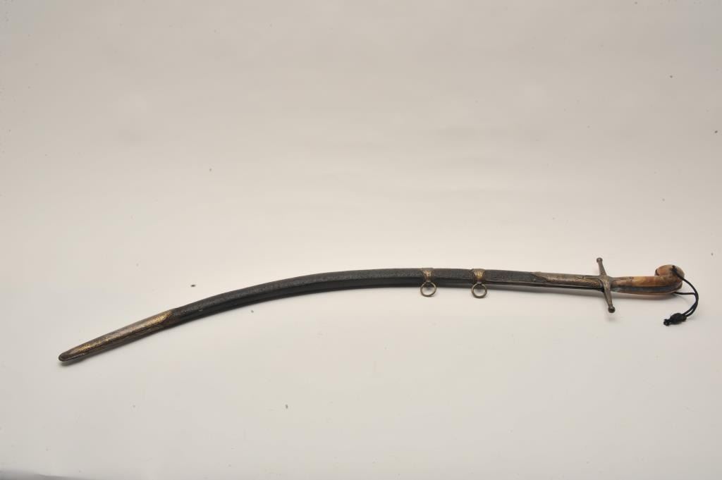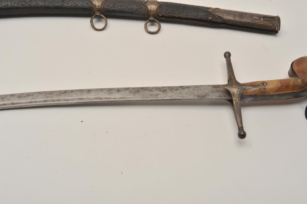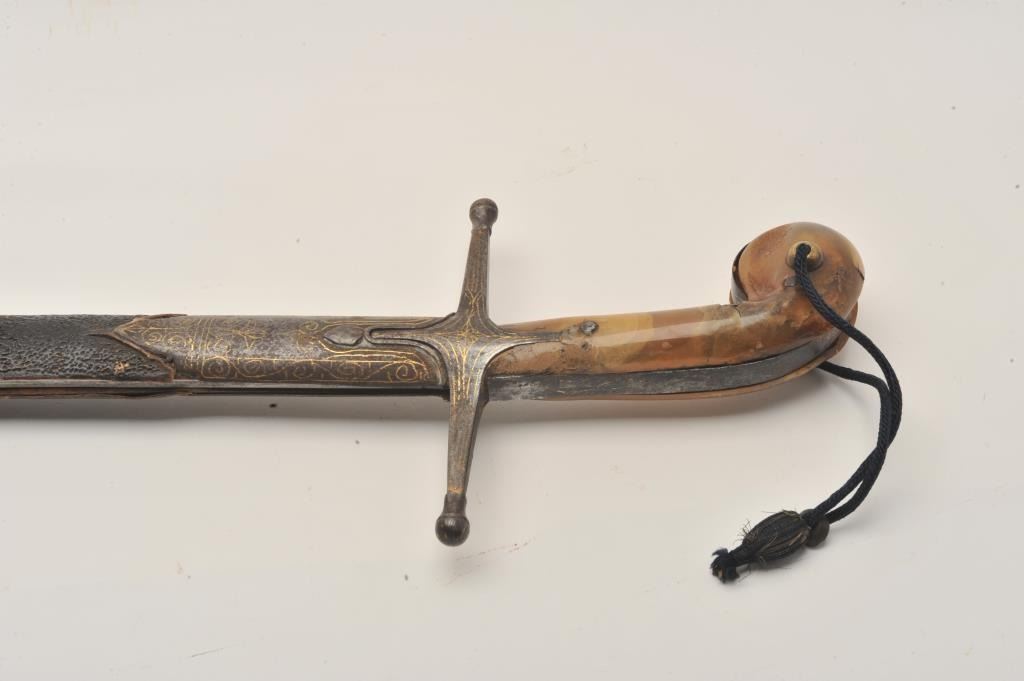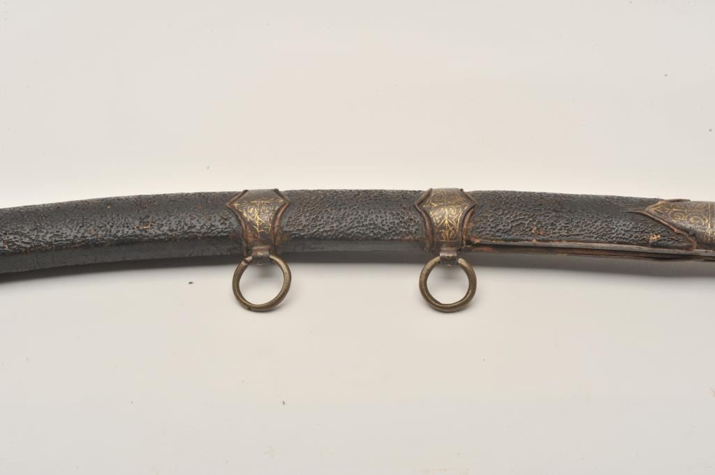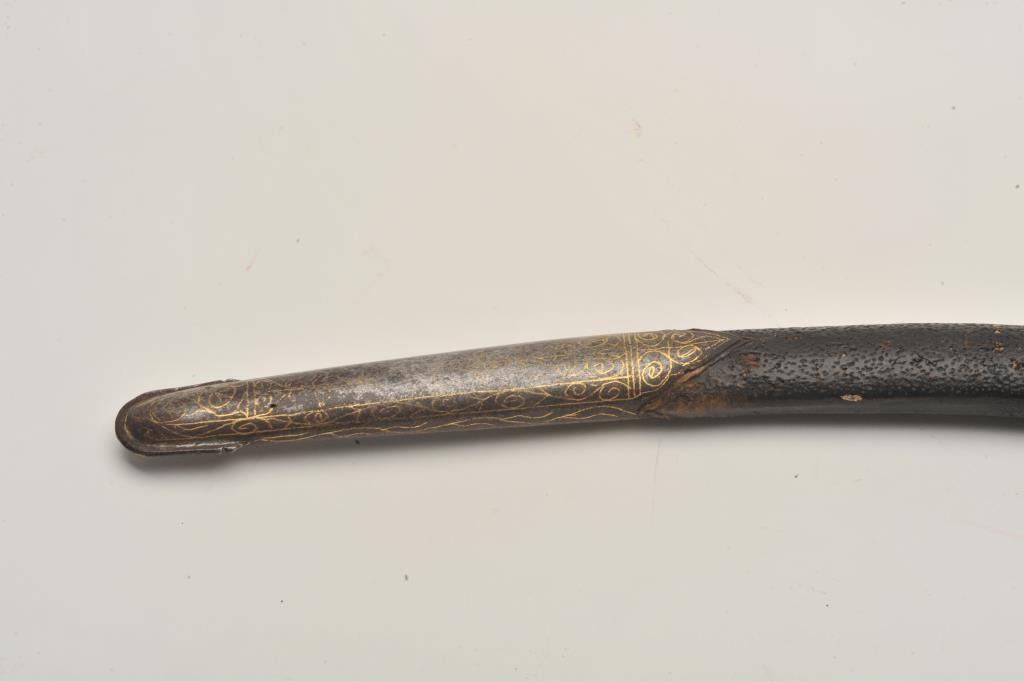 18AR-11 SHAMSHER GOLD SWORDMid-Eastern shamshir style sword circa 18th-19th century with gold damascened decoration, horn grip, and retaining original scabbard. Measures 37” overall with 31” radically curved blade. The blade show nopattern and plain steel. The scabbard decoration on hangers, throat and drag all match the guard. Minor damage to one grip and some slight worming (Born in the horn) Est.: $2500-$5000Mid-Eastern shamshir style sword circa 18th-19th century with gold damascened decoration, horn grip, and retaining original scabbard. Measures 37” overall with 31” radically curved blade. The blade show nopattern and plain steel. The scabbard decoration on hangers, throat and drag all match the guard. Minor damage to one grip and some slight worming (Born in the horn) Est.: $2500-$5000