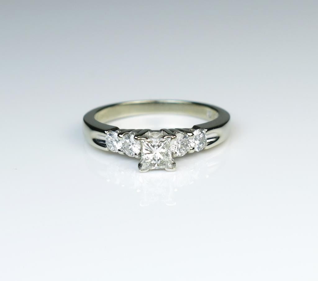 185CAI-75 DIAMOND RINGHigh quality Diamond ring set with a center Princess cut Diamond weighing approx. 0.50 carats of G-H color and SI clarity with four side diamonds approx. 0.50 carats total weight in ring approx. 1.00 carat set in a 14 karat white gold setting. Estimates $1,000-$1,500 NiceHigh quality Diamond ring set with a center Princess cut Diamond weighing approx. 0.50 carats of G-H color and SI clarity with four side diamonds approx. 0.50 carats total weight in ring approx. 1.00 carat set in a 14 karat white gold setting. Estimates $1,000-$1,500 Nice