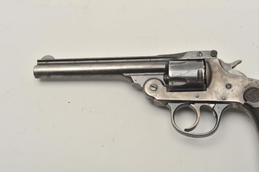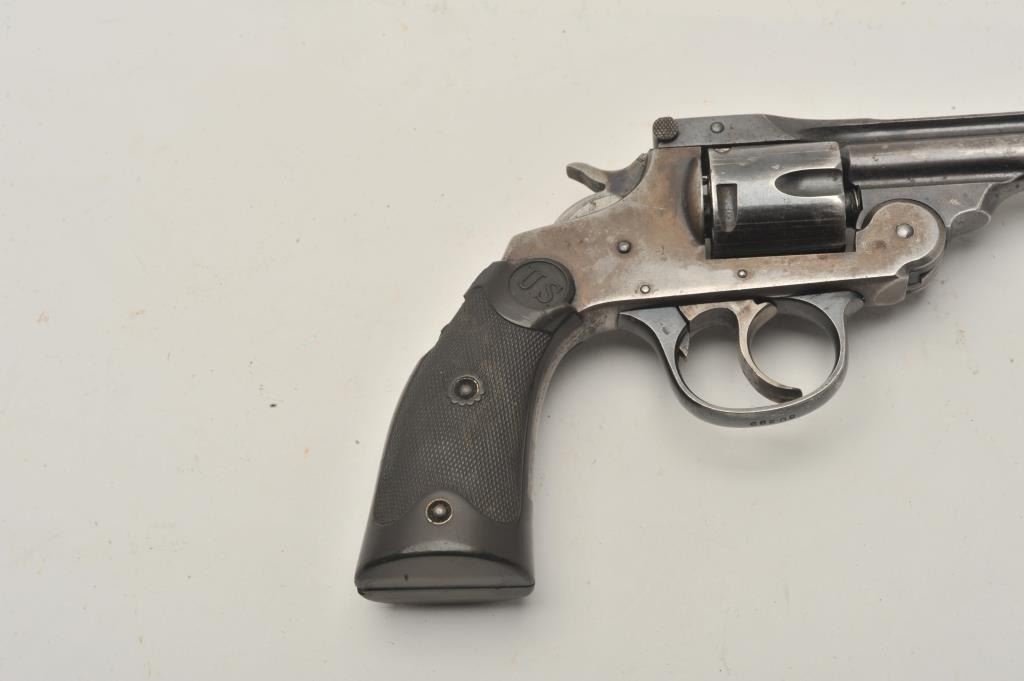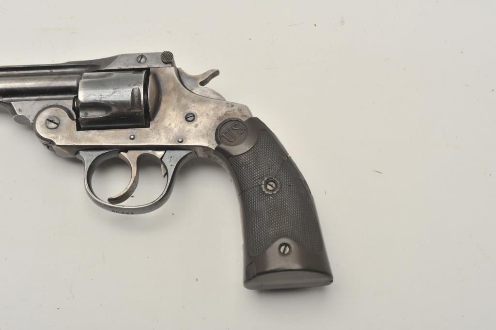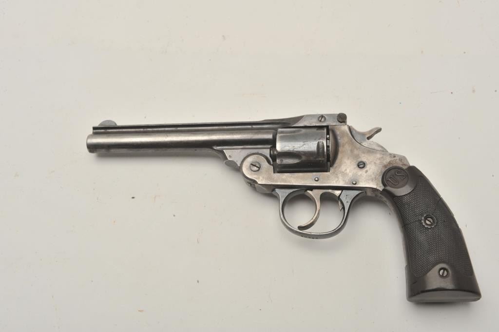18CA-307 U.S. REVOLVER CO. D.A.U.S. Revovler Co. double action revolver in .38 S&W caliber with a 5” barrel and gutta percha target grips. Circa 1910-1930. Excellent bore and working. The grips are broken. 50% drifting blue with good metalsurfaces. (C&R/No PPT) Est.: $100-$200U.S. Revovler Co. double action revolver in .38 S&W caliber with a 5” barrel and gutta percha target grips. Circa 1910-1930. Excellent bore and working. The grips are broken. 50% drifting blue with good metalsurfaces. (C&R/No PPT) Est.: $100-$200