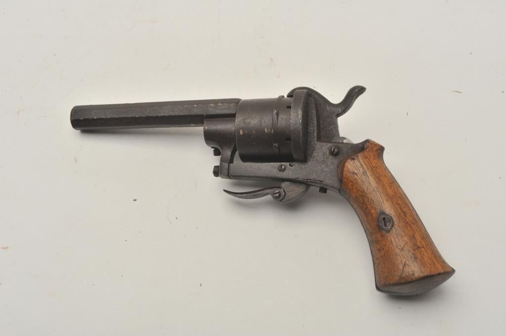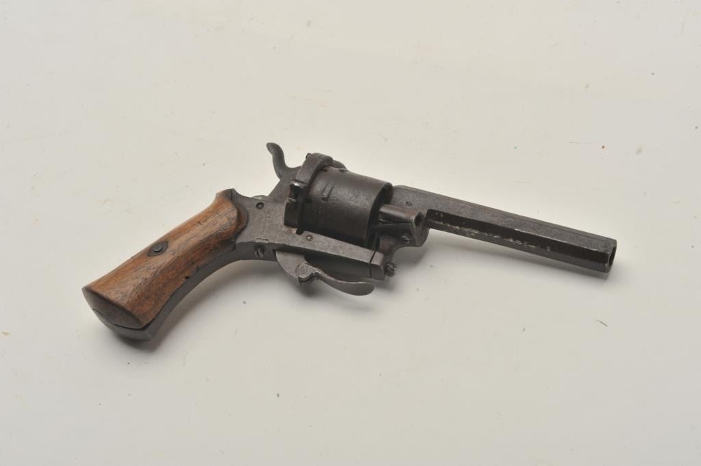 Lot 981 18CA-309 BELGIAN PINFIREBelgian pinfire 7mm revolver circa 1860-70’s. Measures 8” overall with a 3