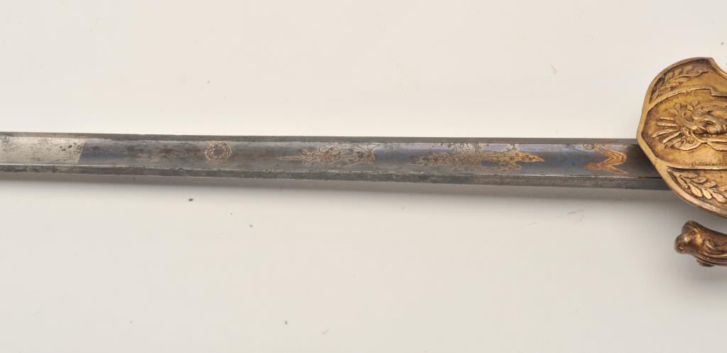 18AR-79 COURT SWORDFancy Court sword (no scabbard) with blued and gilt decoration to top 8” of blade, decorated brass guard, pommel and checkered wood grip with pearl inlay on right side; approximately 37” overall with a 31” blade;overall good to very good condition. Est.: $450-$900.Fancy Court sword (no scabbard) with blued and gilt decoration to top 8” of blade, decorated brass guard, pommel and checkered wood grip with pearl inlay on right side; approximately 37” overall with a 31” blade;overall good to very good condition. Est.: $450-$900.