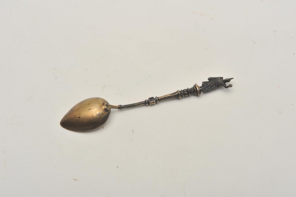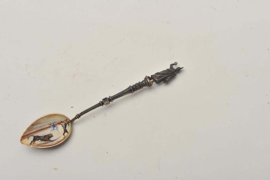 EVE-419 900. FINE MRK ENAMALED BOWL SPOON900 fine marked enameled in bowl spoon of bullfight with Roman on top who was holding spear which is now missing. Enamel is fine with tarnished gilt on silver. Same statue at famous bull ring (Barcelona?). The estateof Eric Vaule. Est.: $100-$200900 fine marked enameled in bowl spoon of bullfight with Roman on top who was holding spear which is now missing. Enamel is fine with tarnished gilt on silver. Same statue at famous bull ring (Barcelona?). The estateof Eric Vaule. Est.: $100-$200