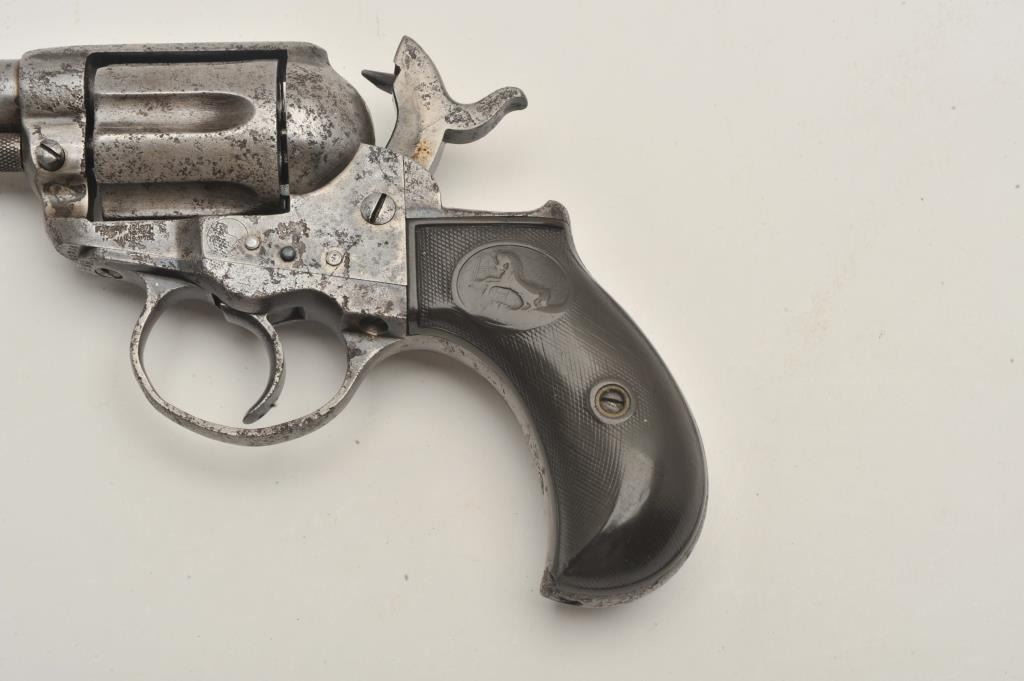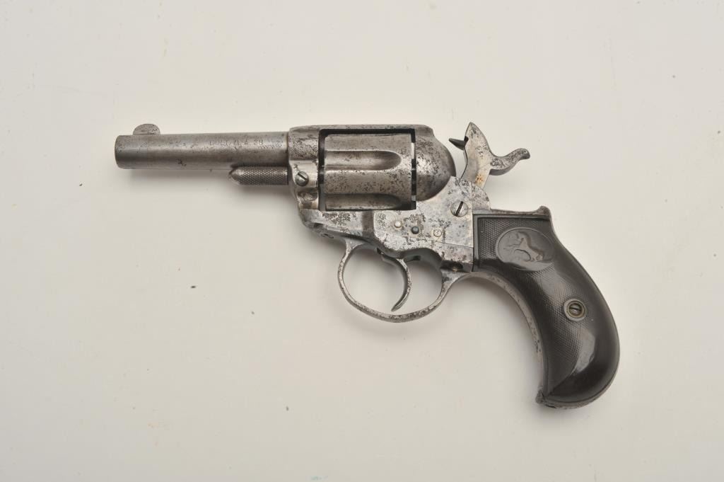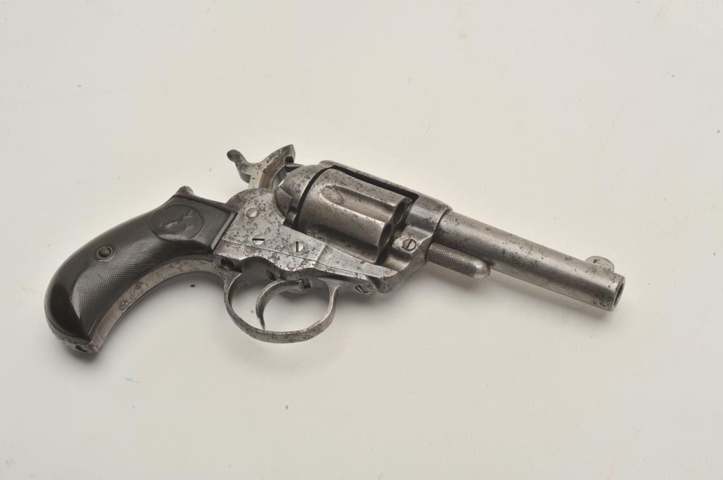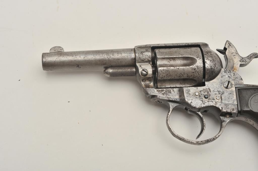 18CA-351 COLT MDL 1877 LIGHTENINGColt Model 1877 lightning in .38 caliber with a 3 ½” barrel, ejectorless sheriff’s or storekeeper’s model, S/N 82238. Fair to poor condition with some pitting and not working (Frozen). Matching numbers. The grips areworn. All correct. Out of old New Mexico collection sold by Lee Silva western author to Richard Sweet old west collector. (Antique) Est.: $200-$400Colt Model 1877 lightning in .38 caliber with a 3 ½” barrel, ejectorless sheriff’s or storekeeper’s model, S/N 82238. Fair to poor condition with some pitting and not working (Frozen). Matching numbers. The grips areworn. All correct. Out of old New Mexico collection sold by Lee Silva western author to Richard Sweet old west collector. (Antique) Est.: $200-$400