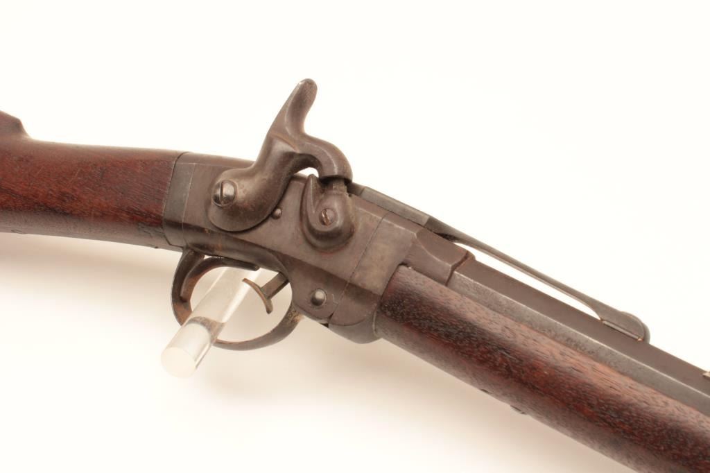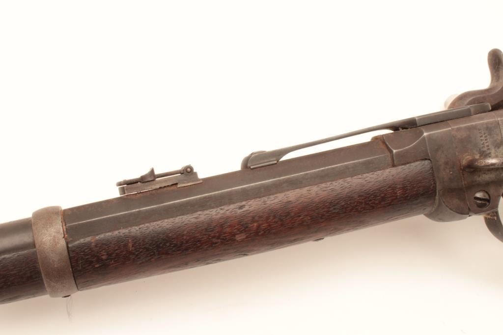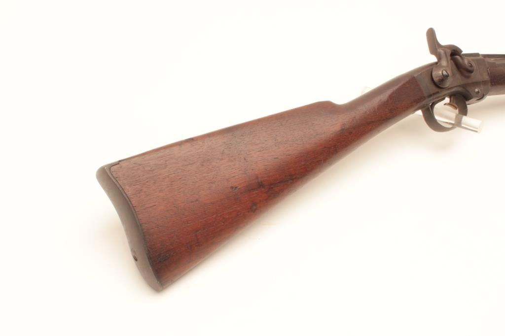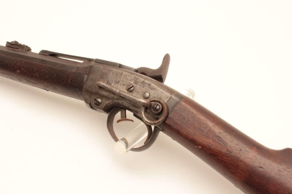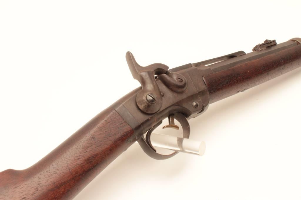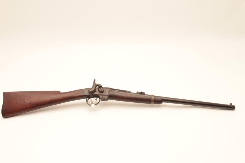 18AP-49 SMITH C.W. CARBINESmith saddle ring single shot percussion carbine, .50 caliber, Serial #8153. The carbine is in good overall condition with a 21 5/8” round to octagon barrel brass ramped blade with military tangent rear sights. The metal surfaces have gone to a pleasing smooth brown patina. The receiver is a grey/brown patina with areas of old, toning case hardening. The saddle bar and ring both retained as well as the barrel band. Thereceiver is marked, “ADDRESS/POULTNEY & TRIMBLE/BALTIMORE”. The smooth wood stock is in good condition with mars and compressions consistent with service use a smooth steel crescent butt plate. The bore is good, theactio9n crisp and markings are sharp on this Civil War carbine with production numbers approaching 30,000 per Flayderman’s. Est.: $500-$1,000. (Antique).Smith saddle ring single shot percussion carbine, .50 caliber, Serial #8153. The carbine is in good overall condition with a 21 5/8” round to octagon barrel brass ramped blade with military tangent rear sights. The metal surfaces have gone to a pleasing smooth brown patina. The receiver is a grey/brown patina with areas of old, toning case hardening. The saddle bar and ring both retained as well as the barrel band. Thereceiver is marked, “ADDRESS/POULTNEY & TRIMBLE/BALTIMORE”. The smooth wood stock is in good condition with mars and compressions consistent with service use a smooth steel crescent butt plate. The bore is good, theactio9n crisp and markings are sharp on this Civil War carbine with production numbers approaching 30,000 per Flayderman’s. Est.: $500-$1,000. (Antique).