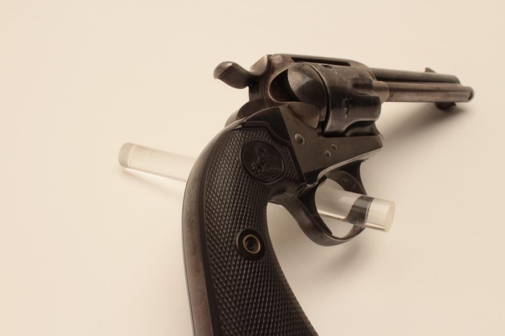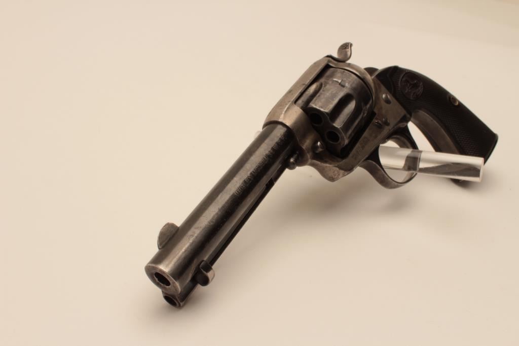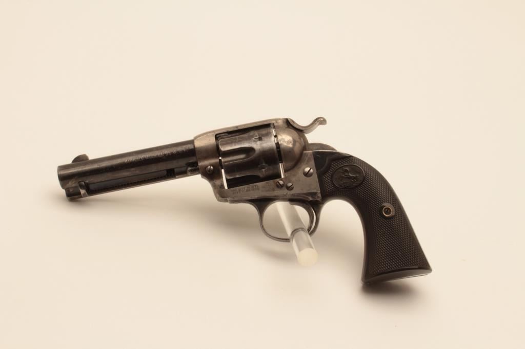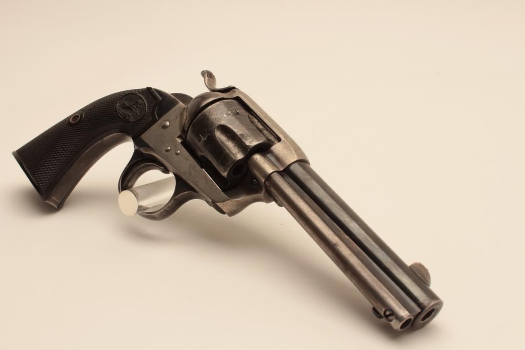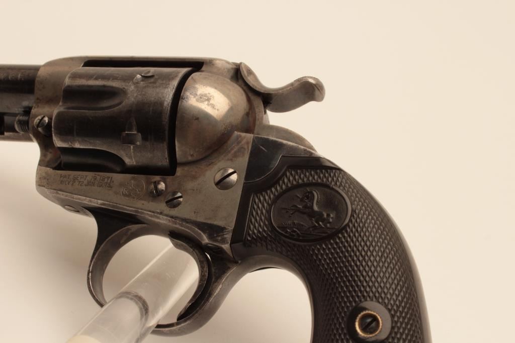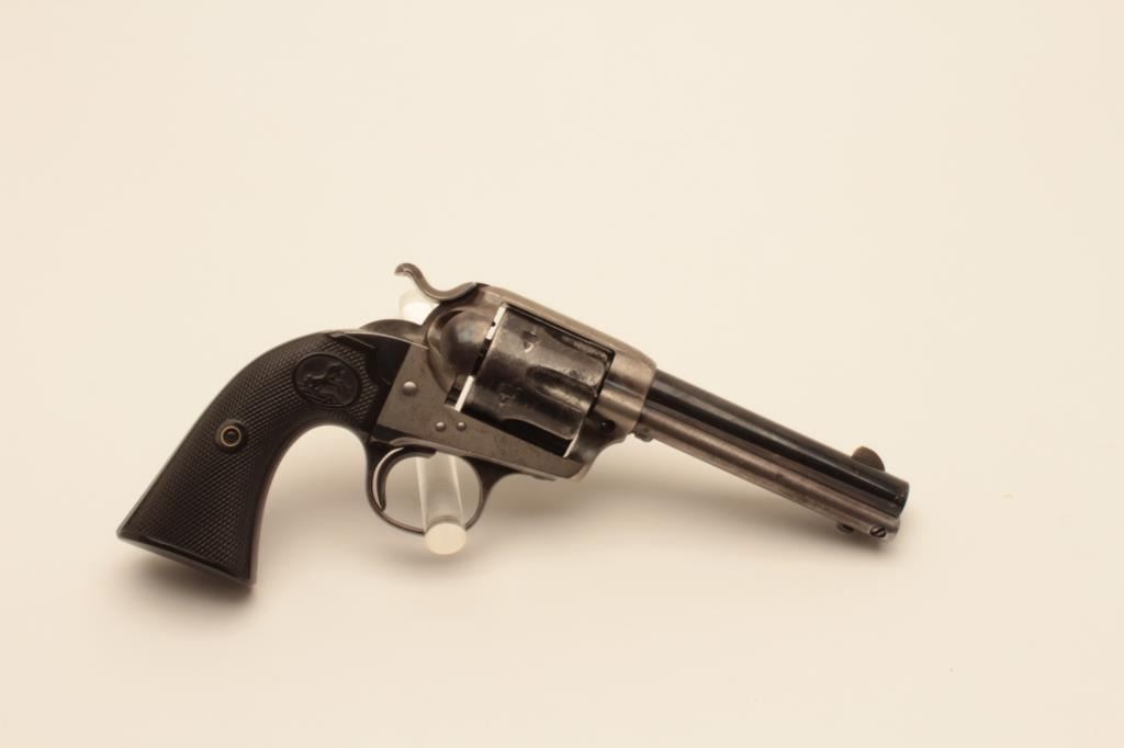 18AY-1 COLT BISLEY #217002Colt Bisley Model single action revolver, .32 WCF caliber, Serial #217002. The pistol is in fine overall condition with a 4 ¾” barrel. The barrel and cylinder retain a significant amount of their original flakingblue finish with where at the muzzle and some light pinprick pitting on the cylinder. The screw heads are good and there is muted case coloring still visible in the frame and on the hammer. The checkered hard rubber gripsare in very good condition with sharp checkering. The bore is good, the action crisp and markings are sharp on this nice Bisley model manufactured in 1901. Est.: $1,000-$2,000. (C+R).Colt Bisley Model single action revolver, .32 WCF caliber, Serial #217002. The pistol is in fine overall condition with a 4 ¾” barrel. The barrel and cylinder retain a significant amount of their original flakingblue finish with where at the muzzle and some light pinprick pitting on the cylinder. The screw heads are good and there is muted case coloring still visible in the frame and on the hammer. The checkered hard rubber gripsare in very good condition with sharp checkering. The bore is good, the action crisp and markings are sharp on this nice Bisley model manufactured in 1901. Est.: $1,000-$2,000. (C+R).