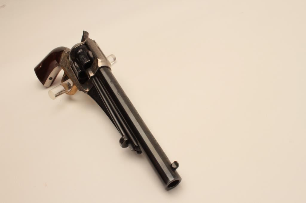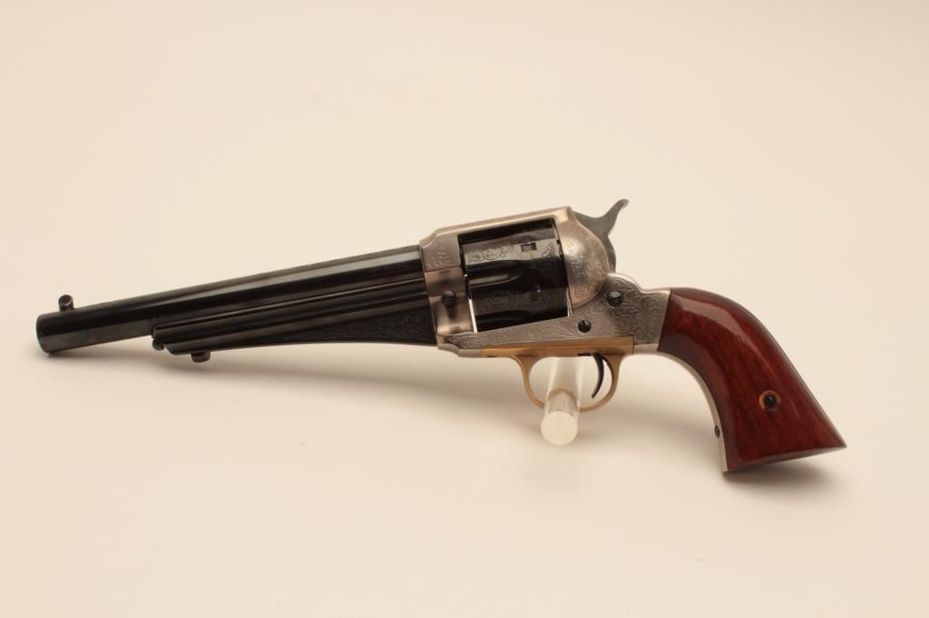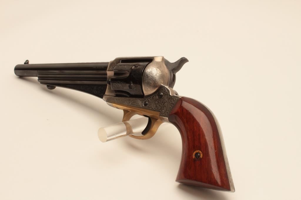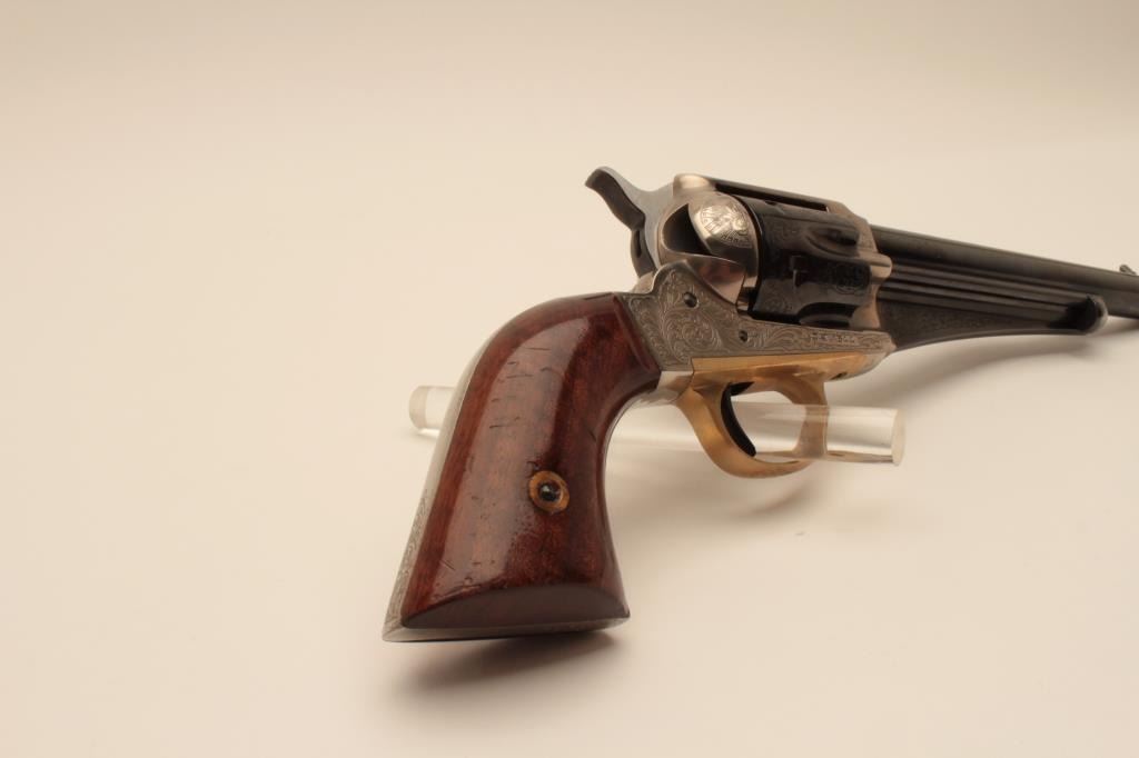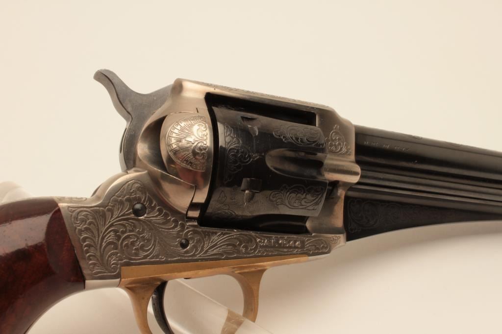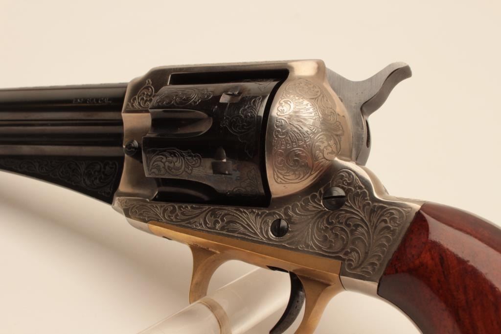 17AY-6 EMF #19064EMF 1875 Outlaw model of a Remington revolver, .45 caliber, Serial #19064. The pistol is in minty overall condition with a 7” barrel. The engraved barrel and cylinder retain nearly all of their blue finish withslight handling marks. The frame is coin finished in the white and beautifully engraved. The smooth wood grips are in very good condition. The bore is very good, the action crisp and markings are sharp. Est.:$250-$500. (Modern).EMF 1875 Outlaw model of a Remington revolver, .45 caliber, Serial #19064. The pistol is in minty overall condition with a 7” barrel. The engraved barrel and cylinder retain nearly all of their blue finish withslight handling marks. The frame is coin finished in the white and beautifully engraved. The smooth wood grips are in very good condition. The bore is very good, the action crisp and markings are sharp. Est.:$250-$500. (Modern).