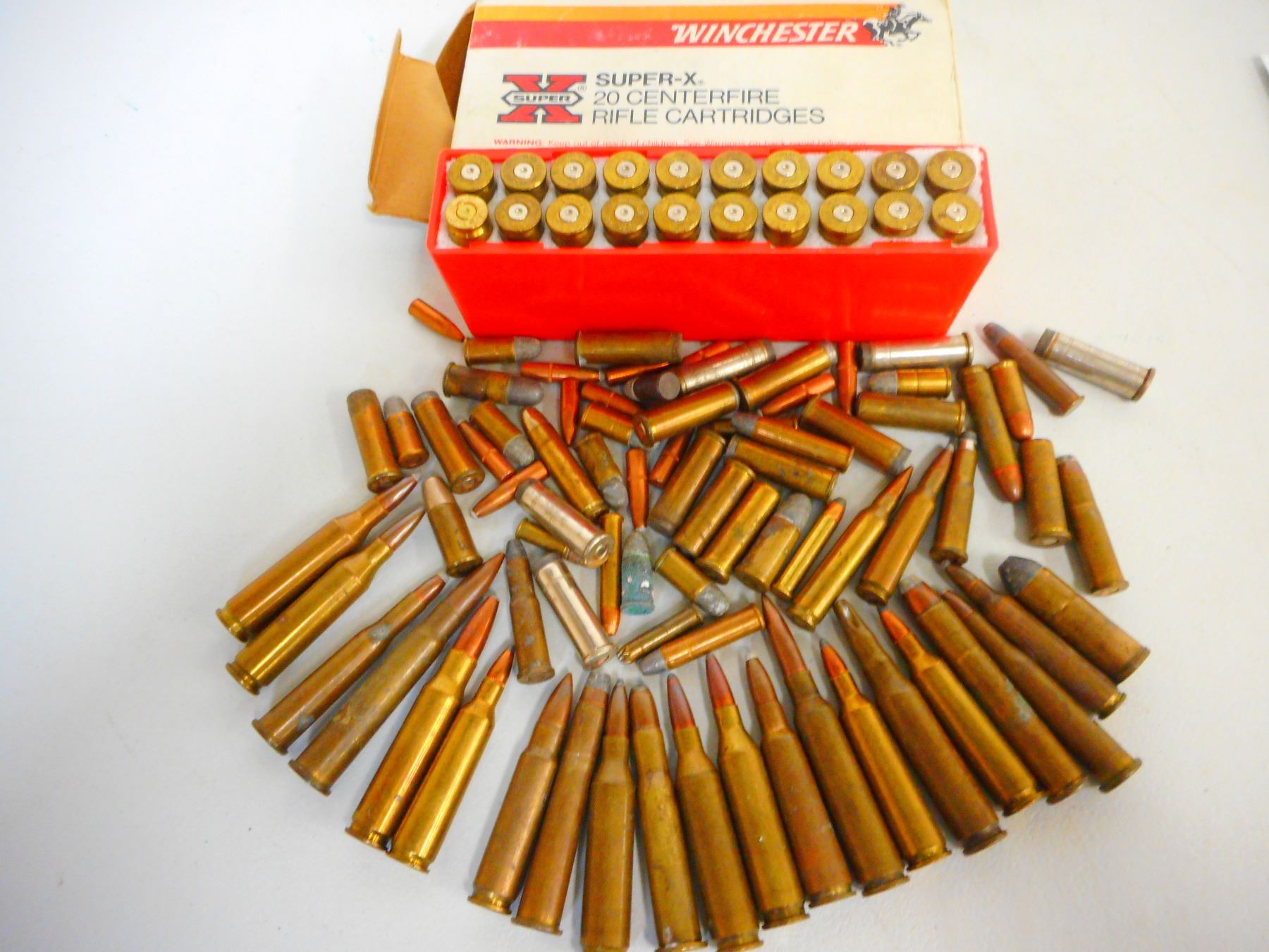 APPROX. 65 RNDS AMMO 20 BRASS, INCLUDES 38-55 .380, US-30, 30-30, 38 SPL, 243 WIN, 38 S&W, & BULLETS