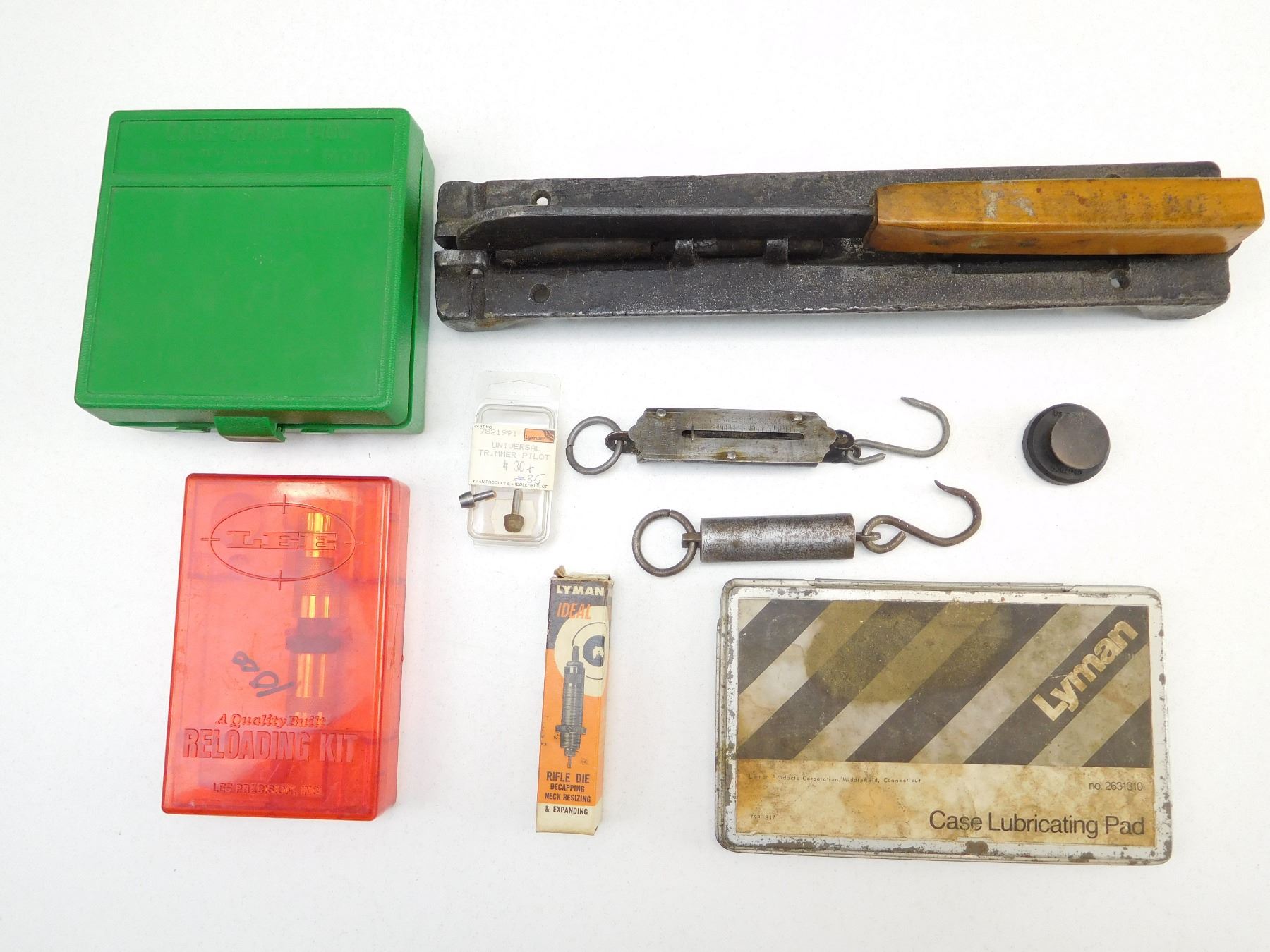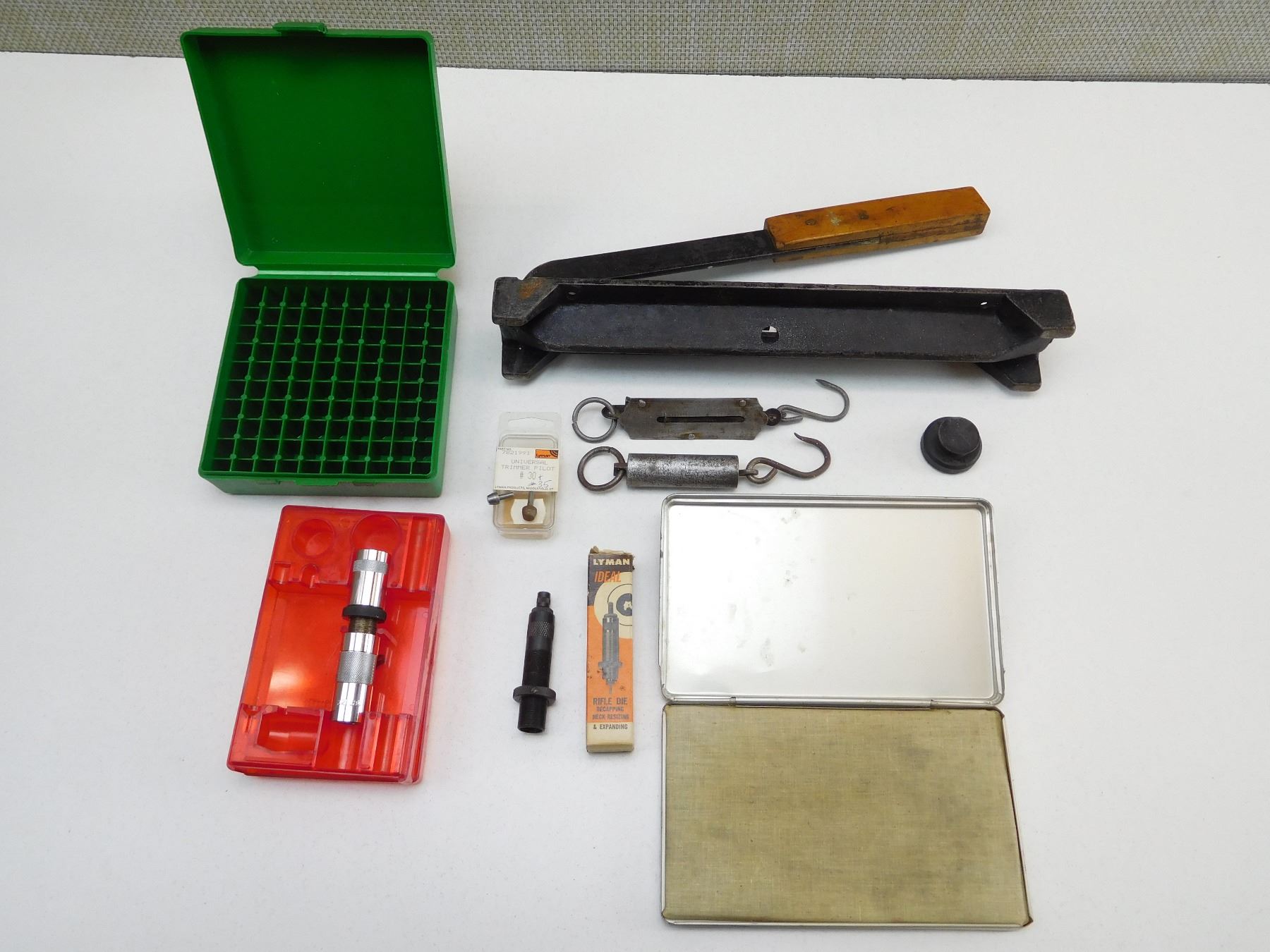 (1) LYMAN 7MM DIE, (1) UNIVERSAL TRIMMER PILOT #30 & 35, (1) LYMAN CASE LUBE PAD, (1) ANTIQUE PRESS, (1) LEE 22-250 DIE IN PLASTIC CASE, (20 VINTAGE WEIGH SCALES: (1) REBURE POCKET BALANCE