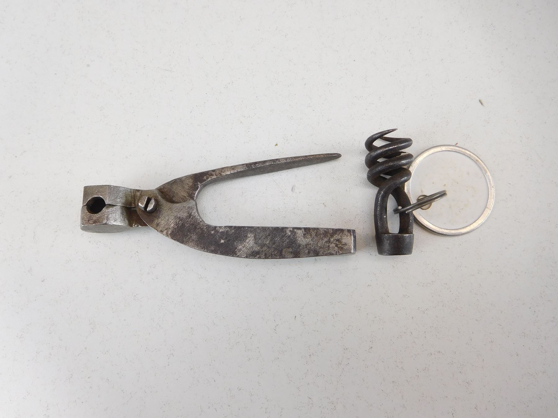 (1) MUSKET WORM, (1) SCISSOR BULLET MOULD ROUND BALL- WELL WORN, LOT OF 2