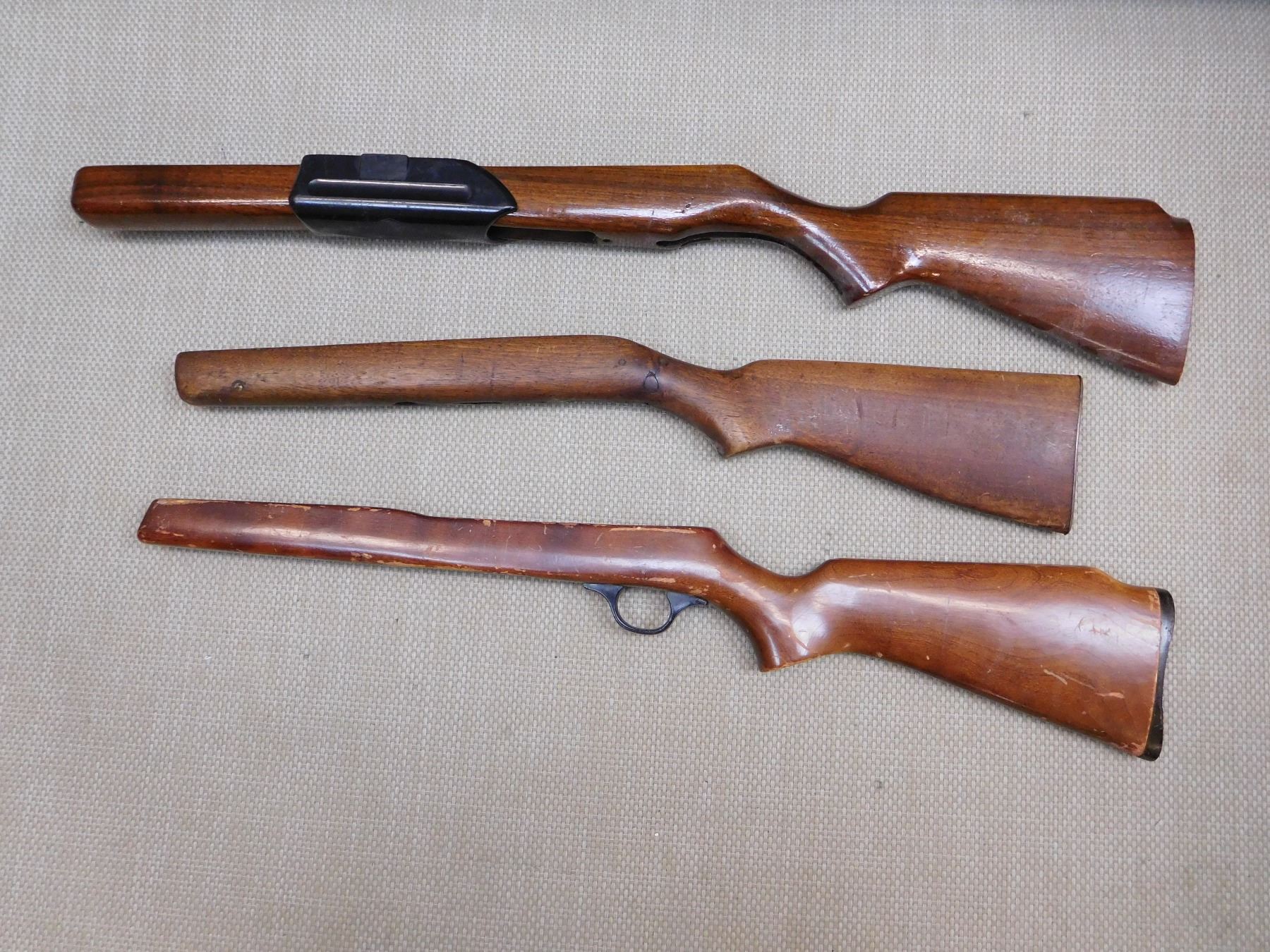 (1) WITH TRIGGER GUARD AND PLASTIC BUTT PLATE, (1) CRACKED STOCK, METAL BUTT PLATE, (1) CRACKED GRIPS, LOT OF 3