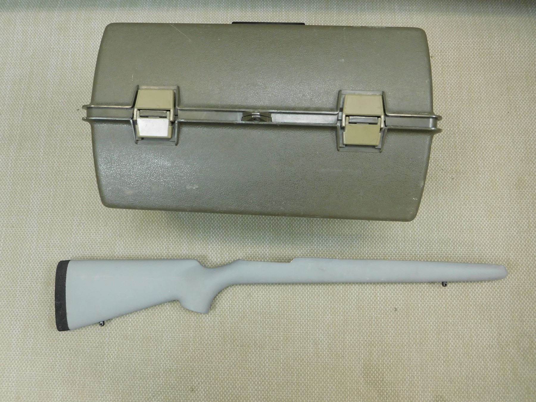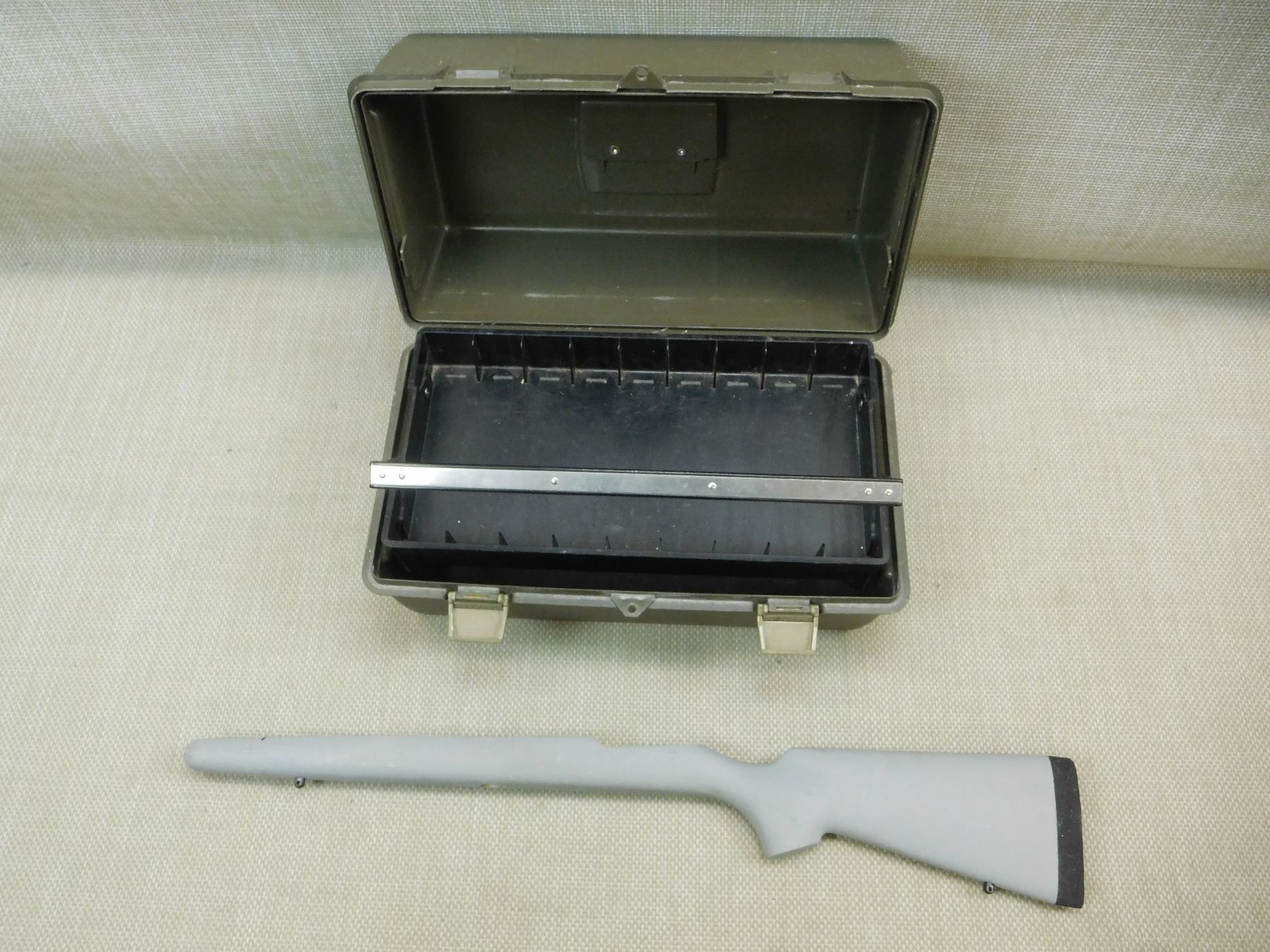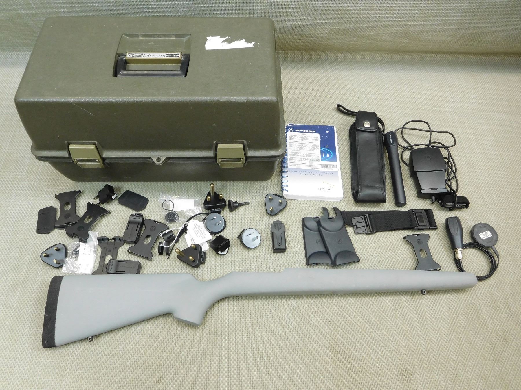 (1) ADVENTURER TOOL BOX WITH TRAY APPROX 18 X 10.5 X 10", (1) BLANK GUN STOCK WITH FOAM BUTT PLATE, (1) BAG OF ASSORTED MOTOROLA PRODUCTS