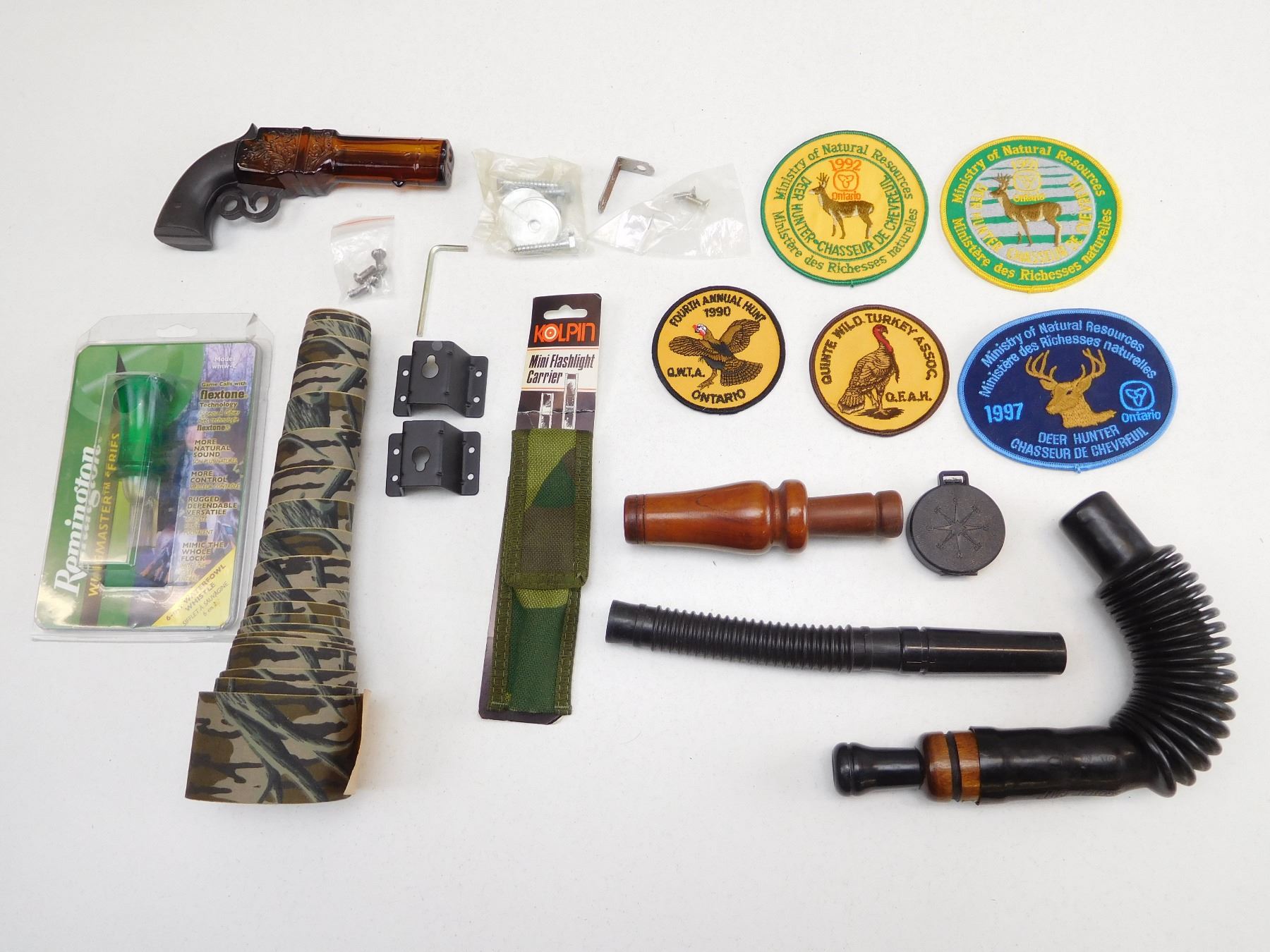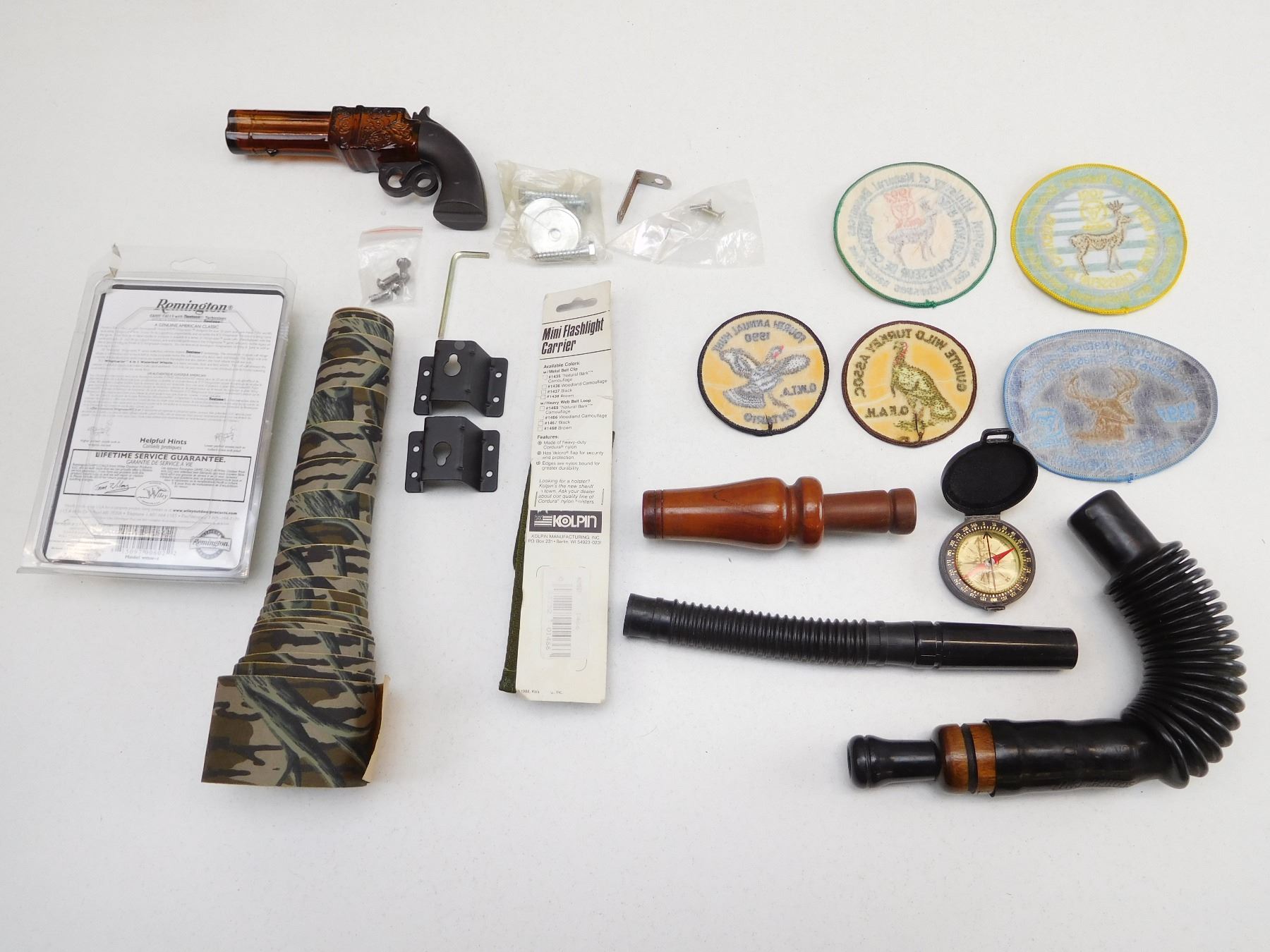 (1) REPLICA ANTIQUE TOY GUN- GLASS, ASSORTED ANIMALS CALLS: (1) SCOTCH CALL, (1) REMINGTON WING MASTER SERIES IN ORIGINAL PACKAGING, ASSORTED HUNTING BADGES & FLASHLIGHT CARRIER