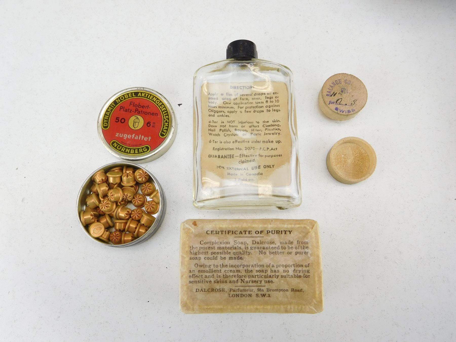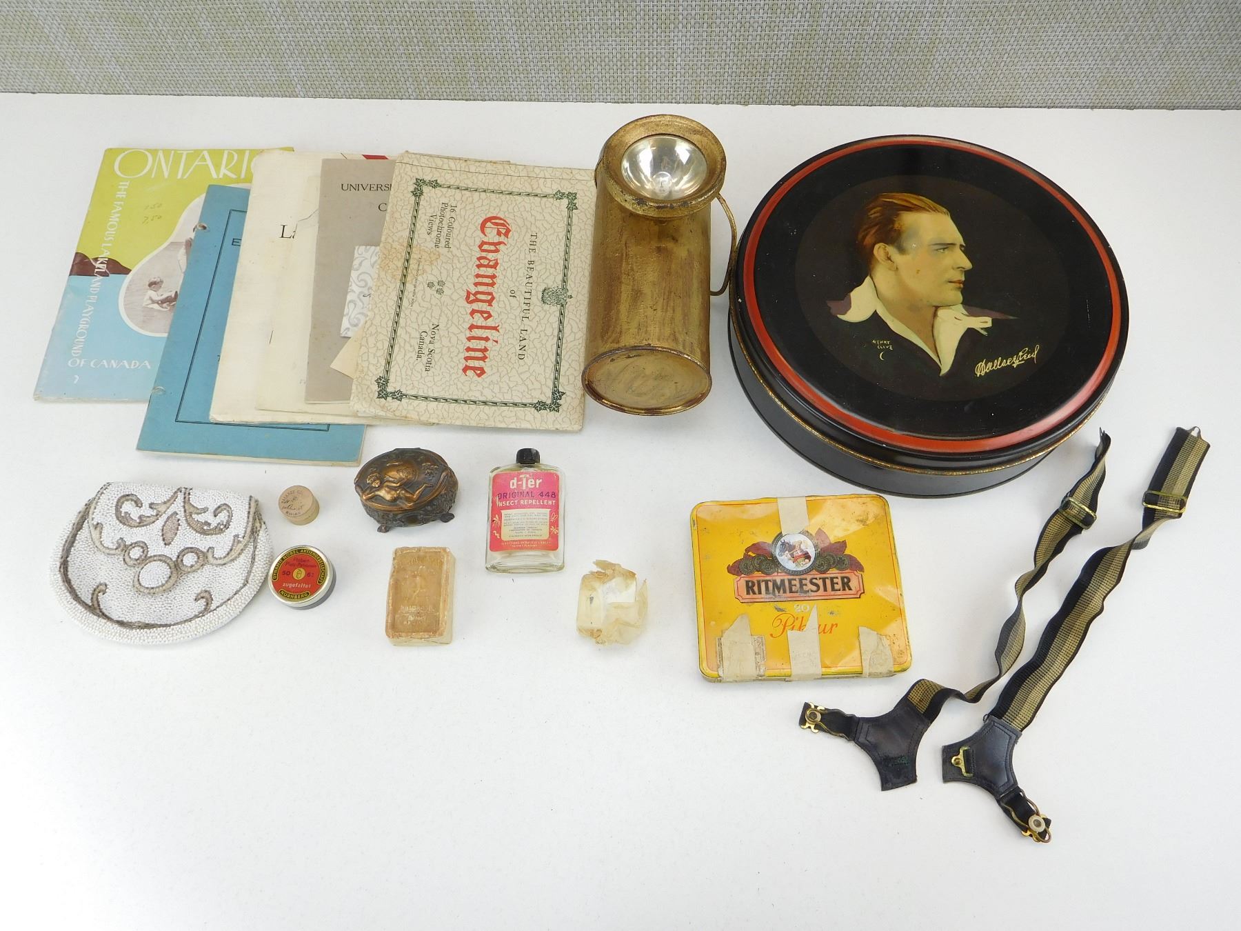 INCLUDES ANTIQUE TINS, BEADED PURSE, DALCROSE SOAP, MOSTLY EMPTY D-TER ORIGINAL 448 INSECT REPELLENT ASSORTED BOOKS OF ONTARIO & NOVA SCOTIA, & WAR ERA SCHOOL BOOKS, (1) LIGHT HAS BEEN PAINTED OVER, (1) TIN APPROX. 30 RNDS 6MM FLOBERT BLANKS