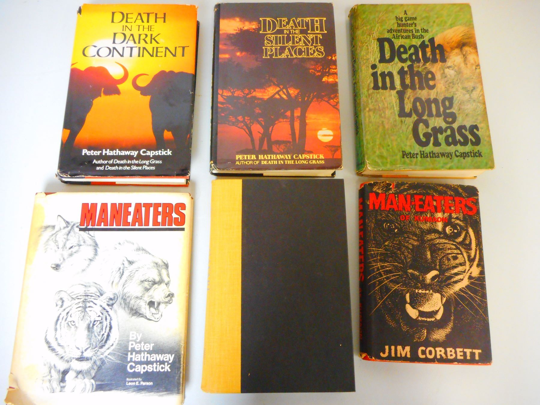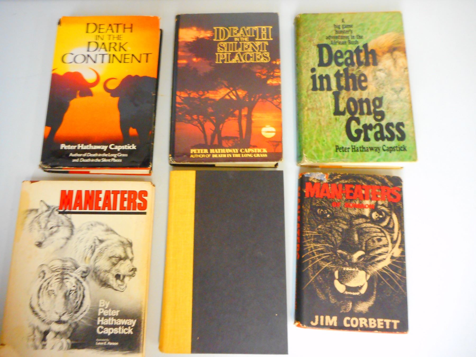 INCLUDES COLLECTION OF PETER HATHAWAY CAPSTICK:(1) DEATH IN THE LONG GRASS, (1) DEATH IN THE SILENT PLACES, (1) DEATH IN THE DARK CONTINENT, (1) SAFARI (1) MANEATERS; PLUS MAN-EATERS OF KUMAON BY JIM CORBETT, LOT OF 6