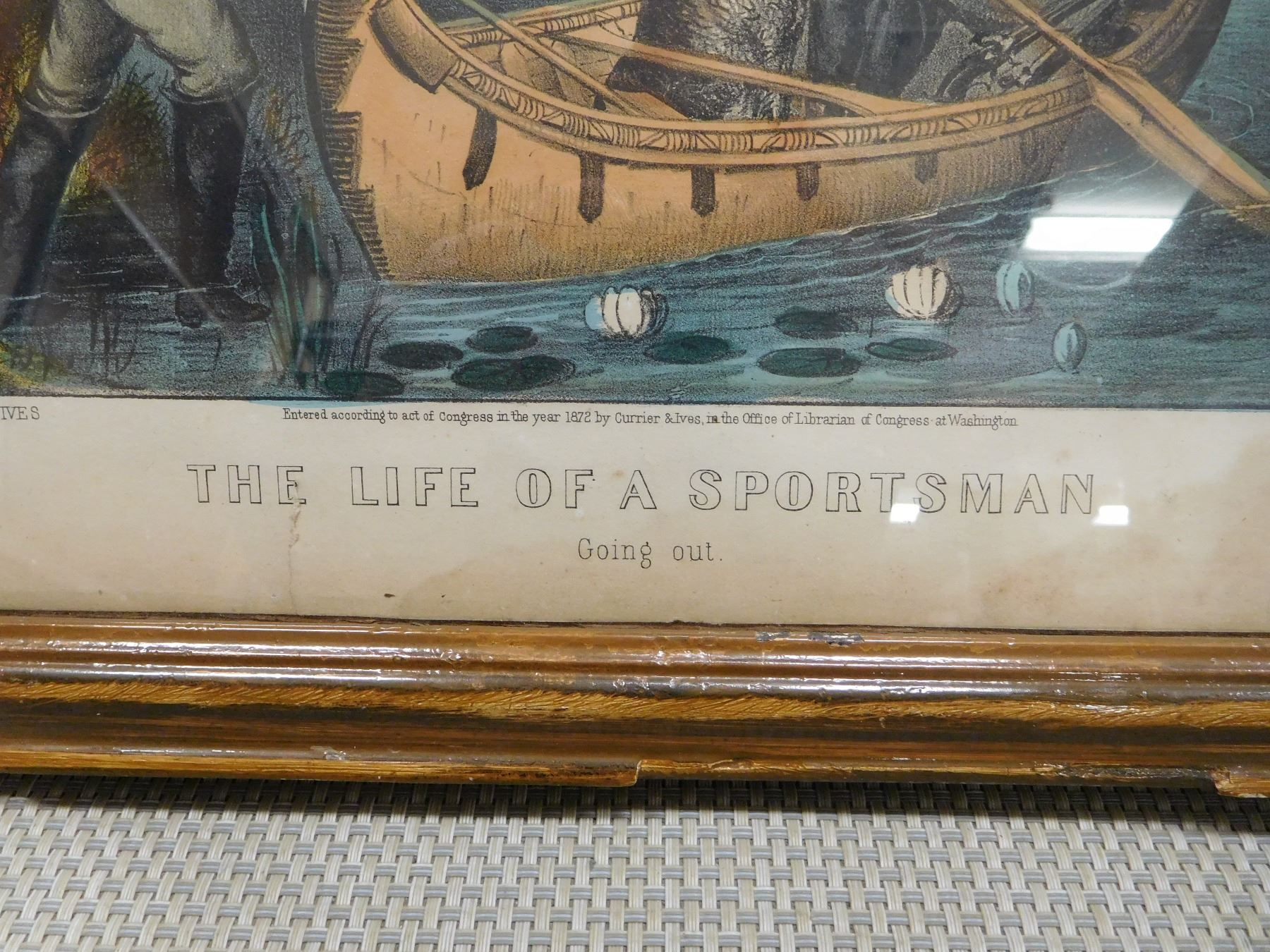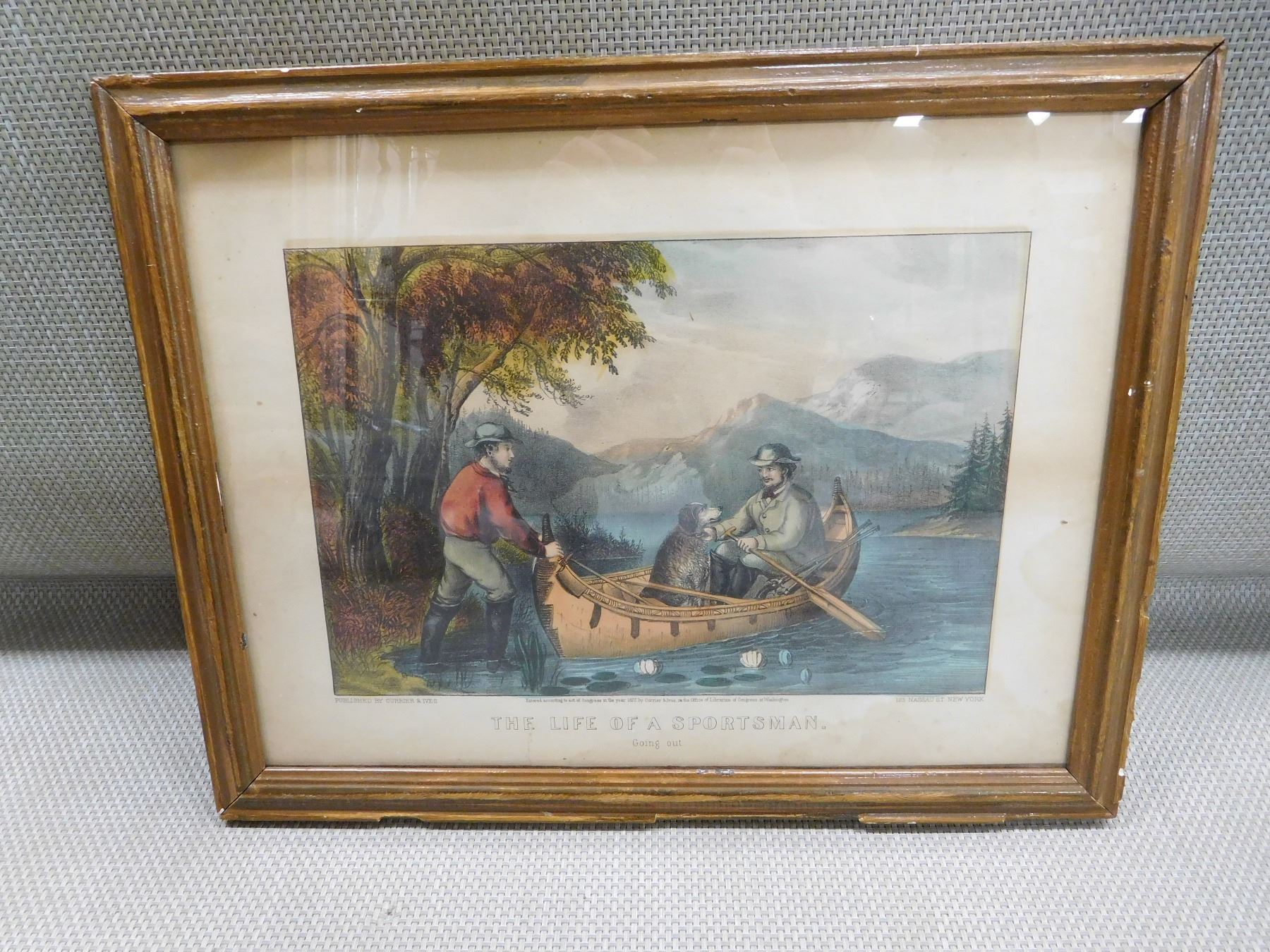 "GOING OUT" FRAMED WITH GLASS PUBLISHED BBY CURRIER & IVES, APPROX. SIZE 17 3/4 X 14" NOTICE THERES NO GUARENTEE ON GLASS