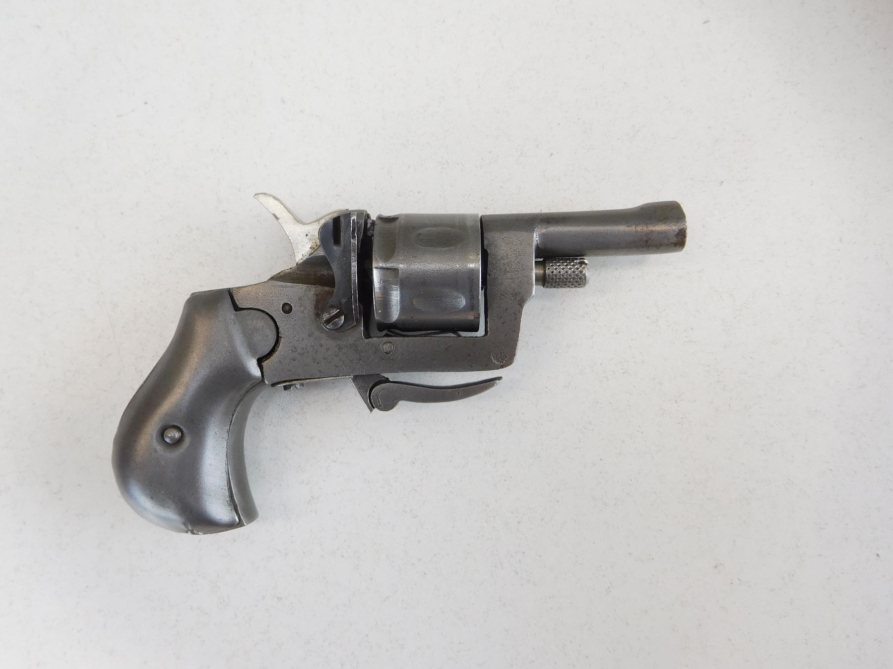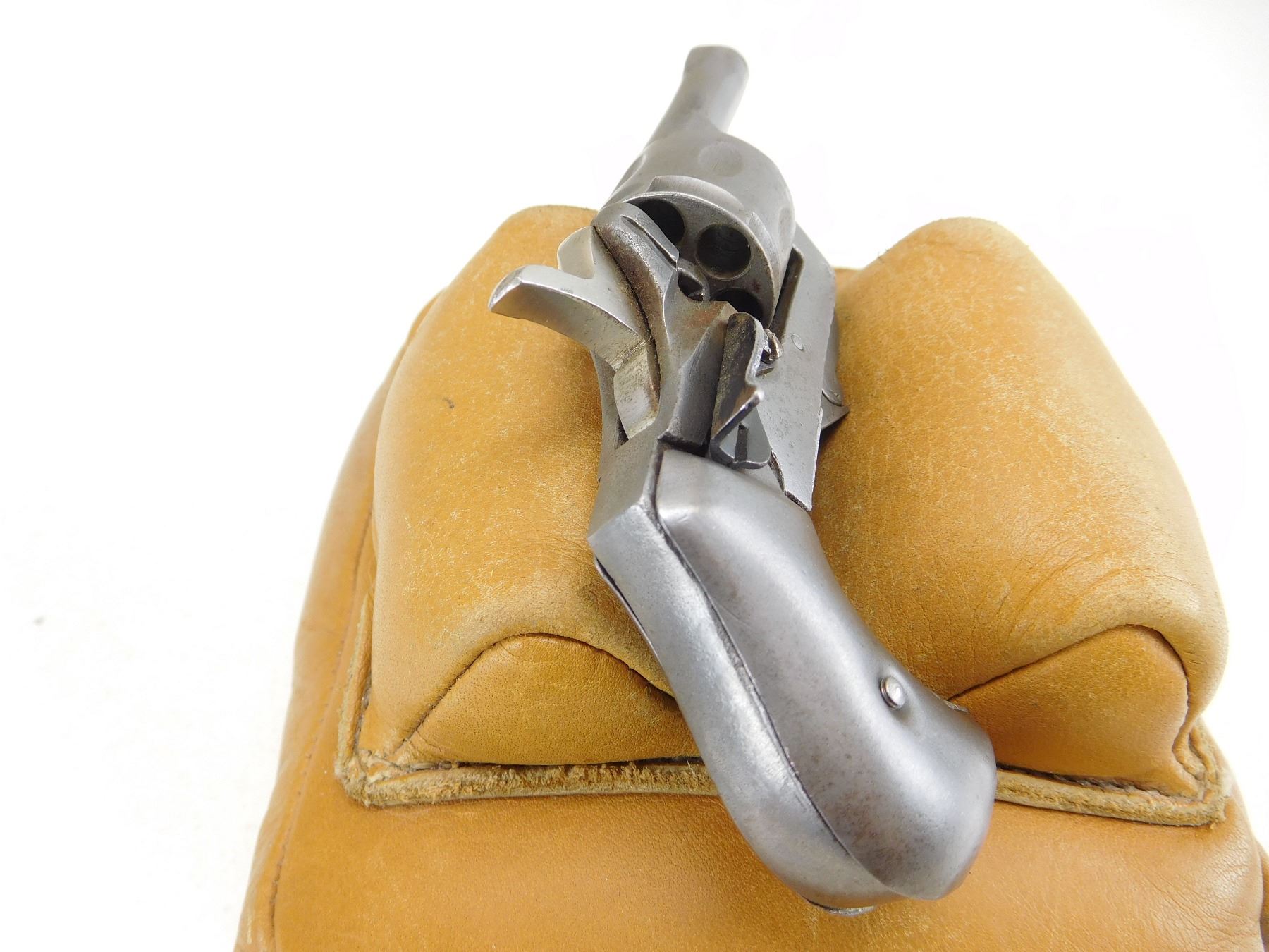 FOLDING TRIGGER, GERMAN PROOF, UNIQUE FRAME SAFETY, REPLACED STEEL GRIPS, FINISH HAS BEEN REMOVED, DARK BORE, RAISED FRONT AND NO REAR SIGHT ON THIS MODEL , ACTION: REVOLVER , BARREL LENGTH: 38MM , STOCK # P1887 , SERIAL # FD353 , CONDITION: 2/10 , CLASS: CANADIAN PROHIBITED CLASS