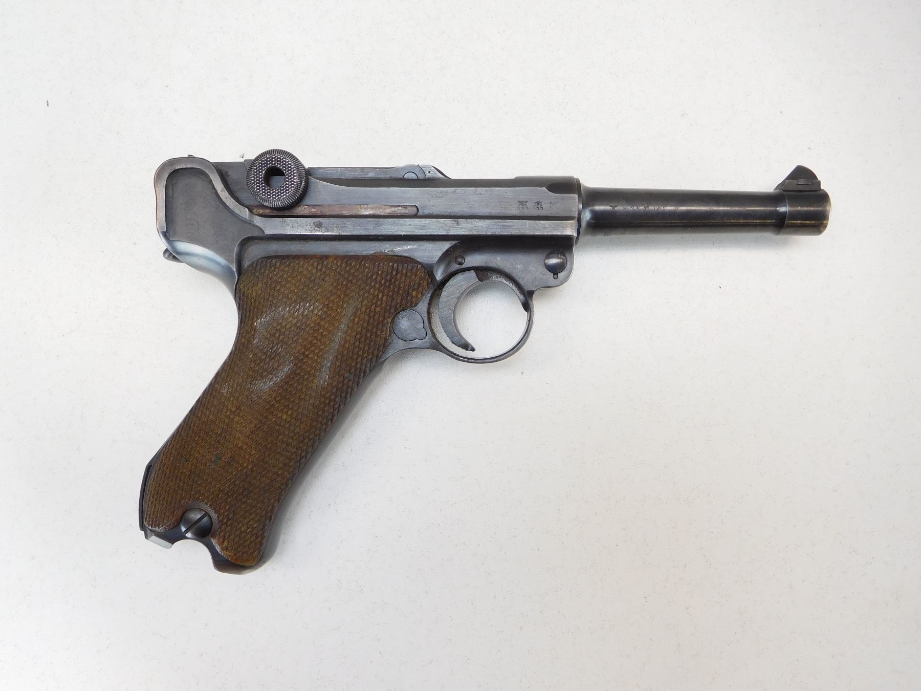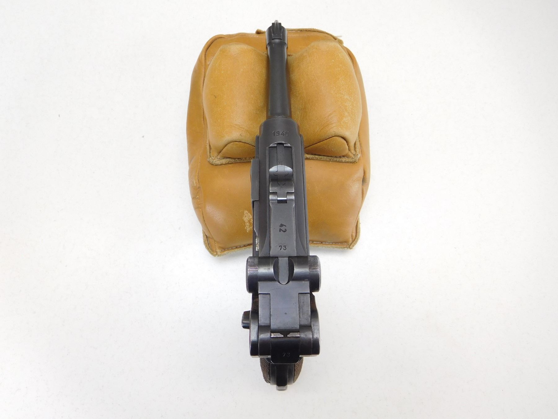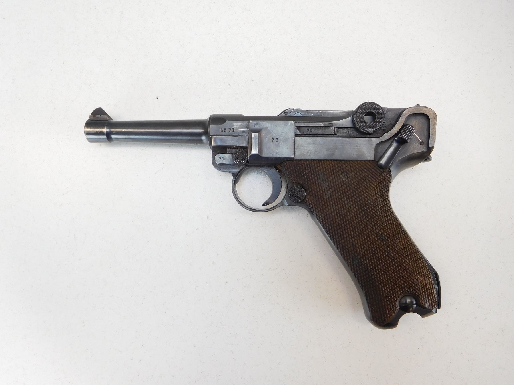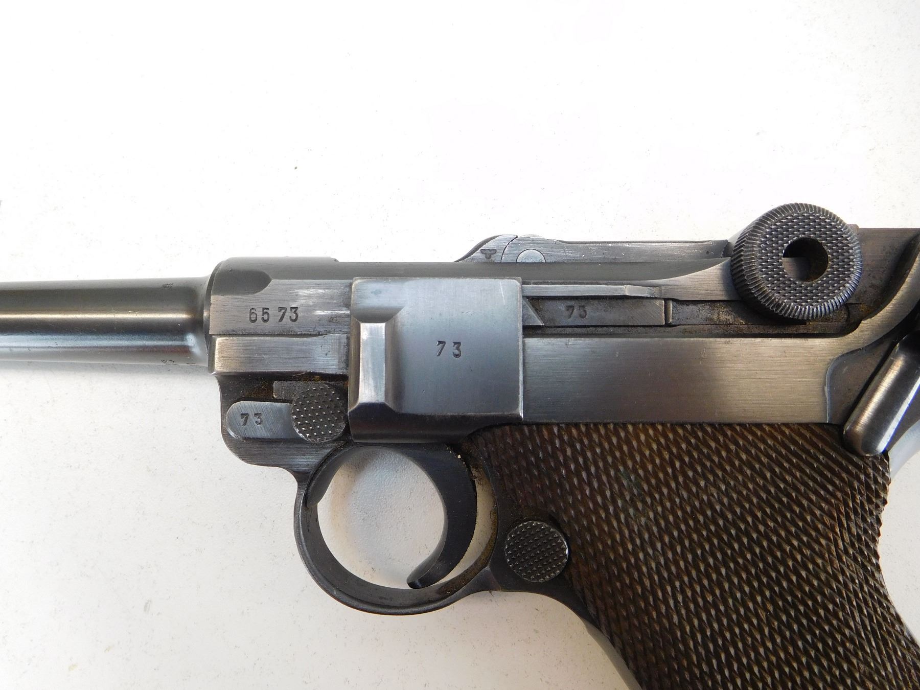 DOES NOT HAVE A MAGAZINE, GERMAN MILITARY WARTIME MARKS, MARKED 42 MADE BY MAUSER, CHECKERED WOODEN GRIPS, VERY GOOD BORE, ALL MATCHING NUMBERS, DATED 1940, STANDARD SAFETY FUNCTIONS, DOVETAIL FRONT AND RAISED NOTCH REAR SIGHT, RETAINS 80% OF ORIGINAL BLUEING , ACTION: SEMI AUTOMATIC HANDGUN , BARREL LENGTH: 102MM , STOCK # P1904 , SERIAL # 6573C , CONDITION: 8/10 , CLASS: CANADIAN PROHIBITED CLASS