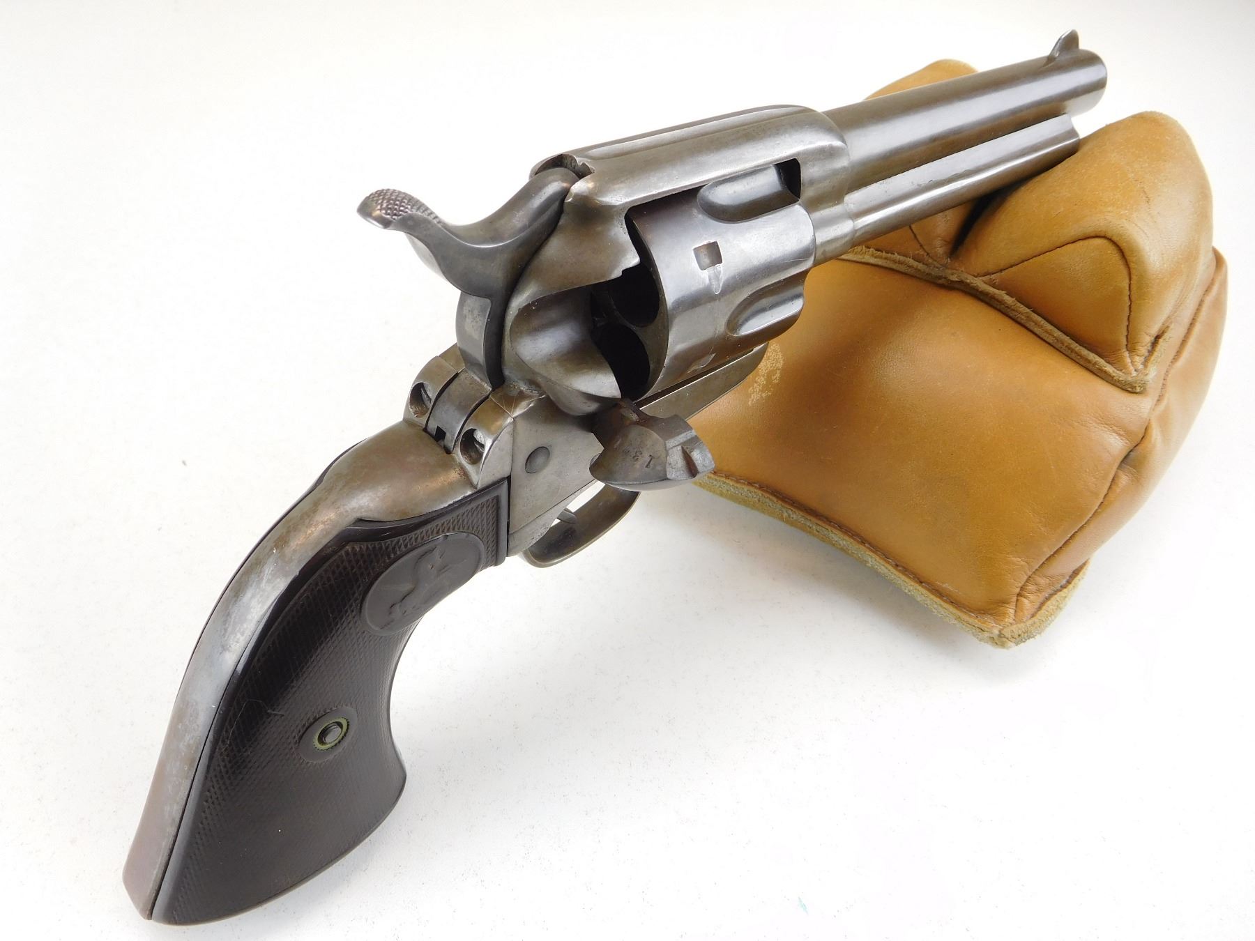 MANUFACTURED IN 1882 (USA ANTIQUE), ALL MATCHING NUMBERS, GOOD BORE WITH MINOR PITTING, BLADE FRONT AND V NOTCH REAR SIGHT, CHECKERED HARD RUBBER GRIPS, HOLDS COCK AND FIRES, BROWN PATINA , ACTION: REVOLVER , BARREL LENGTH: 141MM , STOCK # R2509 , SERIAL # 76614 , CONDITION: 7/10 , CLASS: CANADIAN RESTRICTED CLASS