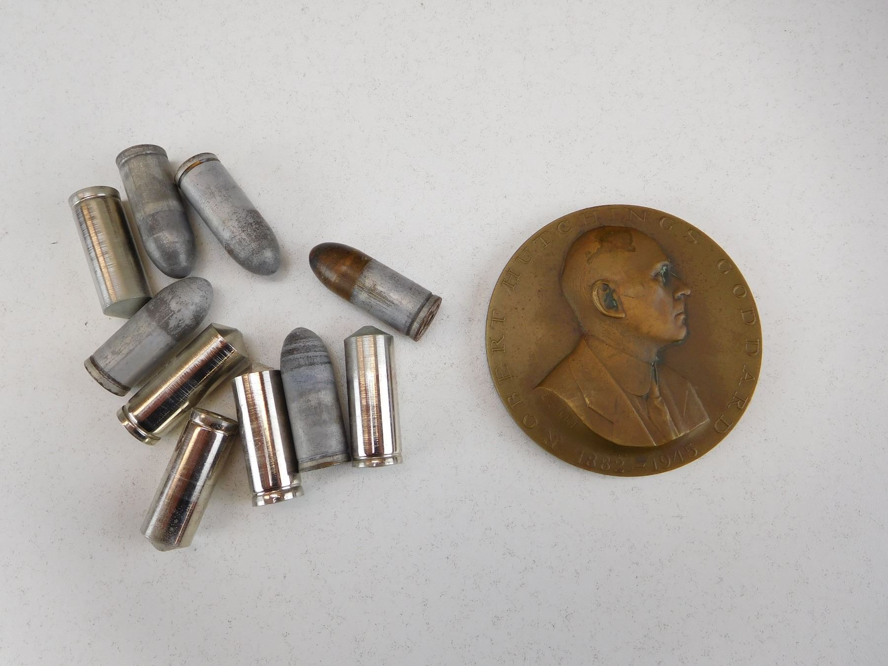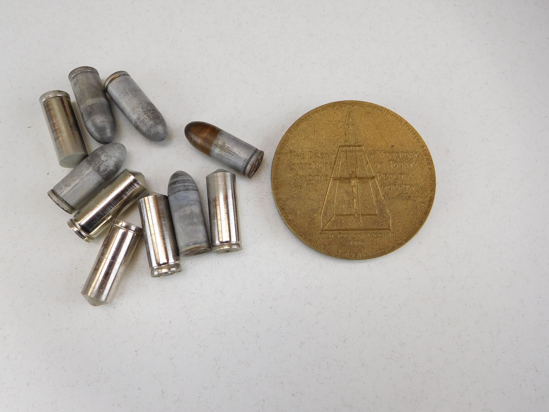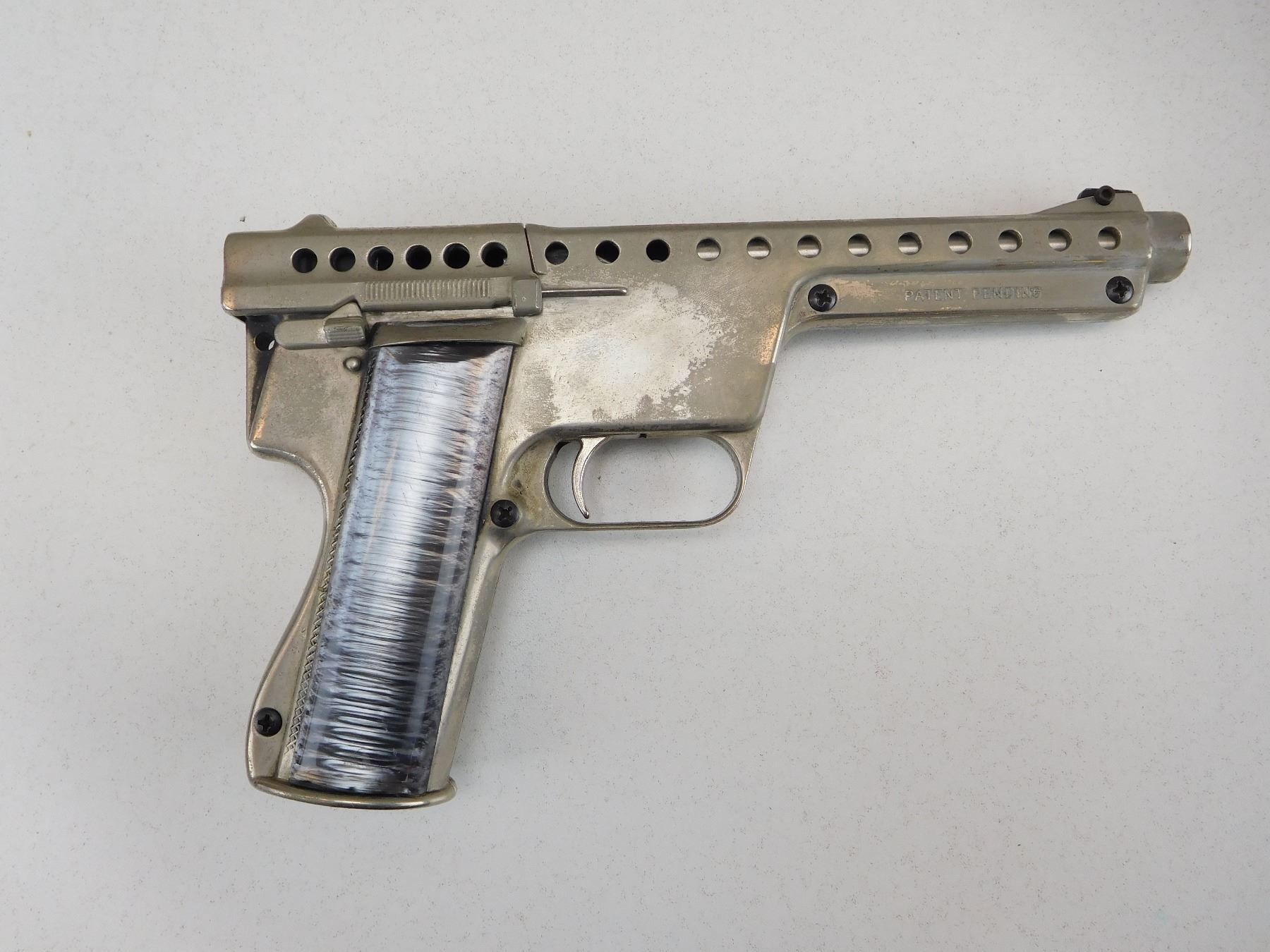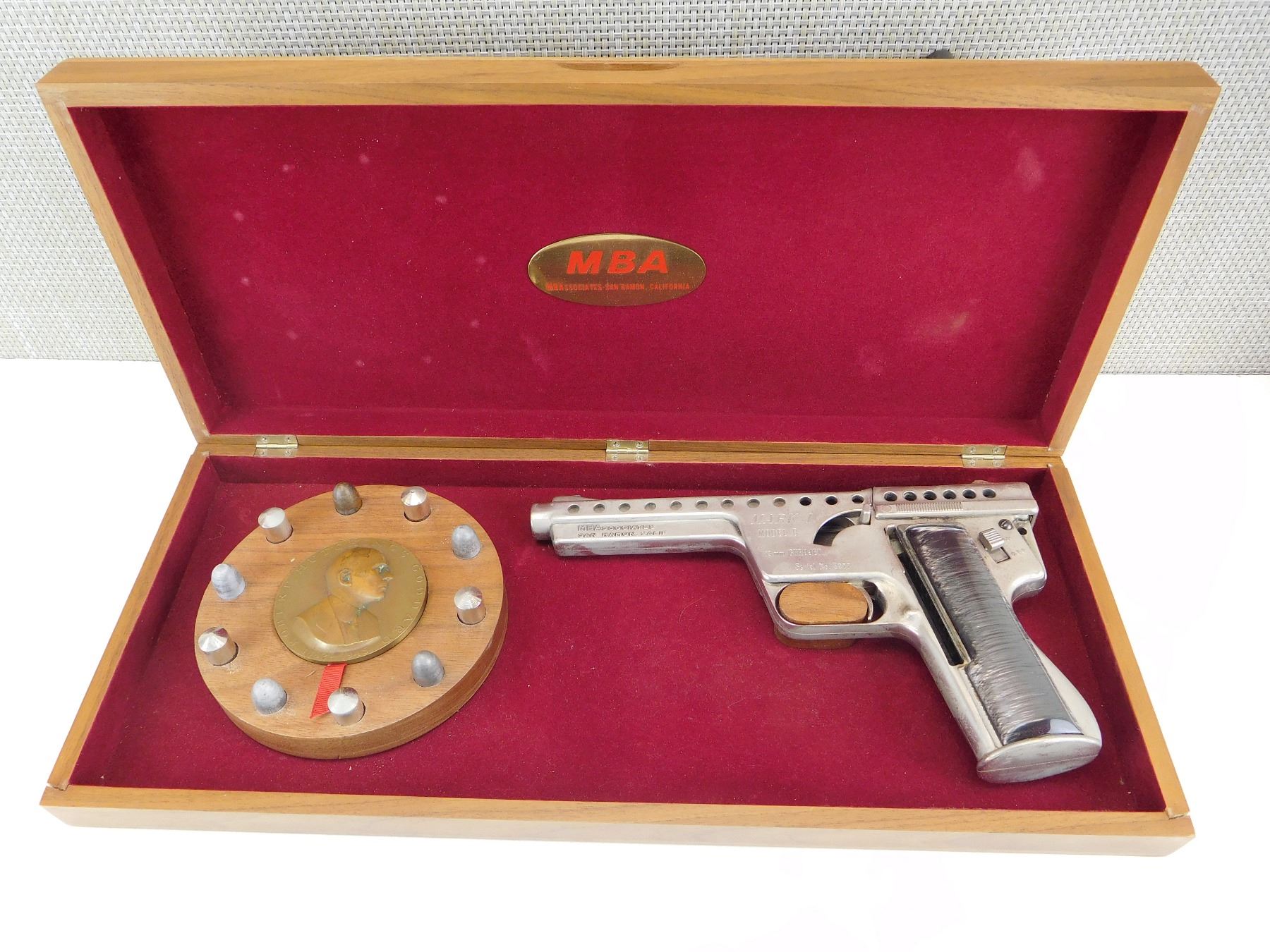 COMES WITH PRESENTATION CASE, 10 DUMMY ROUNDS IN CASE WITH MEDAL, THIS IS THE SUCCESSOR MODEL TO THE MARK 1. IT WAS INTRODUCED IN LATE 1965. 1000 PRESENTATION HANDGUNS WERE TO BE PRODUCED. CASED WITH 10 DUMMY ROUNDS AND A MEDAL TO ROCKET PIOINEER ROBERT GODDARD. THIS IS THE FIRST FRAME STYLE MARKING. APPRX 300 WERE MANUFACTURED WITH THIS STYLE. PRODUCTION DID NOT REACH 1000 WITH B500 BEING THE HIGHEST SERIAL NUMBER RECORDED IN GYROJET.NET SERIAL NUMBER CENSUS REPORT. THE ANTIQUE NICKEL FINISH HAS ANODIZED WITH AGE. SMOOTH BORE, ADJUSTABLE FRONT SIGHT AND RAISED V NOTCH REAR SIGHT , ACTION: ROCKET , BARREL LENGTH: 141MM , STOCK # R2513 , SERIAL # B277 , CONDITION: 9/10 , CLASS: CANADIAN RESTRICTED CLASS