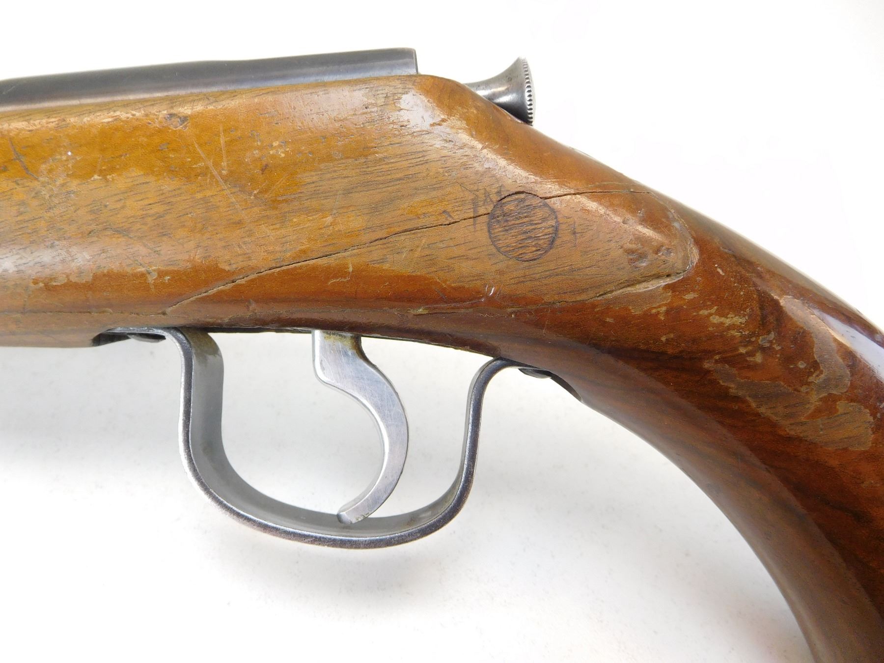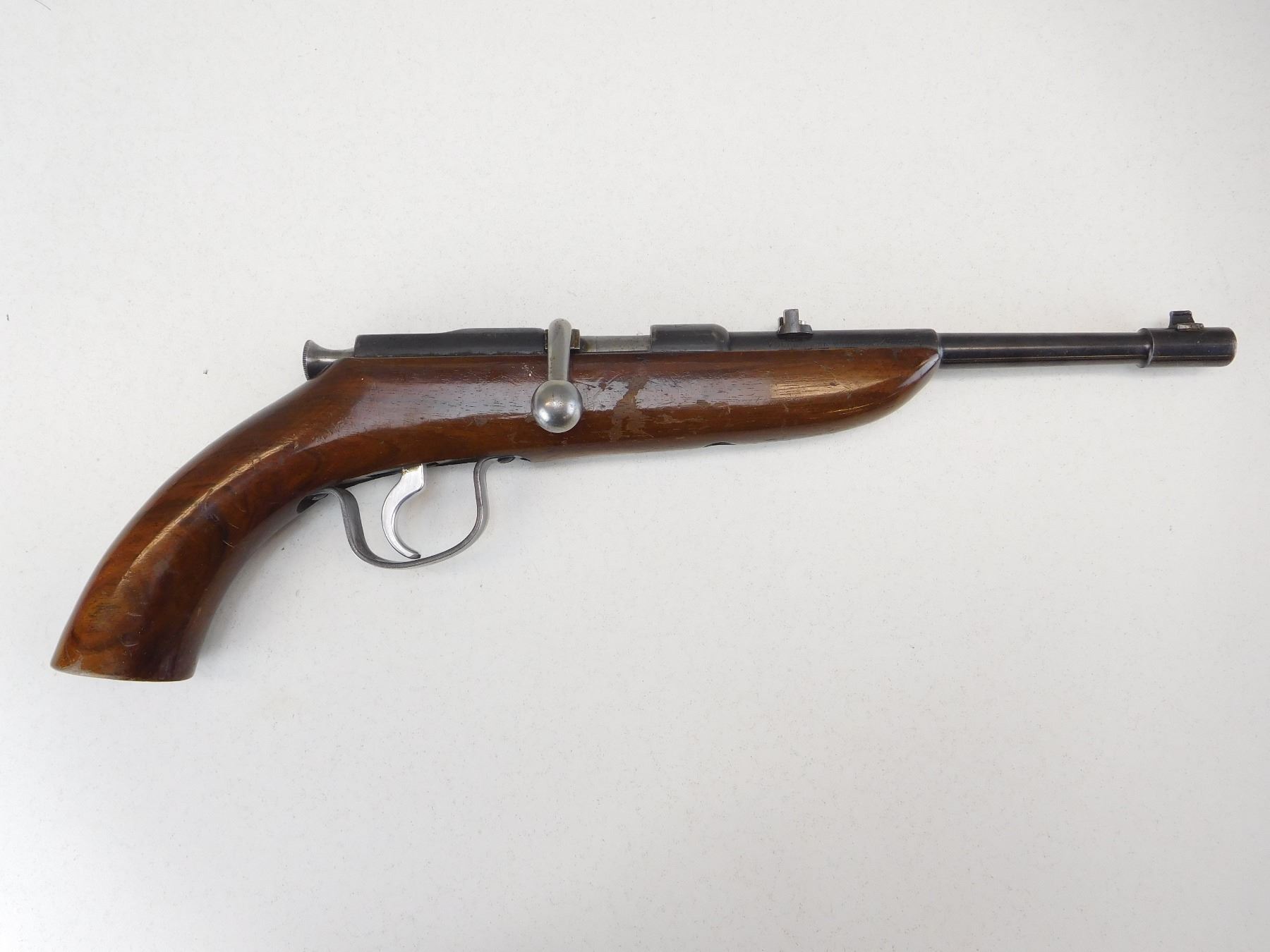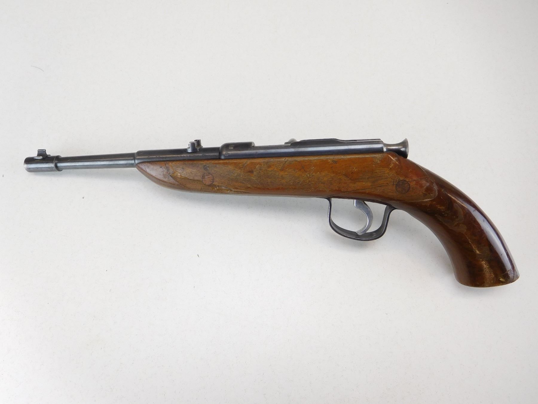 EXCELLENT BORE, STOCK IS CHIPPED AND REPAIRED, DOVETAIL FRONT AND ADJUSTABLE REAR SIGHT , ACTION: BOLT ACTION SINGLE SHOT HANDGUN , BARREL LENGTH: 198MM , STOCK # R2518 , SERIAL # 195903 , CONDITION: 6/10 , CLASS: CANADIAN RESTRICTED CLASS