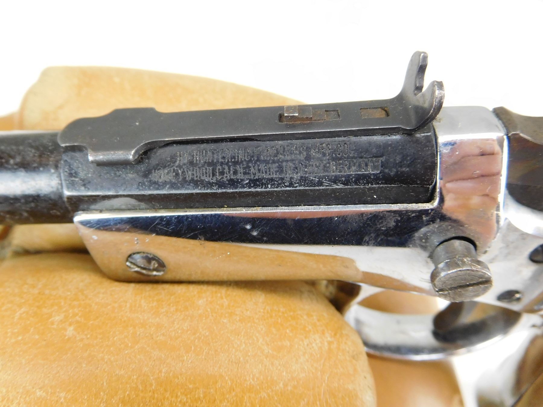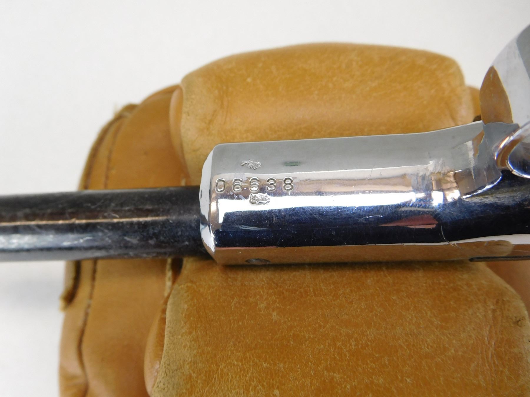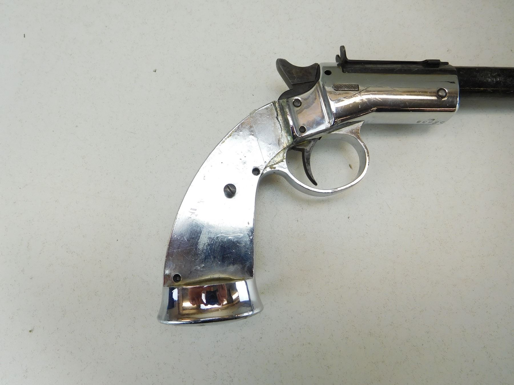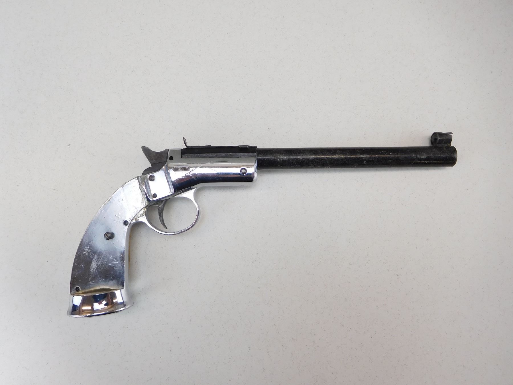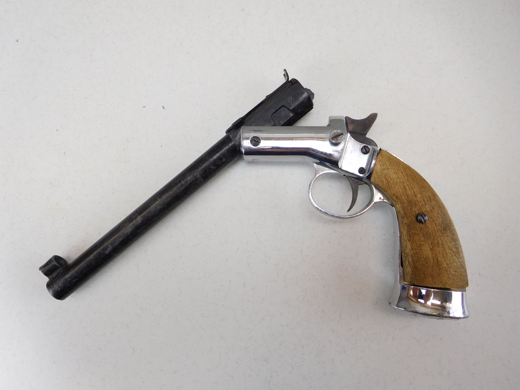 HOODED FRONT WHICH IS CRUSHED AND AN ADJUSTABLE REAR SIGHT, MISSING RIGHT GRIP PANEL, GOOD BORE , ACTION: SINGLE SHOT PISTOL , BARREL LENGTH: 203MM , STOCK # R2521 , SERIAL # 06638 , CONDITION: 4/10 , CLASS: CANADIAN RESTRICTED CLASS