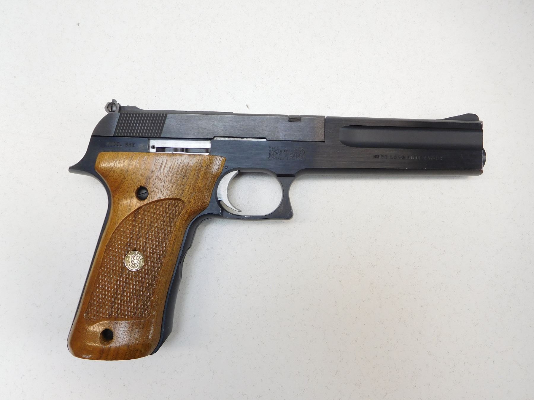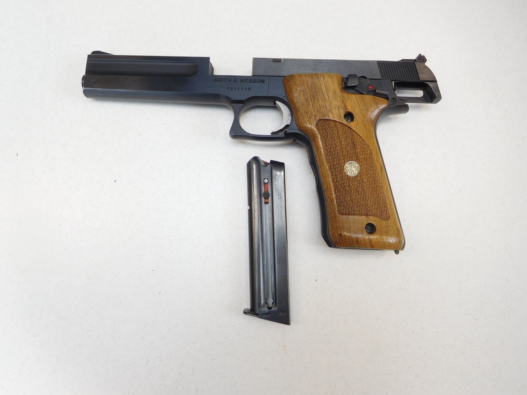 COMES WITH MAGAZINE, RAMP FRONT AND ADJUSTABLE REAR SIGHTS, VERY GOOD BORE, ORIGINAL SMITH & WESSON GRIPS , ACTION: SEMIAUTOMATIC HANDGUN , BARREL LENGTH: 152MM , STOCK # R2527 , SERIAL # TBV6259 , CONDITION: 9/10 , CLASS: CANADIAN RESTRICTED CLASS