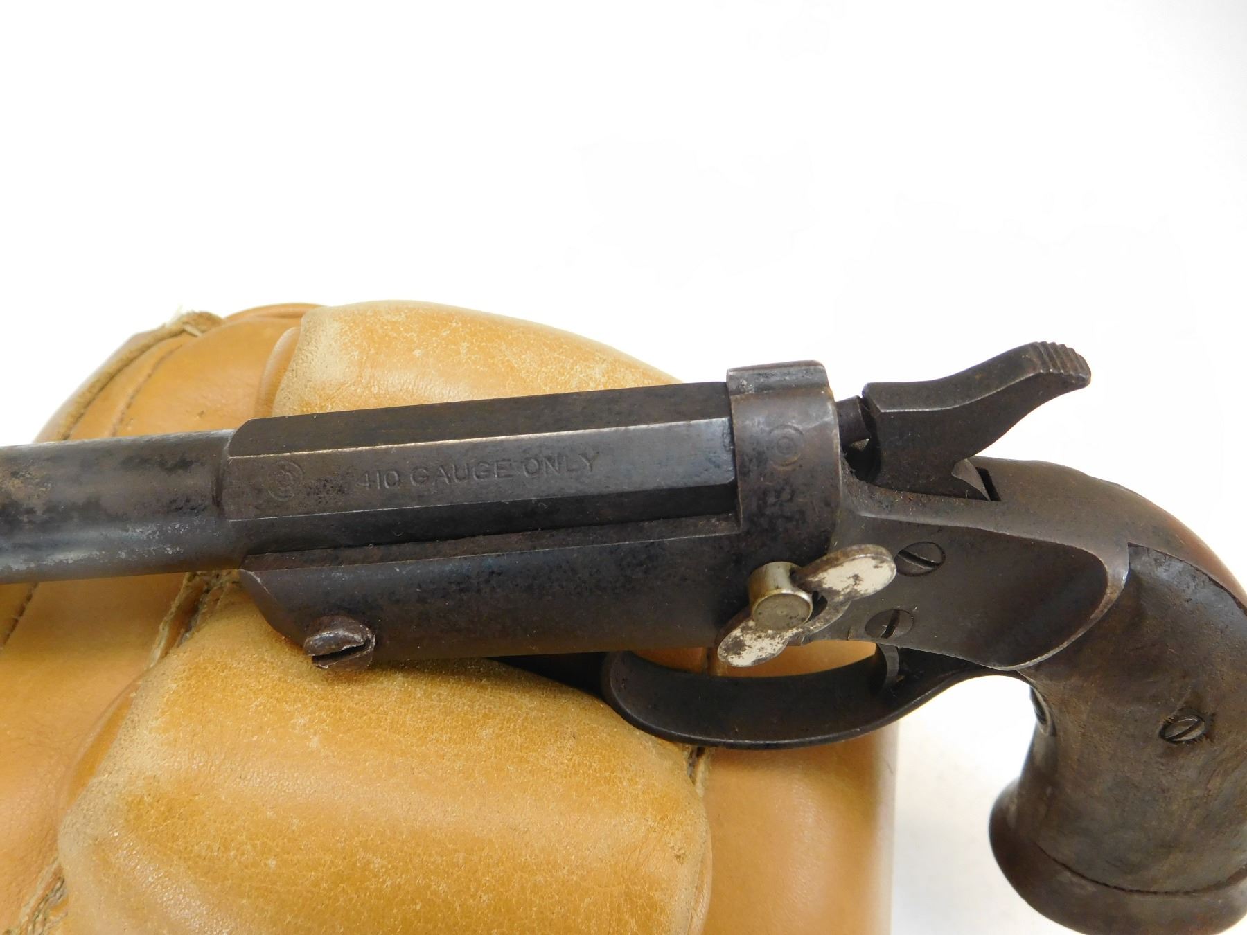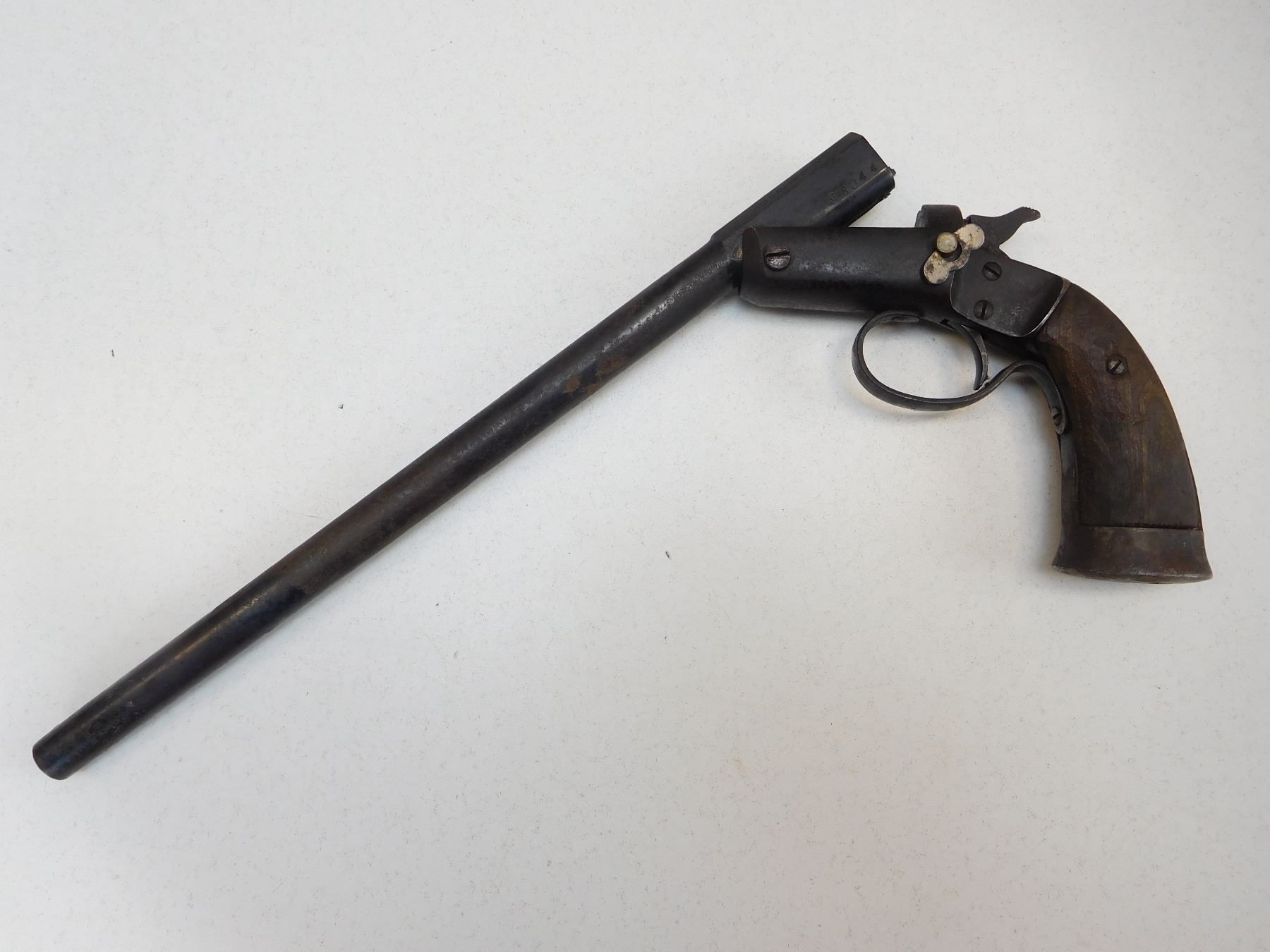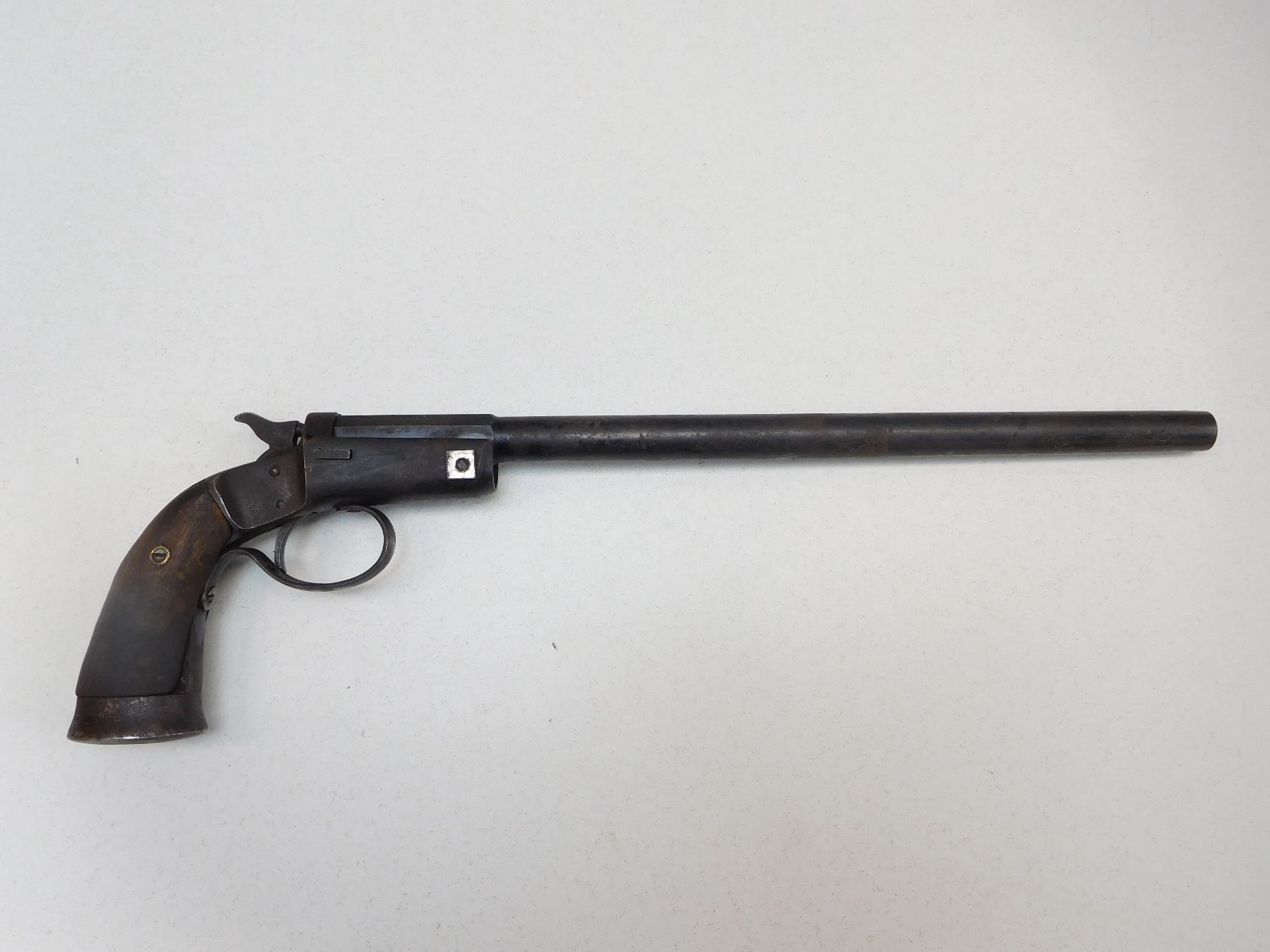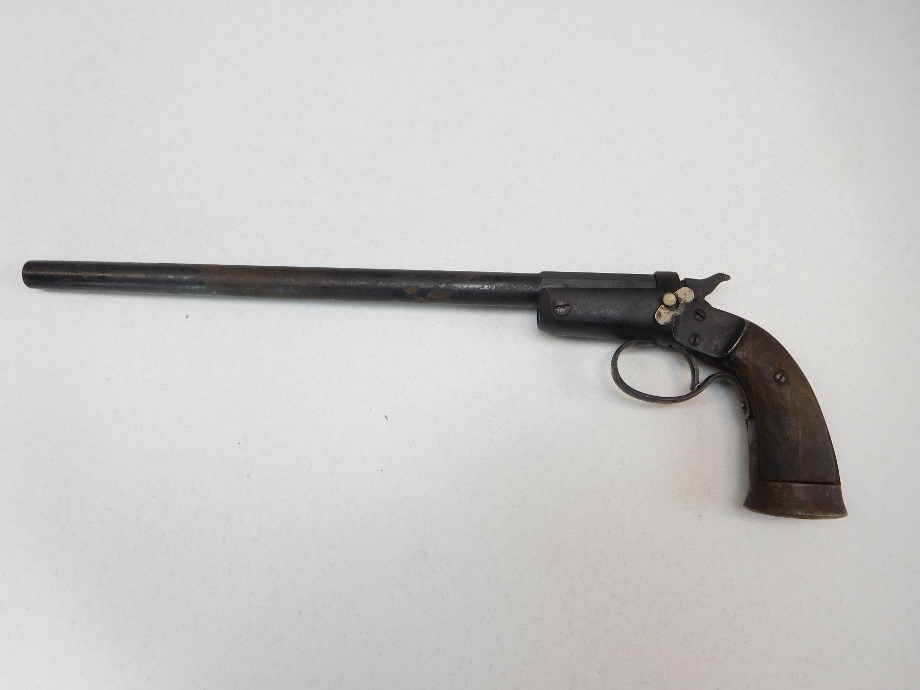 MISSING THE BEAD FRONT SIGHT, NO REAR SIGHT, REPLACED HINGE SCREW, REPLACED AND CRACKED GRIPS, OVERALL RUSTY PATINA , ACTION: SINGLE SHOT BREAK ACTION PISTOL , BARREL LENGTH: 311MM , STOCK # R2528 , SERIAL # 8044 , CONDITION: 3/10 , CLASS: CANADIAN RESTRICTED CLASS
