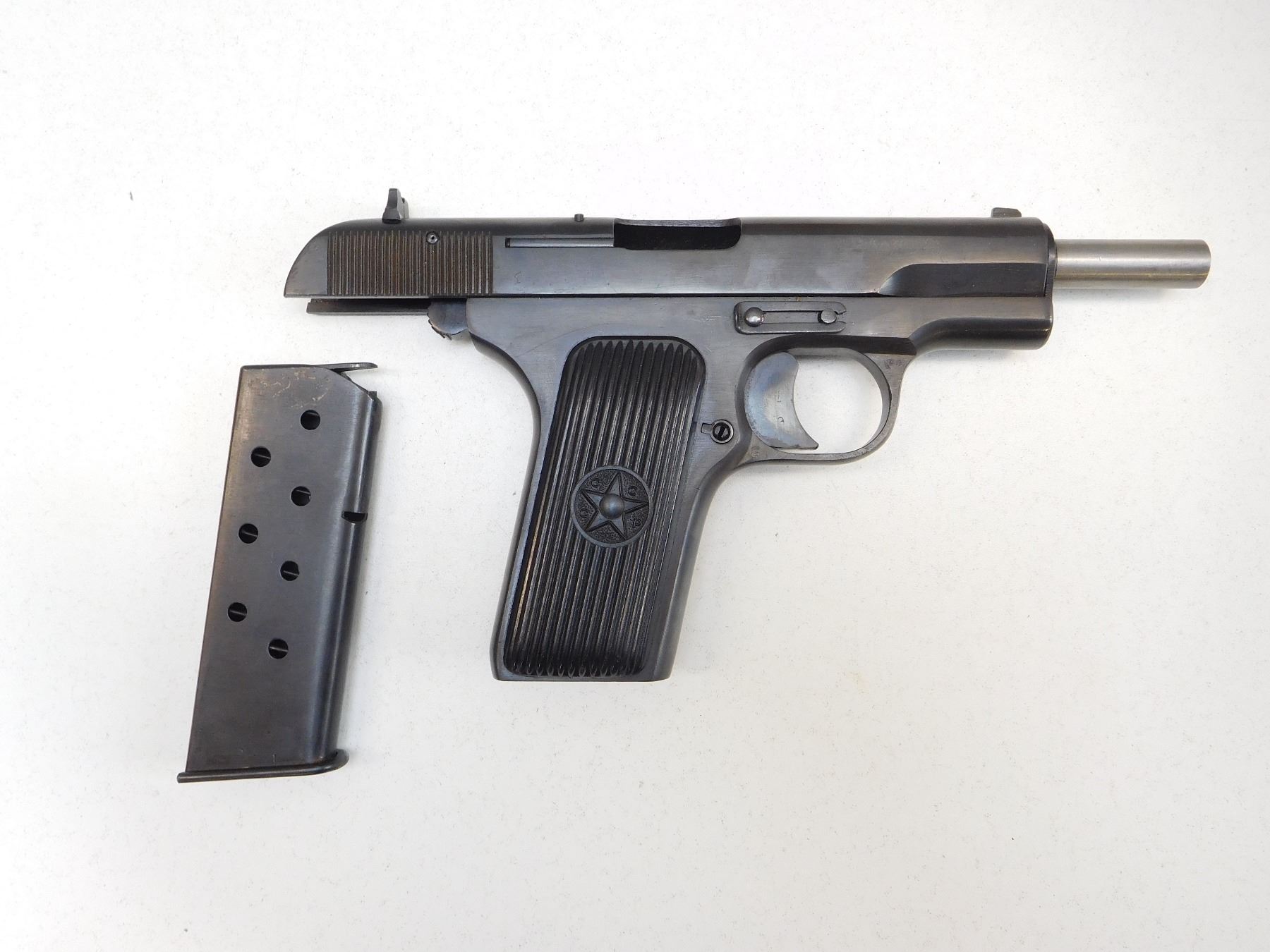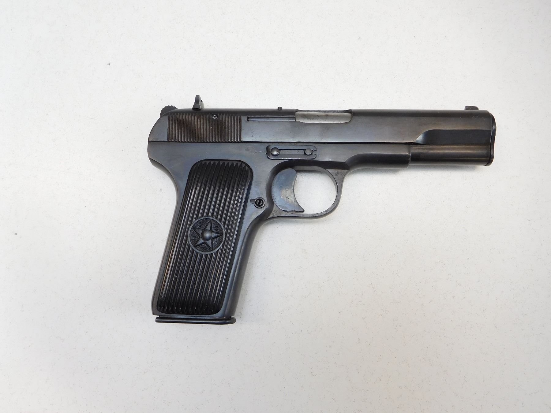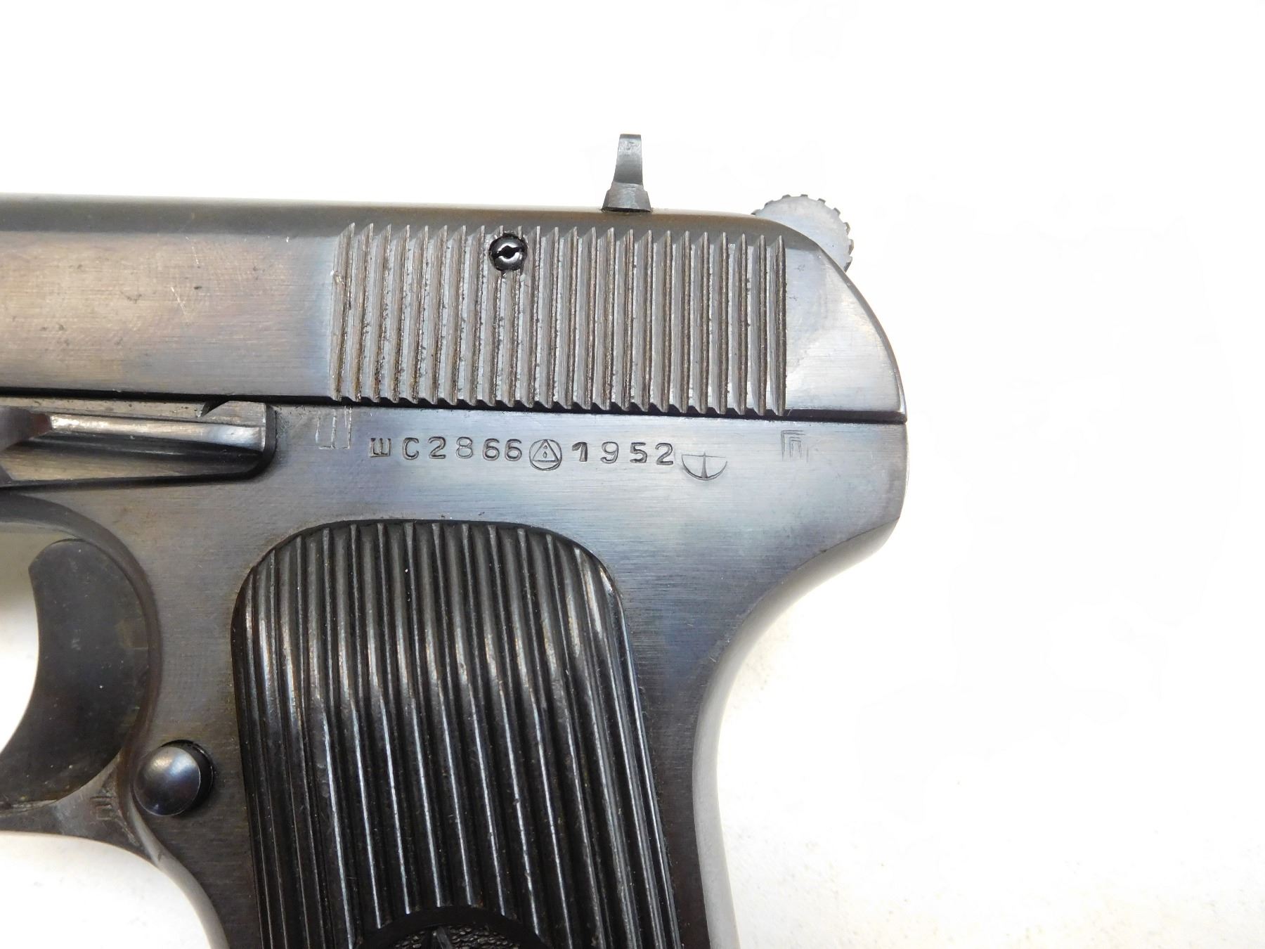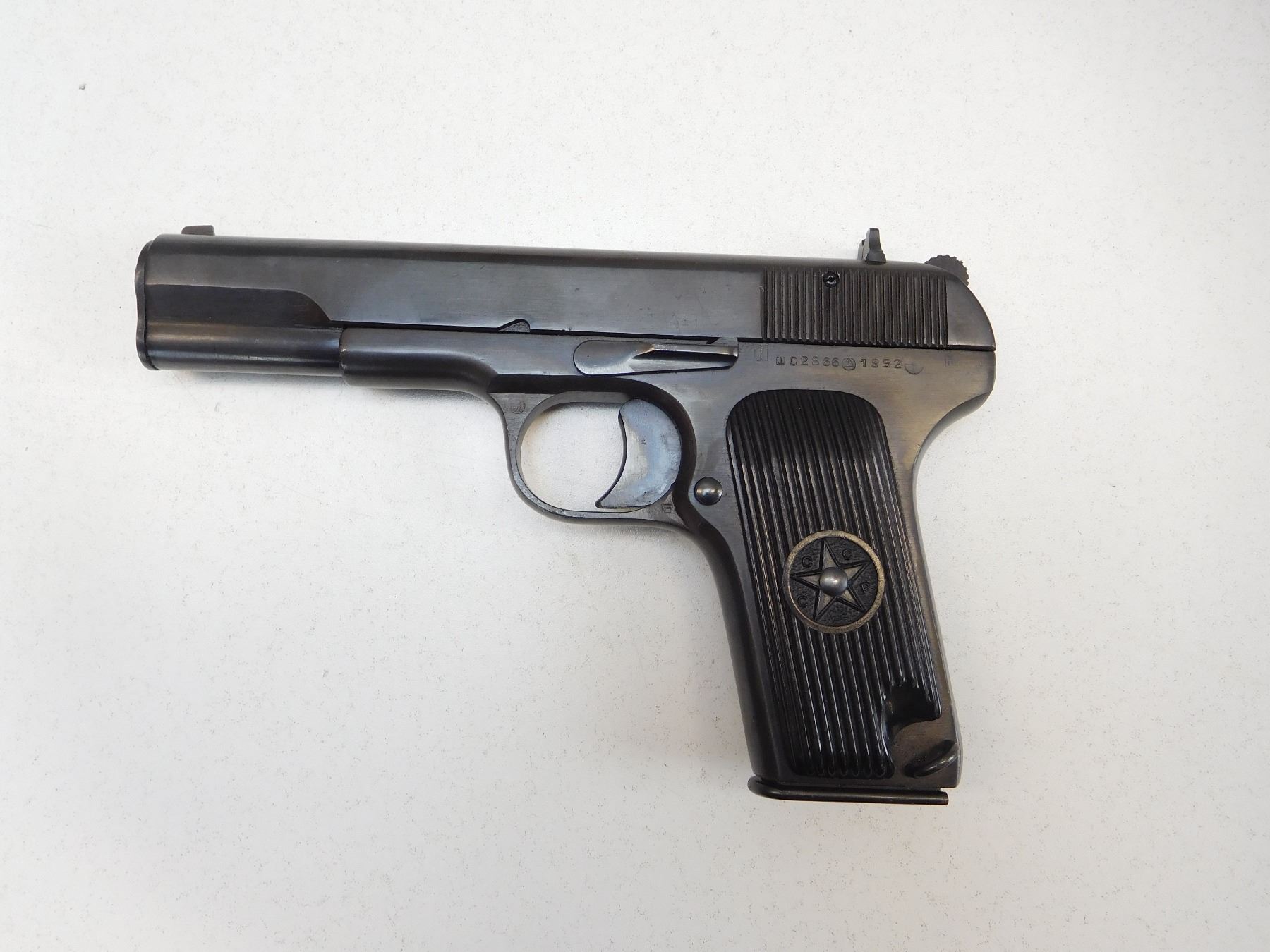 COMES WITH MAGAZINE, MANUFACTURED IN 1952, HAS A SAFETY, ORIGINAL CCCP HARD PLASTIC GRIPS, BLADE FRONT AND RAISED NOTCH REAR SIGHTS, BORE IS DARK , ACTION: SEMIAUTOMATIC HANDGUN , BARREL LENGTH: 115MM , STOCK # R2530 , SERIAL # 2866 , CONDITION: 8/10 , CLASS: CANADIAN RESTRICTED CLASS