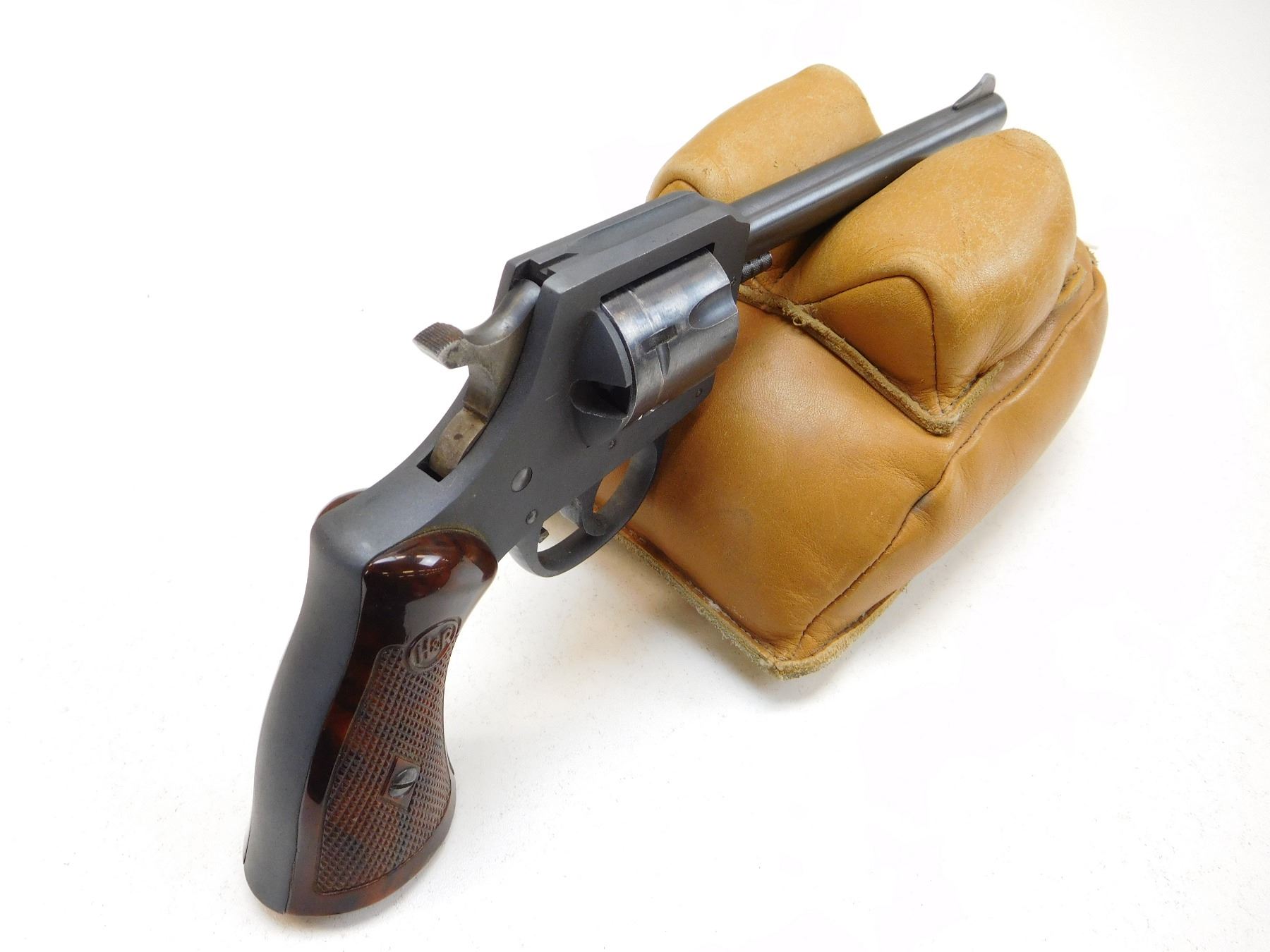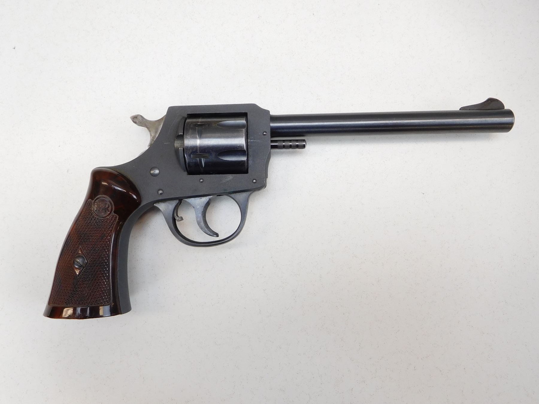 PARKERIZED RECEIVER AND BLUE BARREL, BLADE FRONT AND GROOVED RECEIVER MOUNTED REAR SIGHT, BORE IS VERY GOOD, ORIGINAL H&R BROWN HARD PLASTIC GRIPS , ACTION: REVOLVER , BARREL LENGTH: 152MM , STOCK # R2533 , SERIAL # U2749 , CONDITION: 6/10 , CLASS: CANADIAN RESTRICTED CLASS