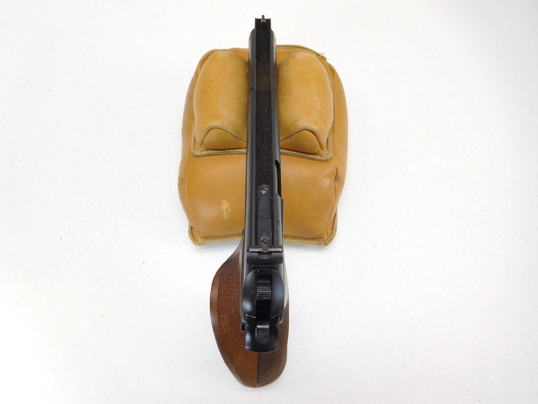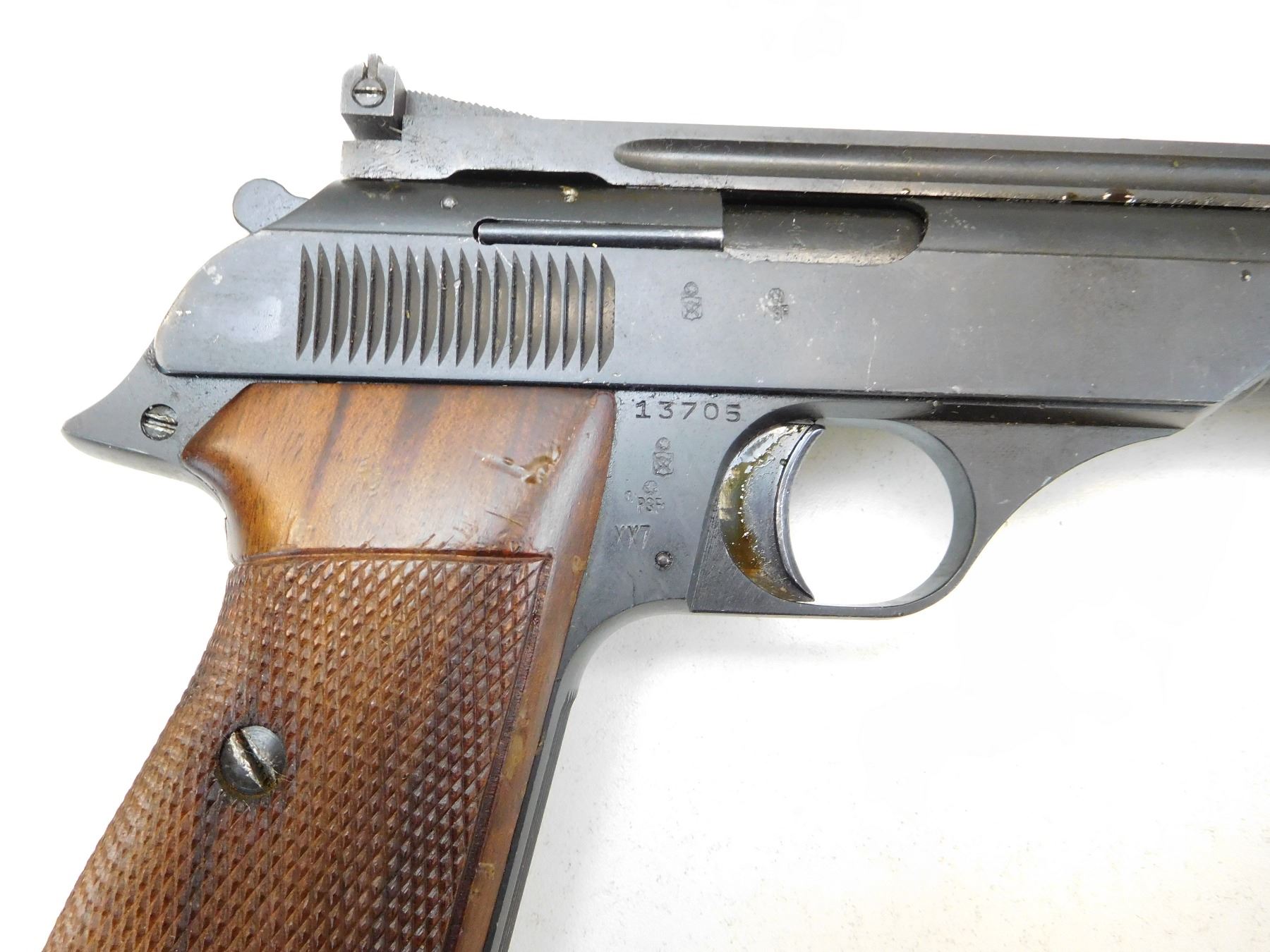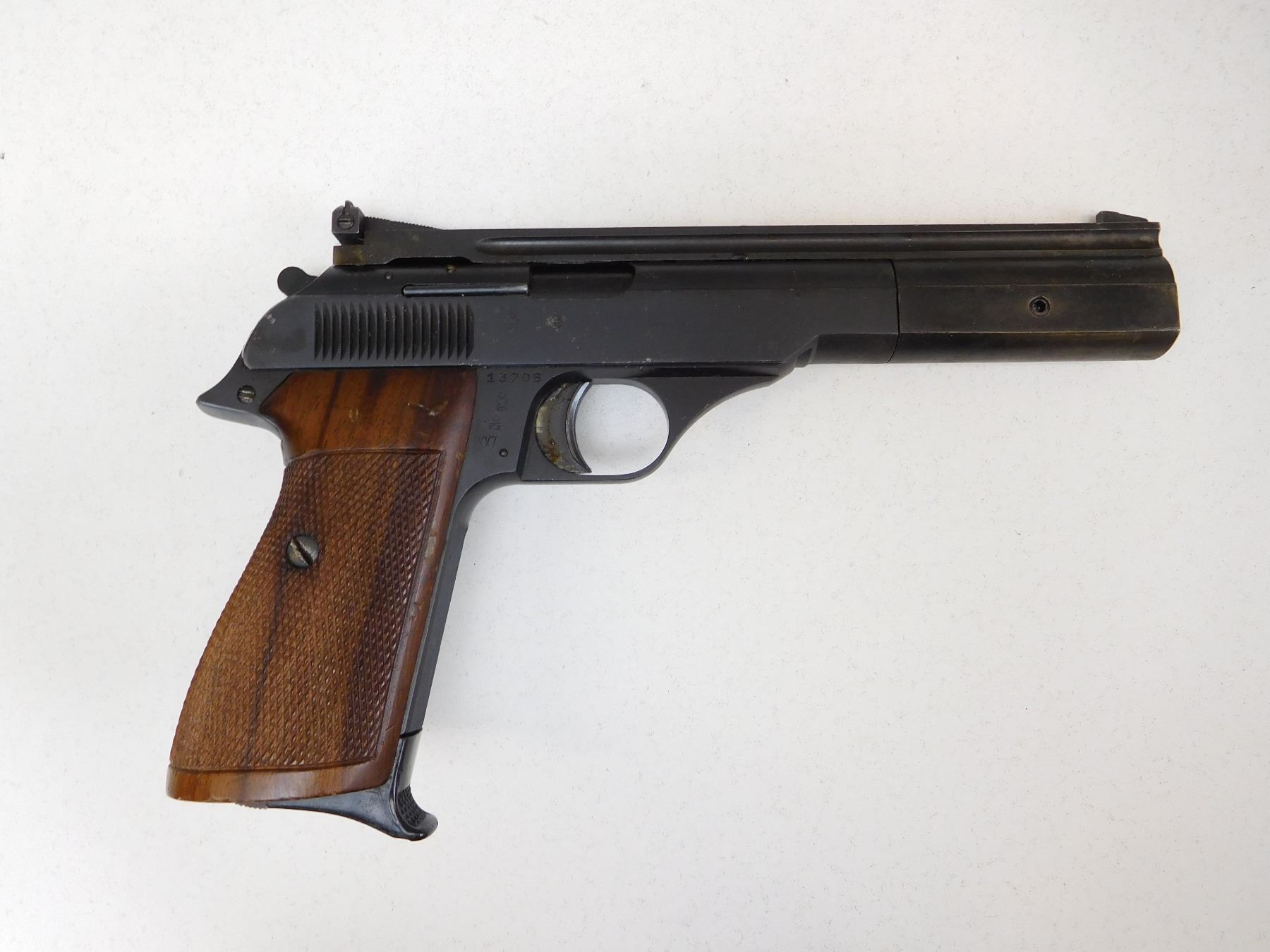COMES WITH MAGAZINE, BLADE FRONT AND ADJUSTABLE REAR SIGHTS, CHECKERED WOODEN GRIPS WITH THUMB REST, GOOD BORE , ACTION: SEMIAUTOMATIC HANDGUN , BARREL LENGTH: 124MM , STOCK # R2537 , SERIAL # 113705 , CONDITION: 7/10 , CLASS: CANADIAN RESTRICTED CLASS