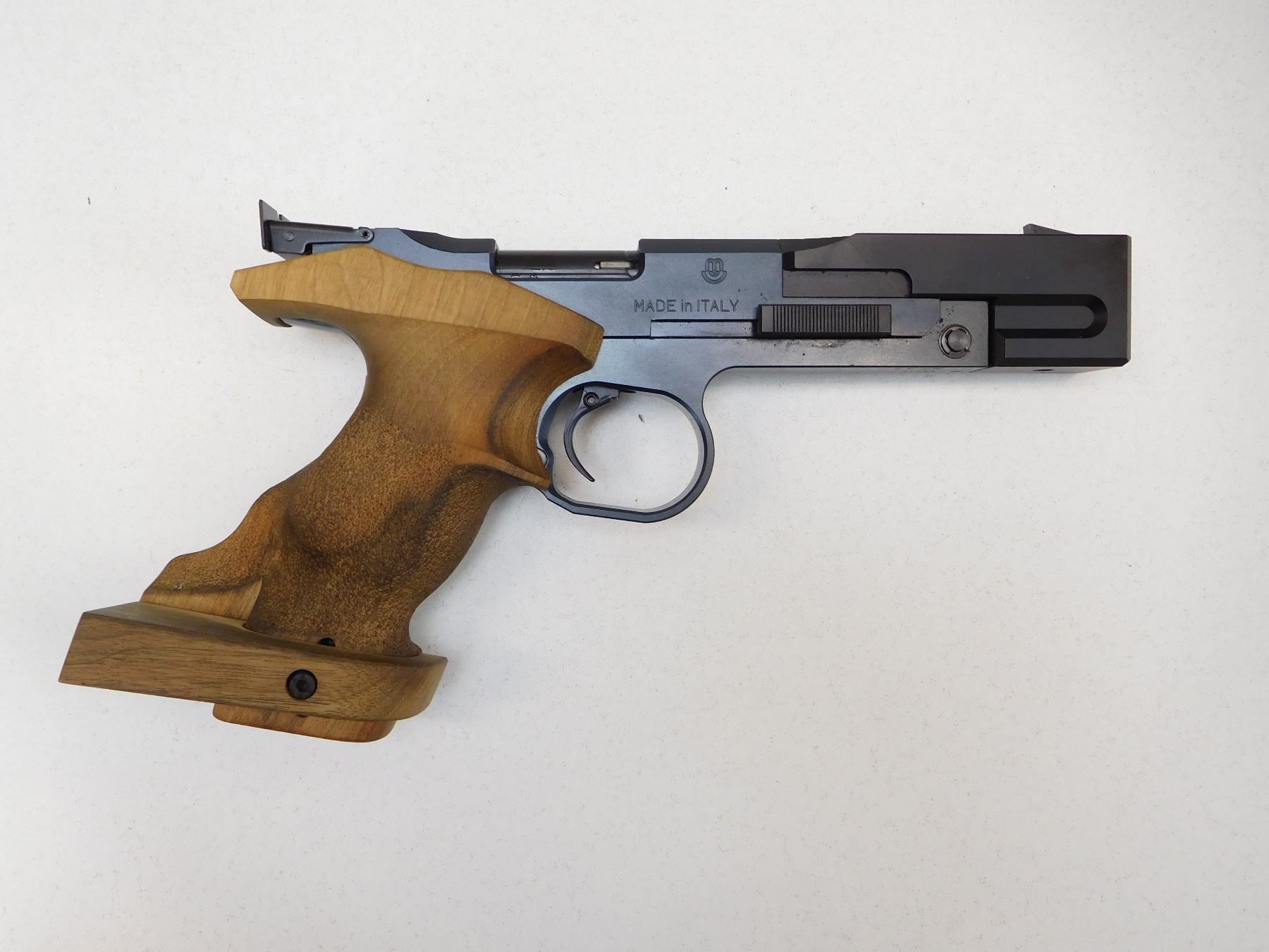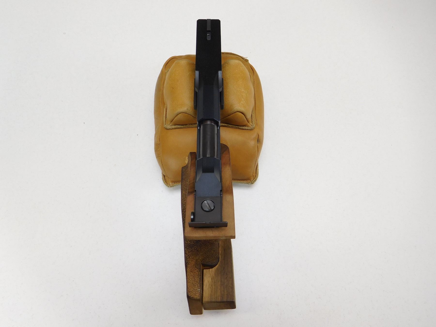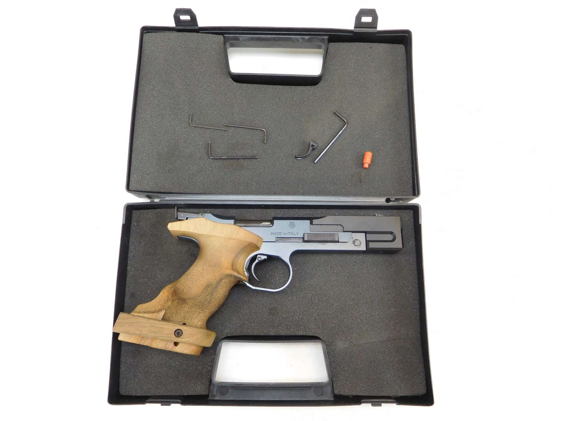 COMES WITH CASE AND MAGAZINE, WOOD ERGONOMIC ADJUSTABLE GRIPS, BORE IS EXCELLENT, BLADE FRONT AND FULLY ADJUSTABLE REAR SIGHTS , ACTION: SEMIAUTOMATIC HANDGUN , BARREL LENGTH: 144MM , STOCK # R2540 , SERIAL # 13417 , CONDITION: 8/10 , CLASS: CANADIAN RESTRICTED CLASS