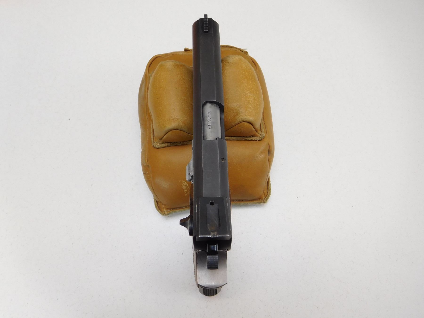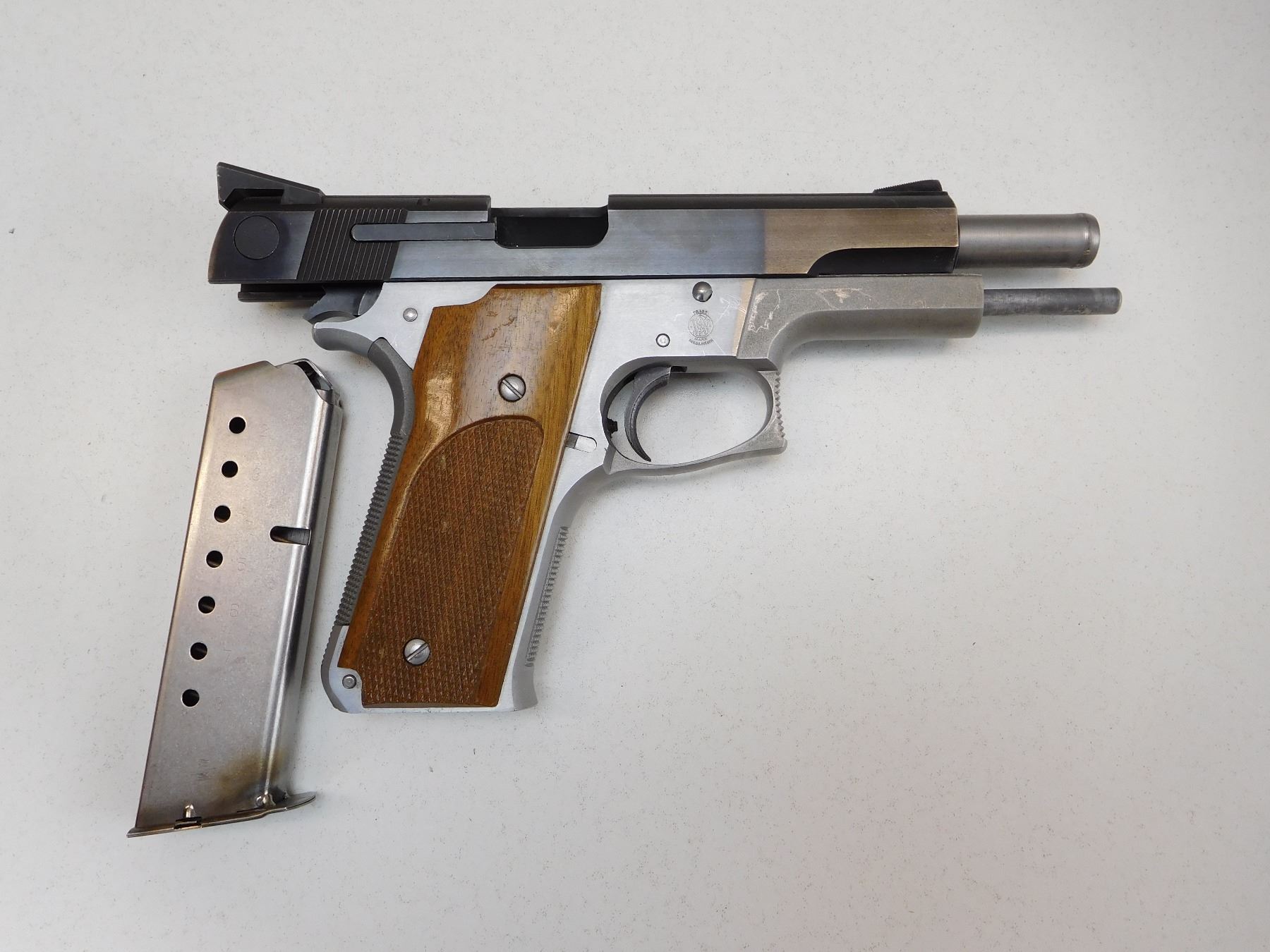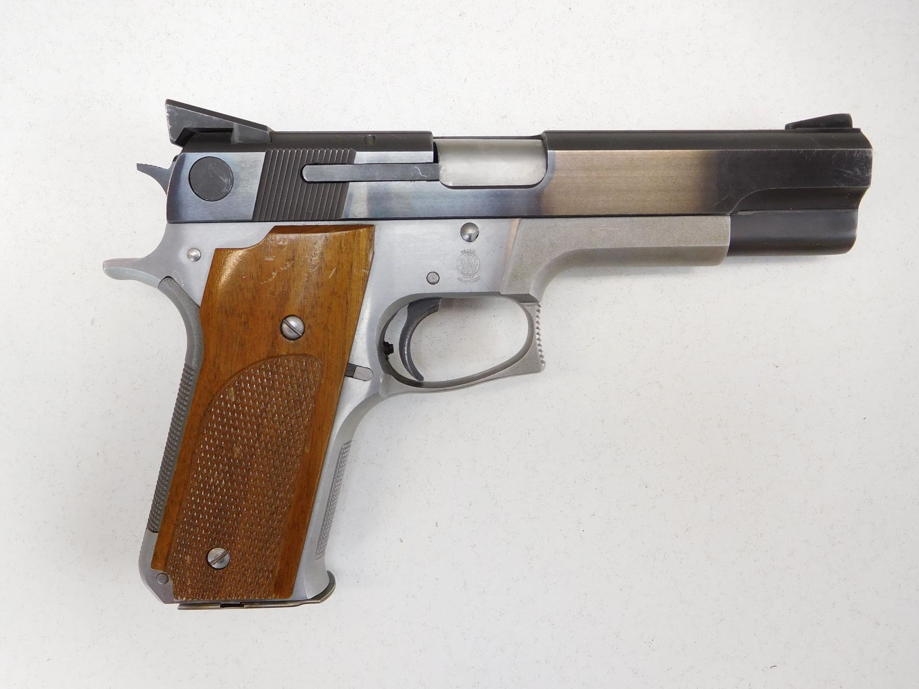 COMES WITH MAGAZINE, CHECKERED HARDWOOD GRIPS, BLADE FRONT AND DRIFT ADJUSTABLE REAR SIGHT, STIPPLED FRONT AND REAR GRIP STRAP, STAINLESS STEEL RECEIVER AND BLUED SLIDE, EXCELLENT BORE , ACTION: SEMIAUTOMATIC HANDGUN , BARREL LENGTH: 121MM , STOCK # R2552 , SERIAL # TMB1561 , CONDITION: 8/10 , CLASS: CANADIAN RESTRICTED CLASS
